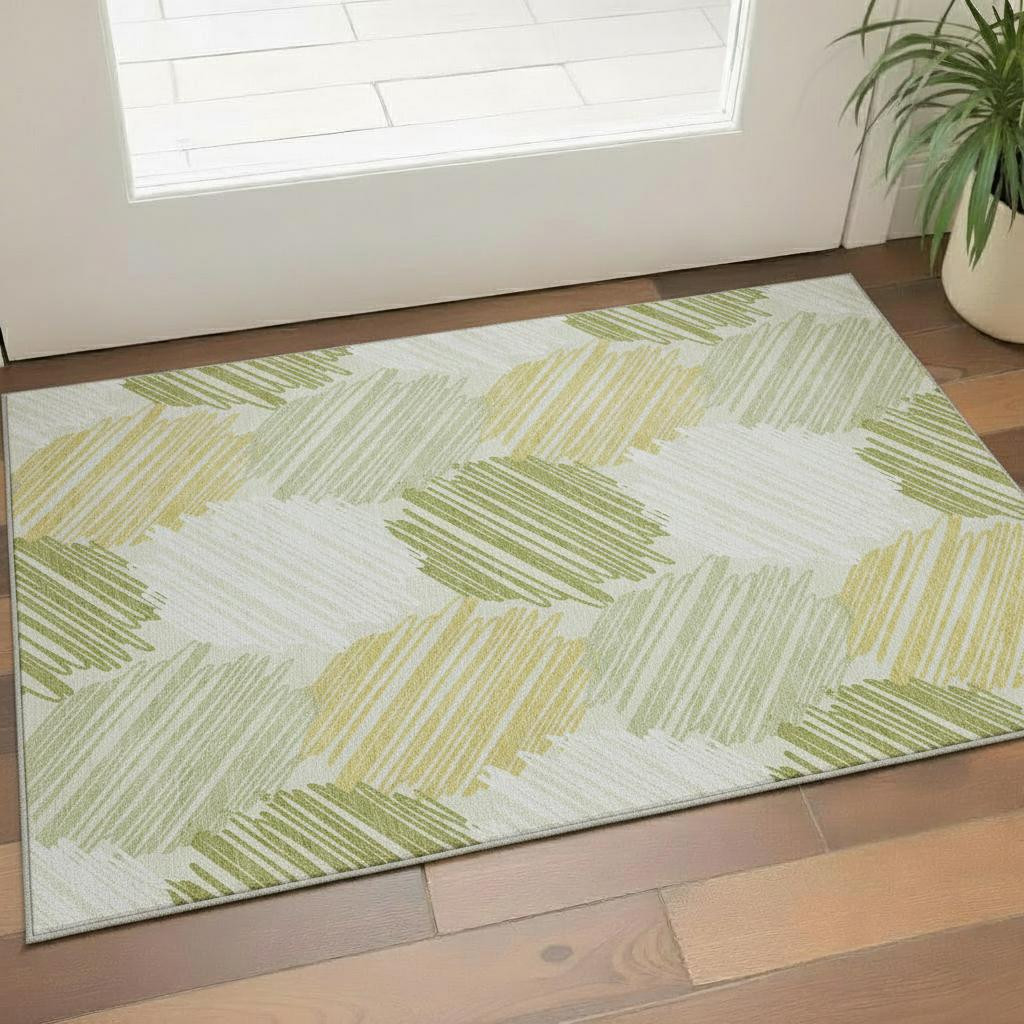 Set an inviting tone in your space with this 3-foot x 5-foot green ivory and gray geometric washable area rug with uv protection. Ideal for spaces with kids and pets, this rug is stain resistant to help repel dirt and spilled liquids. Built to last, this rug crafted from polyester fibers is known for its durability and long lasting appeal. Rugs are a great way to showcase your style, hide imperfections, warm your home and reduce noise. This smaller sized, transitional styled rug is just what you need for your walkway, bedside, in front of door, cabinet, refrigerator, or chair. 36.00-inch h x 60.00-inch w x 0.39-inch d.