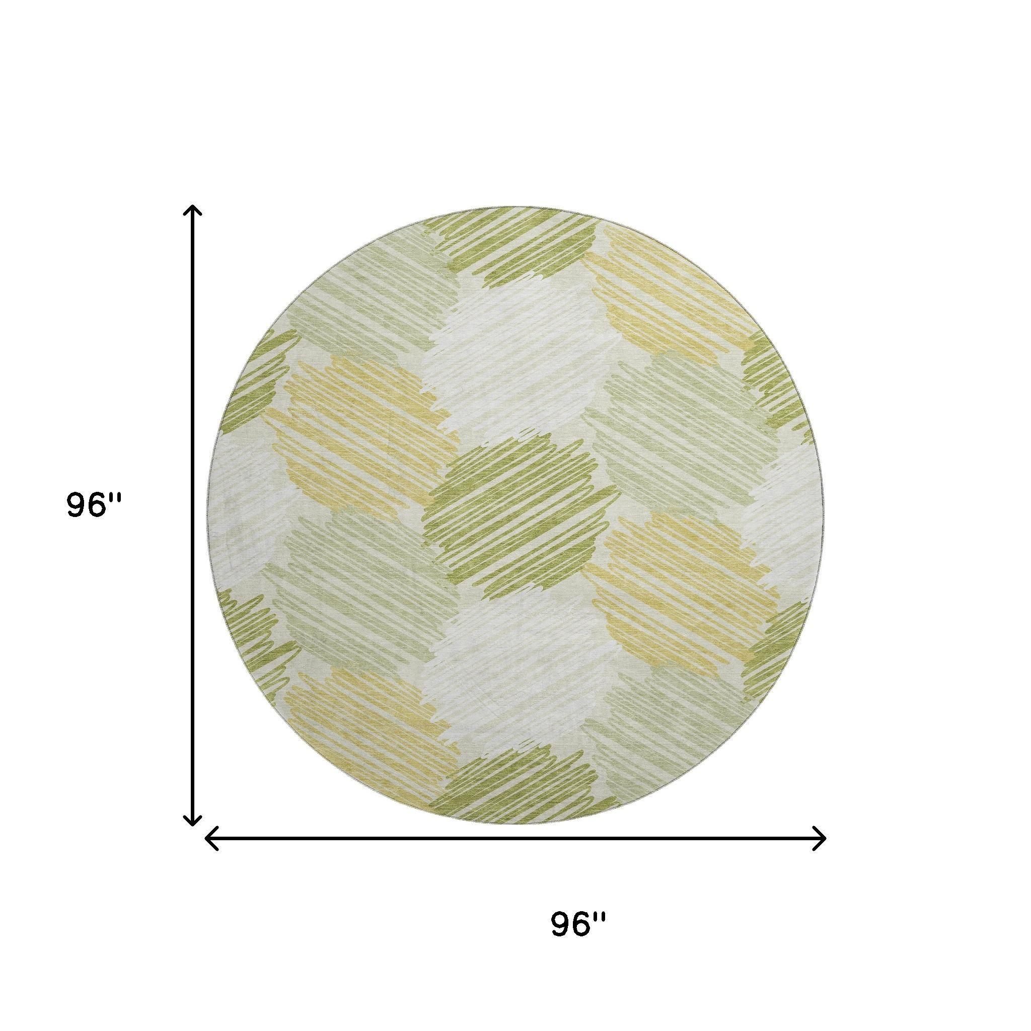 This 8-foot green ivory and gray geometric washable round rug with uv protection, is a great way to add warmth to a room. Ideal for spaces with kids and pets, this rug is stain resistant to help repel dirt and spilled liquids. Built to last, this rug crafted from polyester fibers is known for its durability and long lasting appeal. Rugs are a great way to showcase your style, hide imperfections, warm your home and reduce noise. This larger sized, transitional styled rug is ready to create a focal point or statement piece in your room. 96.00-inch h x 96.00-inch w x 0.39-inch d.