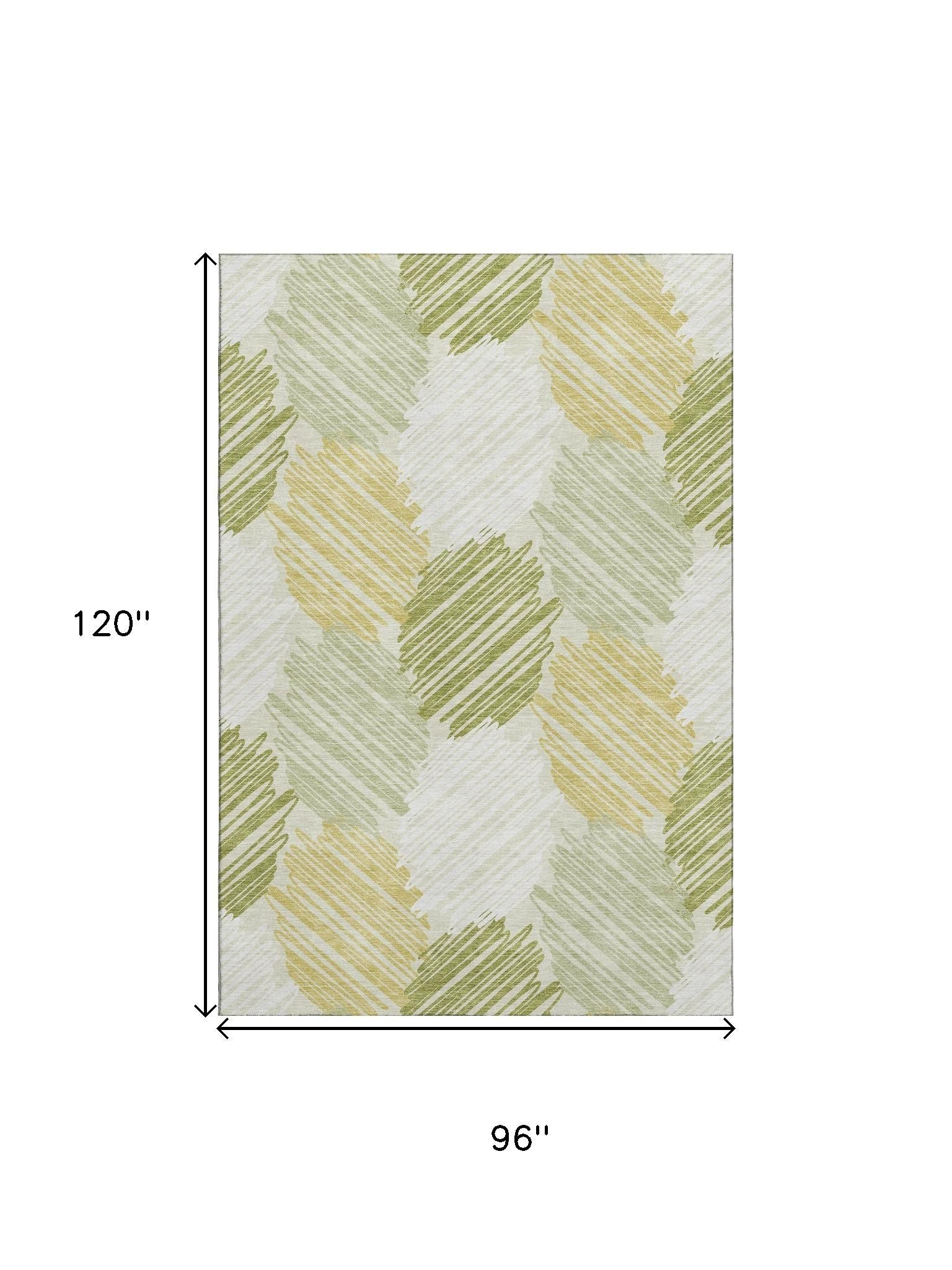 This 8-foot x 10-foot green ivory and gray geometric washable area rug with uv protection, is a great way to add warmth to a room. Ideal for spaces with kids and pets, this rug is stain resistant to help repel dirt and spilled liquids. Built to last, this rug crafted from polyester fibers is known for its durability and long lasting appeal. Rugs are a great way to showcase your style, hide imperfections, warm your home and reduce noise. This larger sized, transitional styled rug is ready to create a focal point or statement piece in your room. 96.00-inch h x 120.00-inch w x 0.39-inch d.
