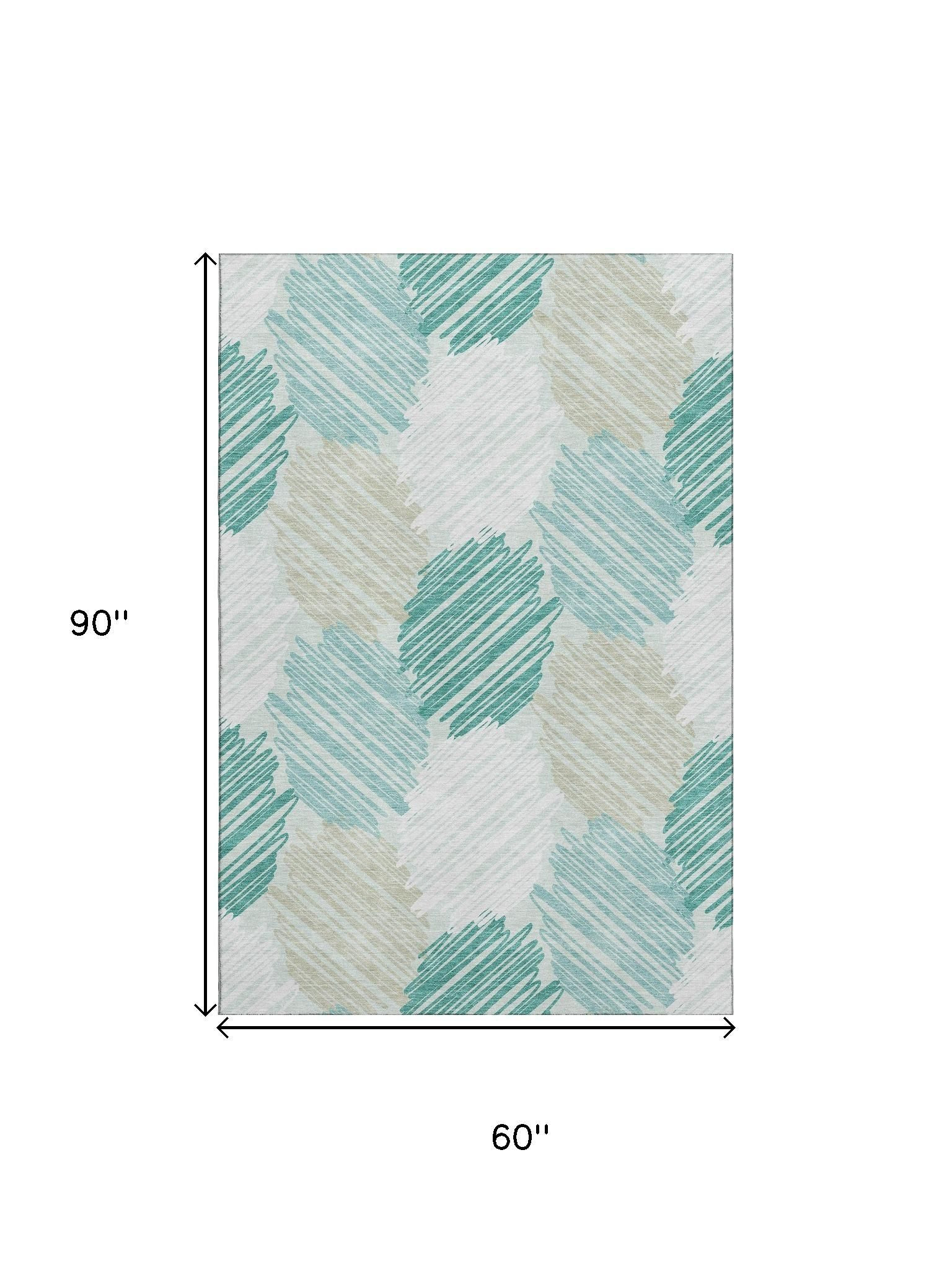 This 5-foot x 8-foot teal ivory and gray geometric washable area rug with uv protection, is a great way to add warmth to a room. Ideal for spaces with kids and pets, this rug is stain resistant to help repel dirt and spilled liquids. Built to last, this rug crafted from polyester fibers is known for its durability and long lasting appeal. Rugs are a great way to showcase your style, hide imperfections, warm your home and reduce noise. This larger sized, transitional styled rug is ready to create a focal point or statement piece in your room. 60.00-inch h x 90.00-inch w x 0.39-inch d.