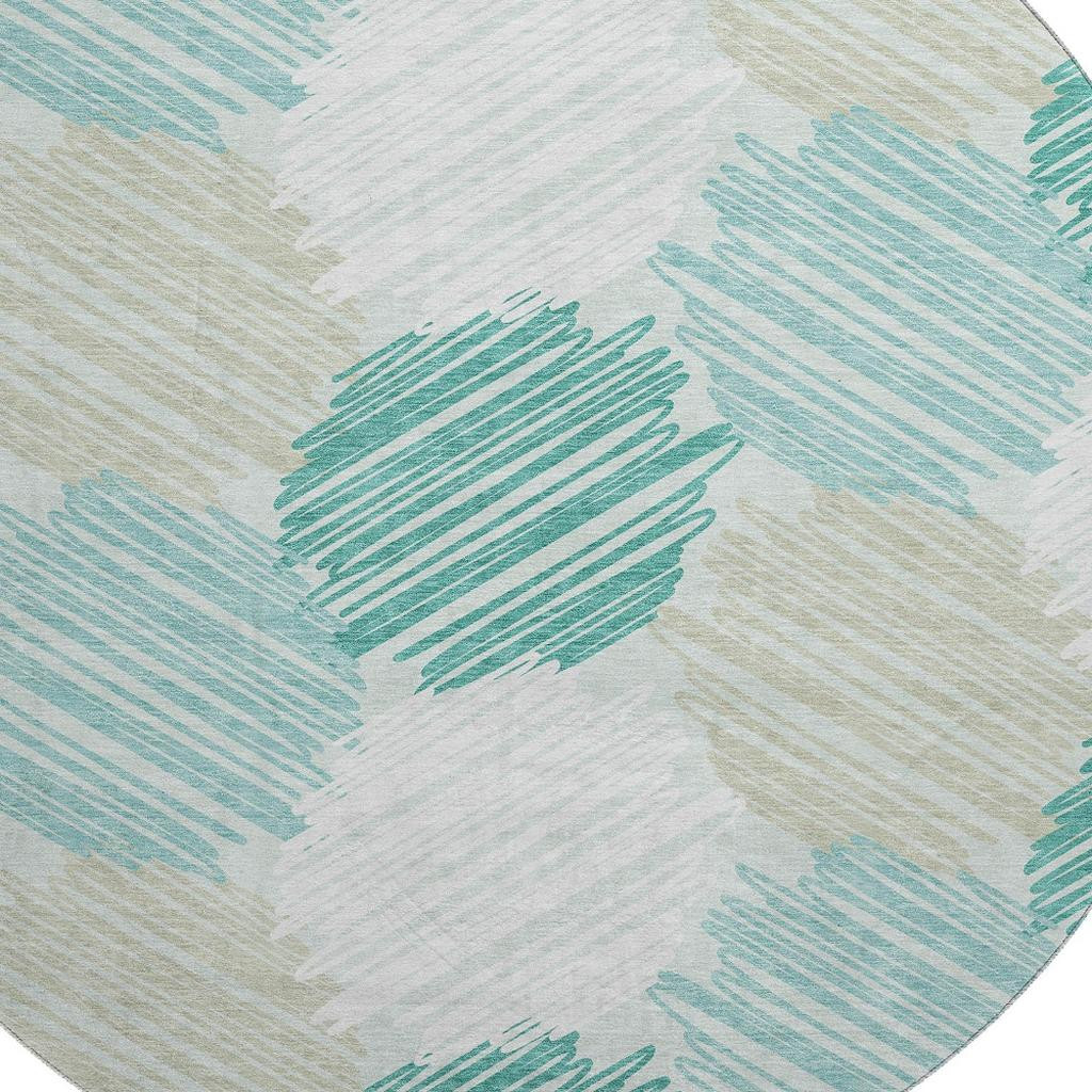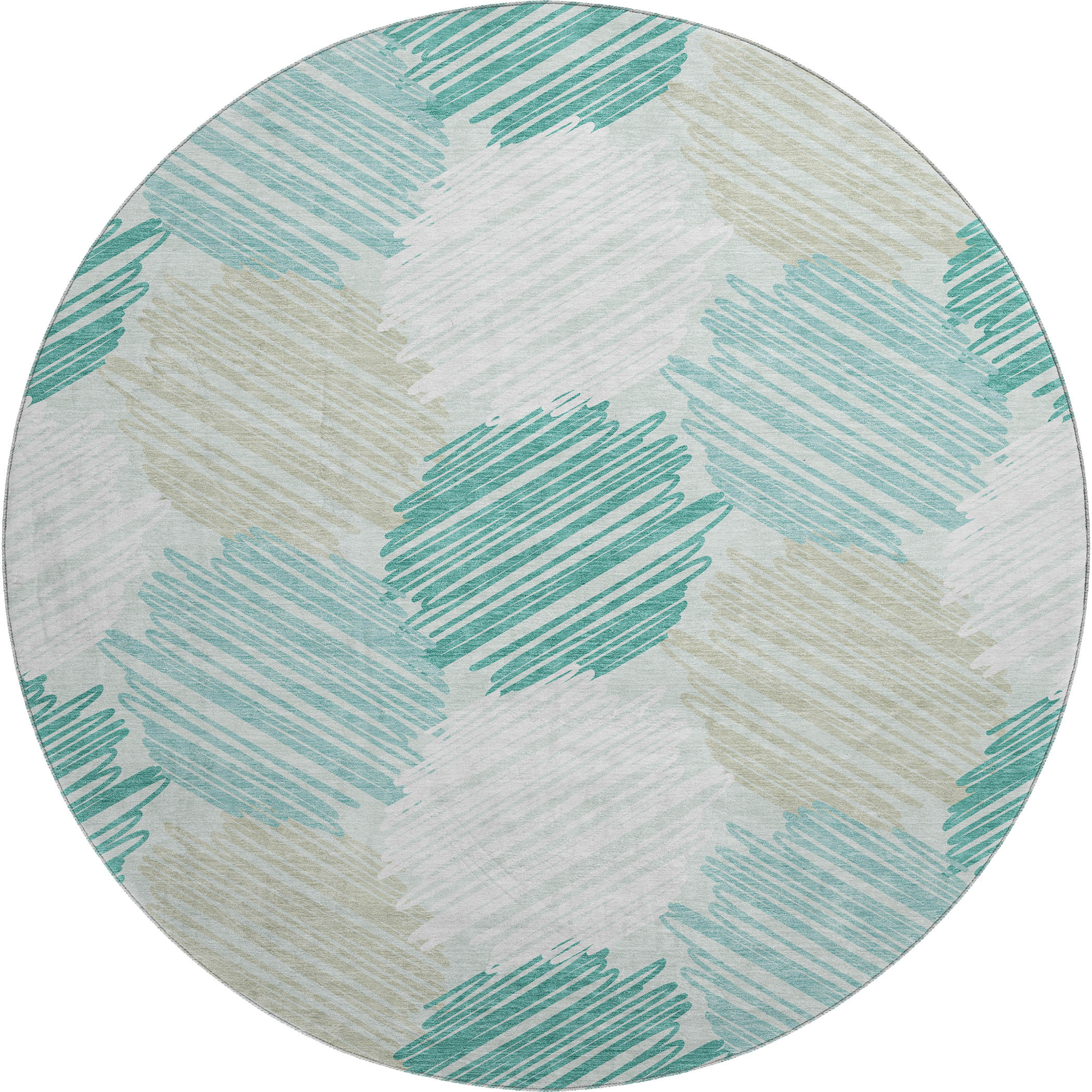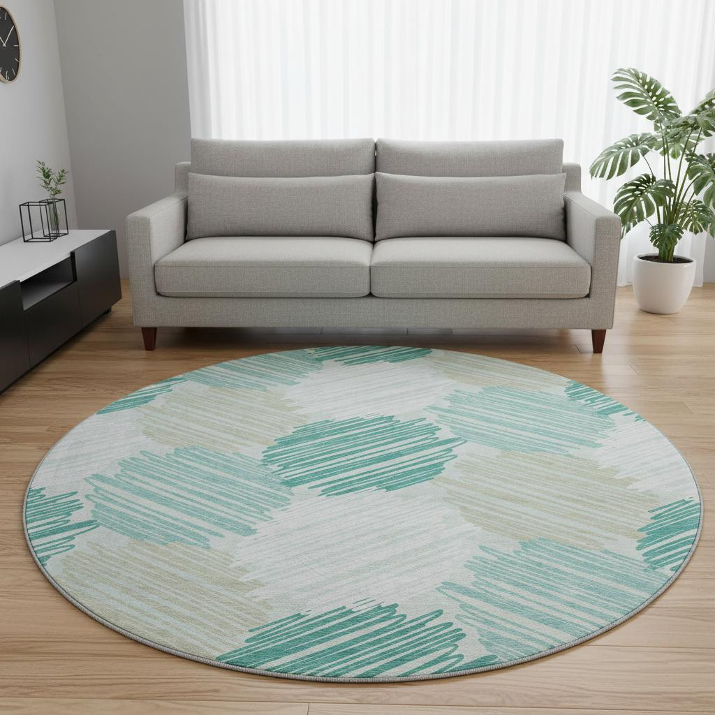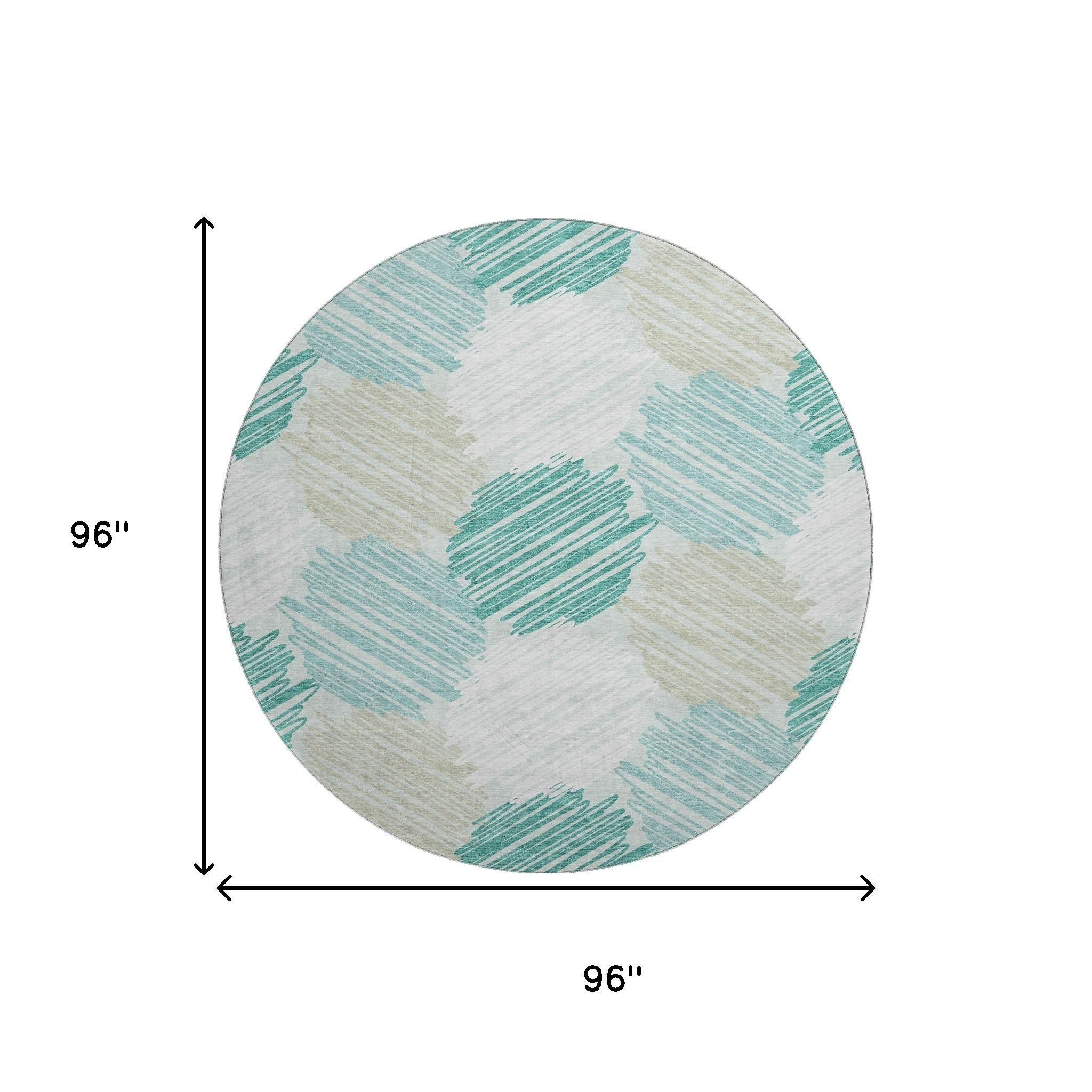 Add great coloration and comfortable texture to your space with this 8-foot teal ivory and gray geometric washable round rug with uv protection. Ideal for spaces with kids and pets, this rug is stain resistant to help repel dirt and spilled liquids. Built to last, this rug crafted from polyester fibers is known for its durability and long lasting appeal. Rugs are a great way to showcase your style, hide imperfections, warm your home and reduce noise. This larger sized, transitional styled rug is ready to create a focal point or statement piece in your room. 96.00-inch h x 96.00-inch w x 0.39-inch d.