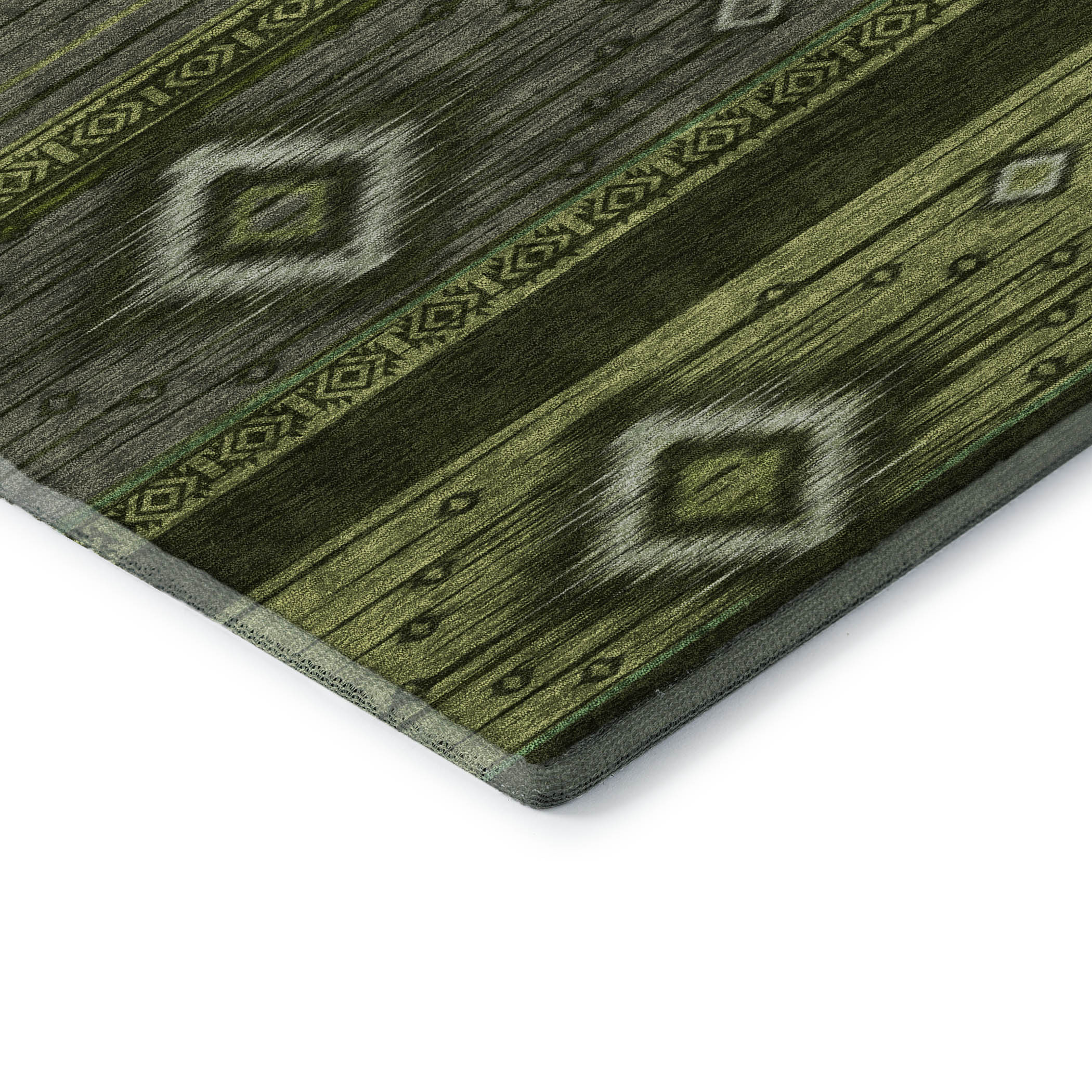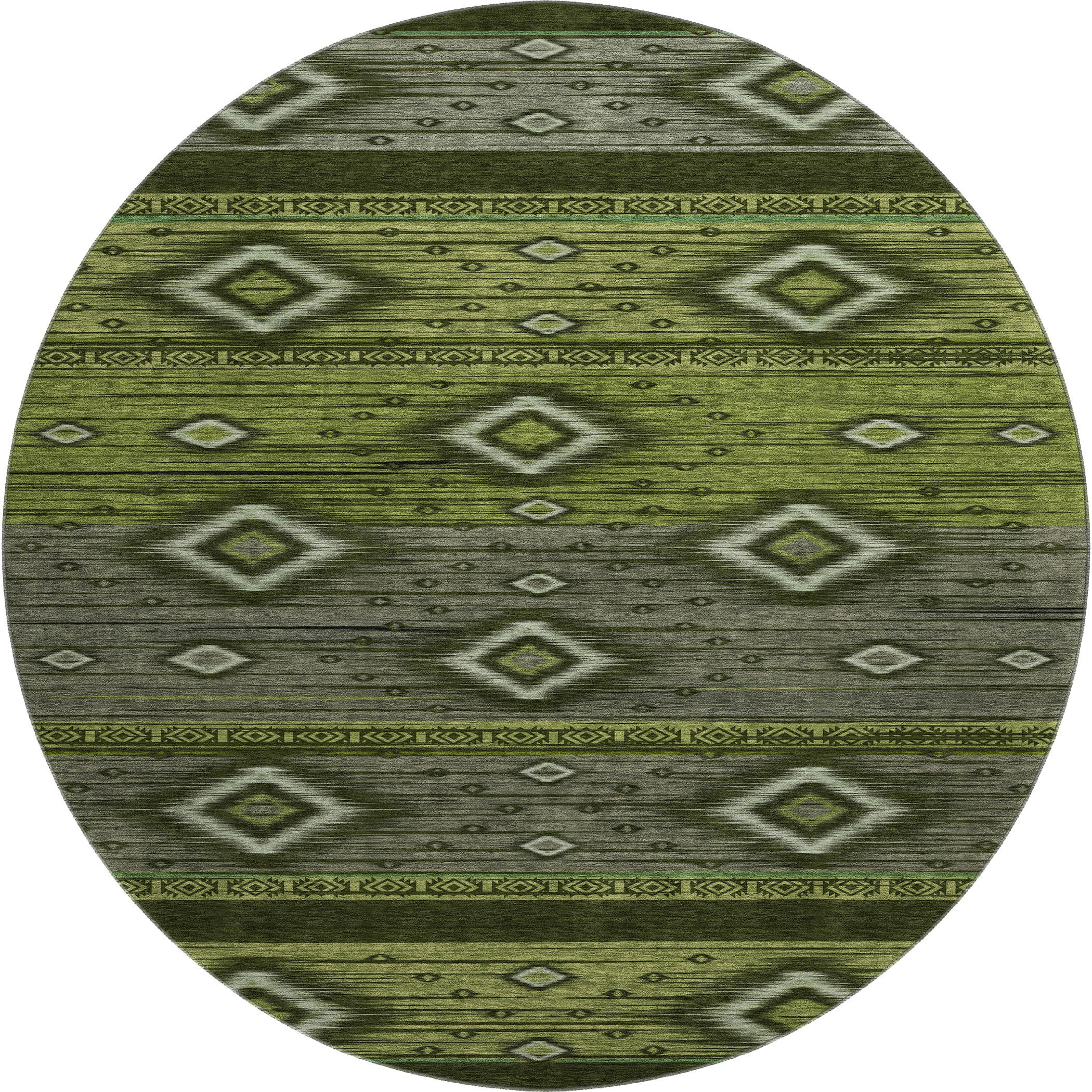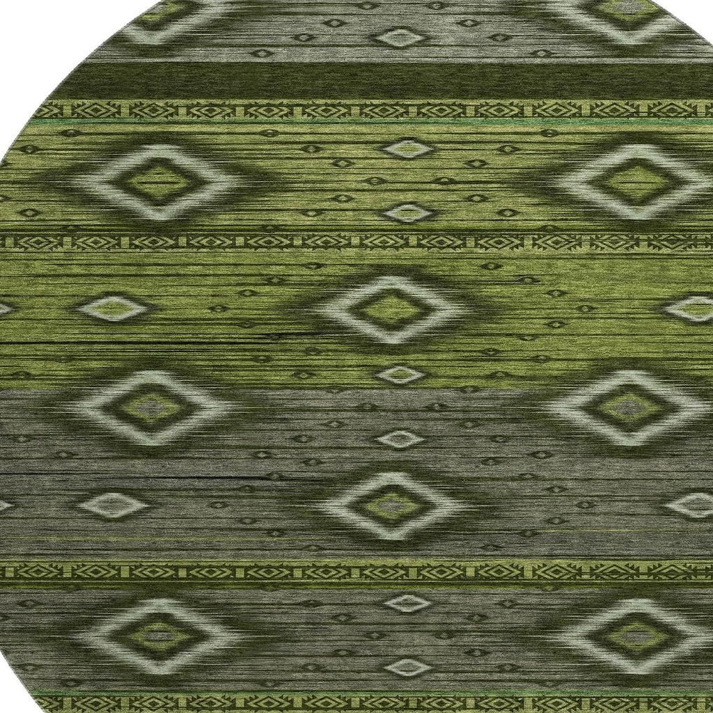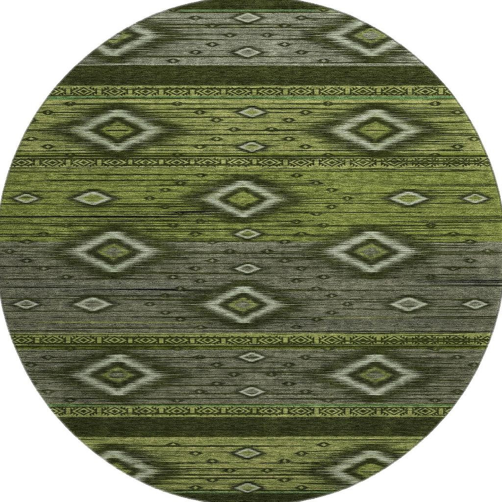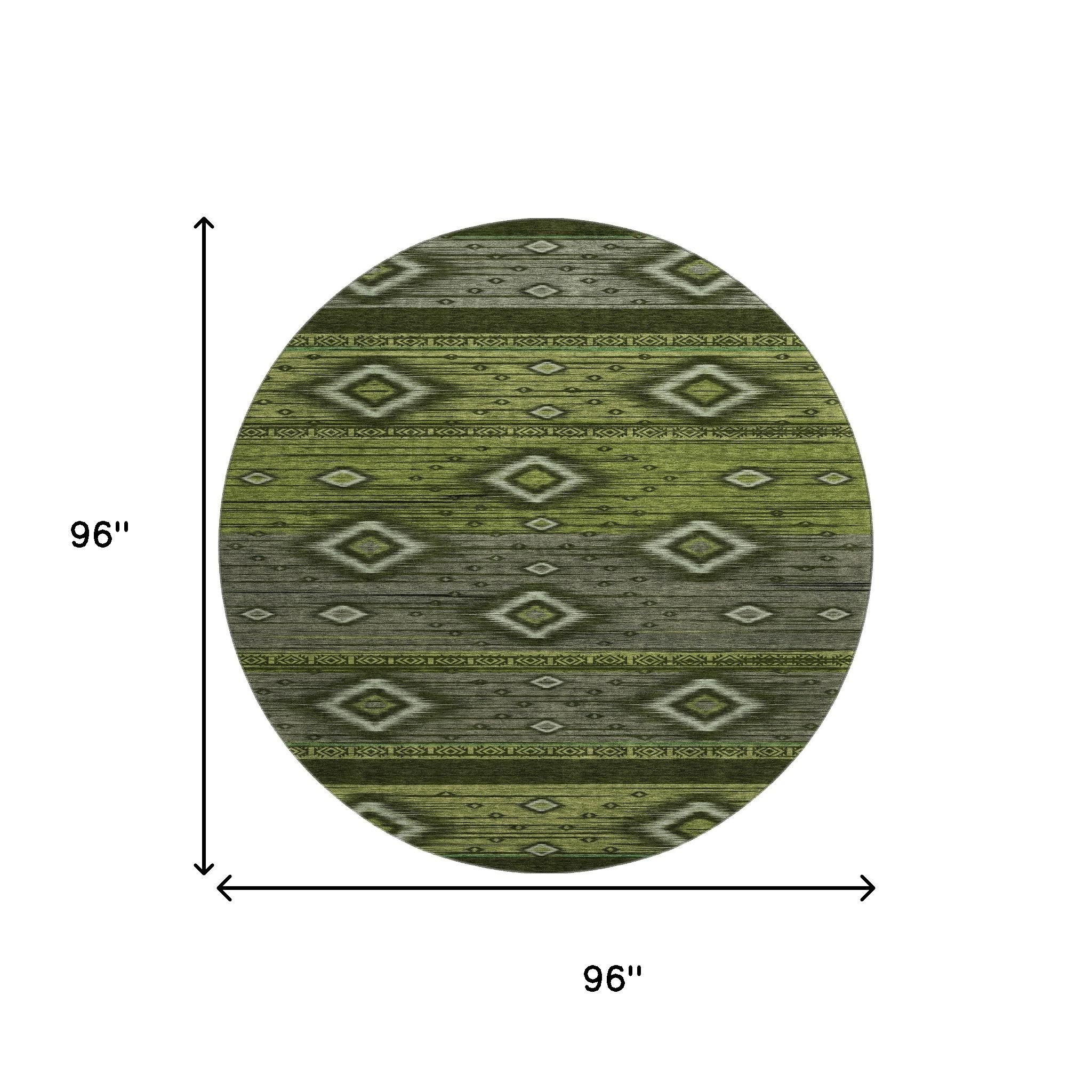 Add great coloration and comfortable texture to your space with this 8-foot artichoke green and gray tribal washable round rug with uv protection. Ideal for spaces with kids and pets, this rug is stain resistant to help repel dirt and spilled liquids. Built to last, this rug crafted from polyester fibers is known for its durability and long lasting appeal. Rugs are a great way to showcase your style, hide imperfections, warm your home and reduce noise. This larger sized, transitional styled rug is ready to create a focal point or statement piece in your room. 96.00-inch h x 96.00-inch w x 0.39-inch d.