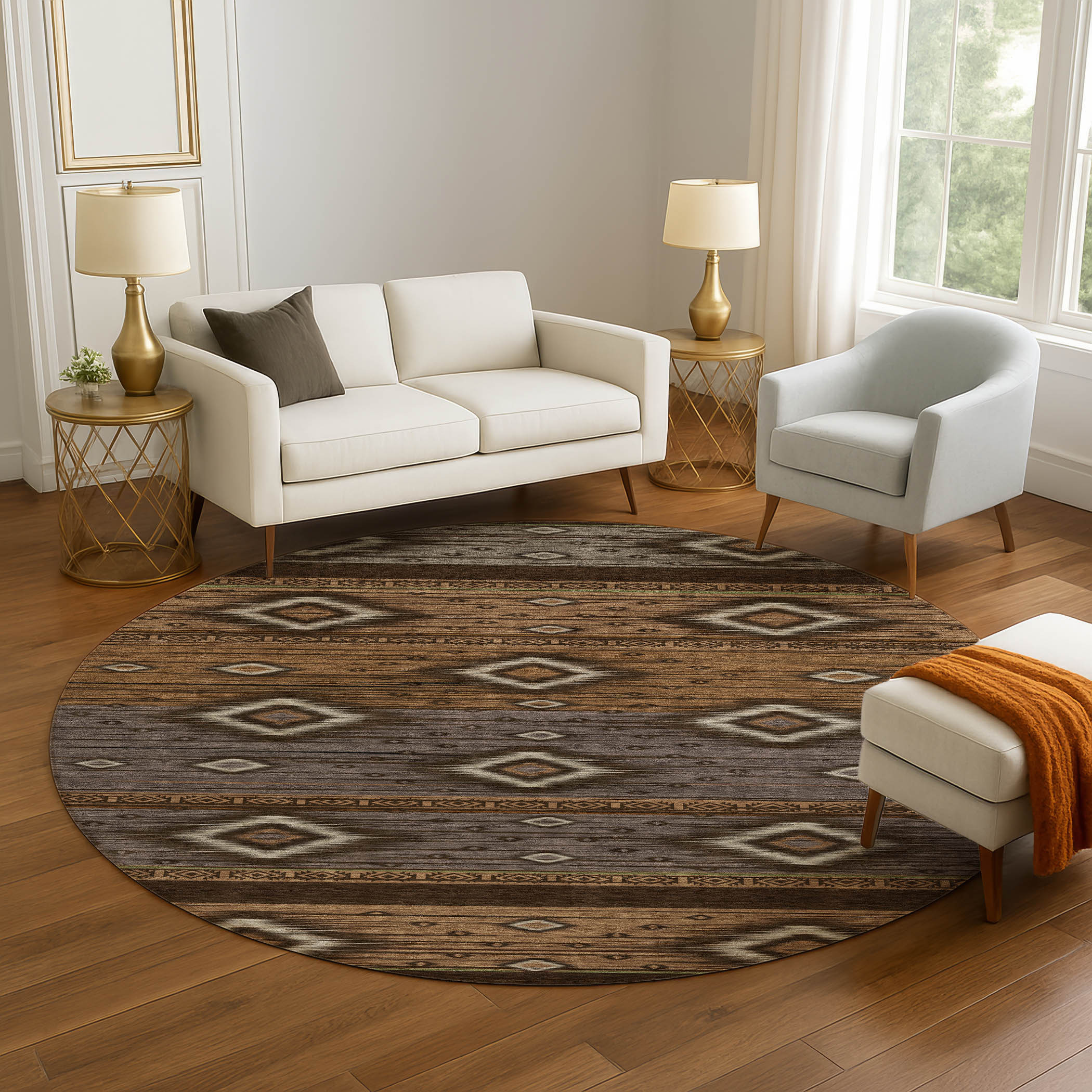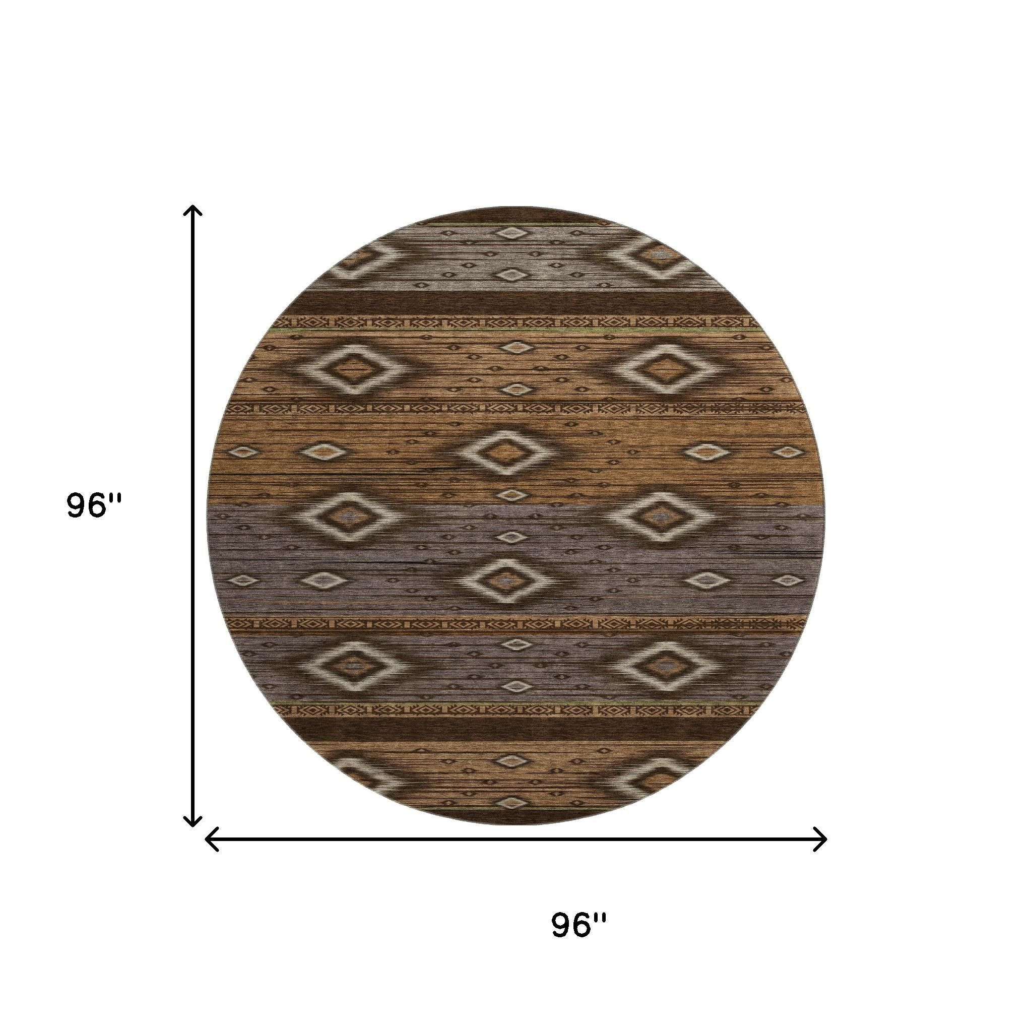 This 8-foot chocolate and gray tribal washable round rug with uv protection, is a great way to add warmth to a room. Ideal for spaces with kids and pets, this rug is stain resistant to help repel dirt and spilled liquids. Built to last, this rug crafted from polyester fibers is known for its durability and long lasting appeal. Rugs are a great way to showcase your style, hide imperfections, warm your home and reduce noise. This larger sized, transitional styled rug is ready to create a focal point or statement piece in your room. 96.00-inch h x 96.00-inch w x 0.39-inch d.