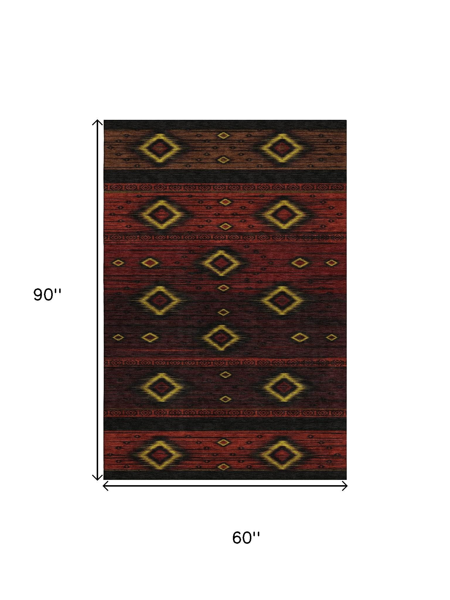 Set an inviting tone in your space with this 5-foot x 8-foot red black and gold tribal washable area rug with uv protection. Ideal for spaces with kids and pets, this rug is stain resistant to help repel dirt and spilled liquids. Built to last, this rug crafted from polyester fibers is known for its durability and long lasting appeal. Rugs are a great way to showcase your style, hide imperfections, warm your home and reduce noise. This larger sized, transitional styled rug is ready to create a focal point or statement piece in your room. 60.00-inch h x 90.00-inch w x 0.39-inch d.