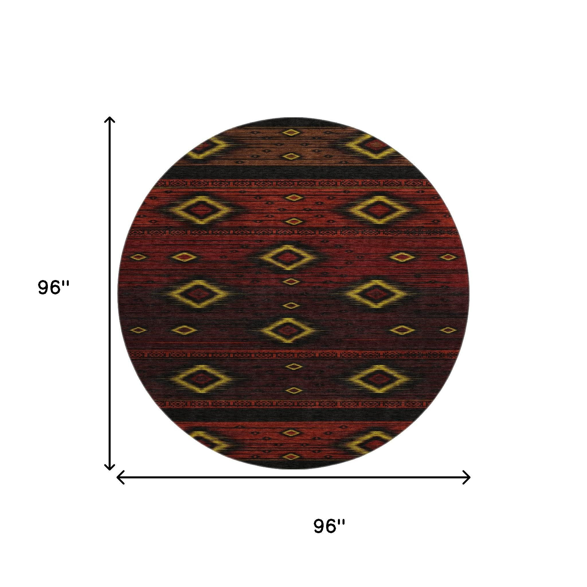 This 8-foot red black and gold tribal washable round rug with uv protection, is a great way to add warmth to a room. Ideal for spaces with kids and pets, this rug is stain resistant to help repel dirt and spilled liquids. Built to last, this rug crafted from polyester fibers is known for its durability and long lasting appeal. Rugs are a great way to showcase your style, hide imperfections, warm your home and reduce noise. This larger sized, transitional styled rug is ready to create a focal point or statement piece in your room. 96.00-inch h x 96.00-inch w x 0.39-inch d.