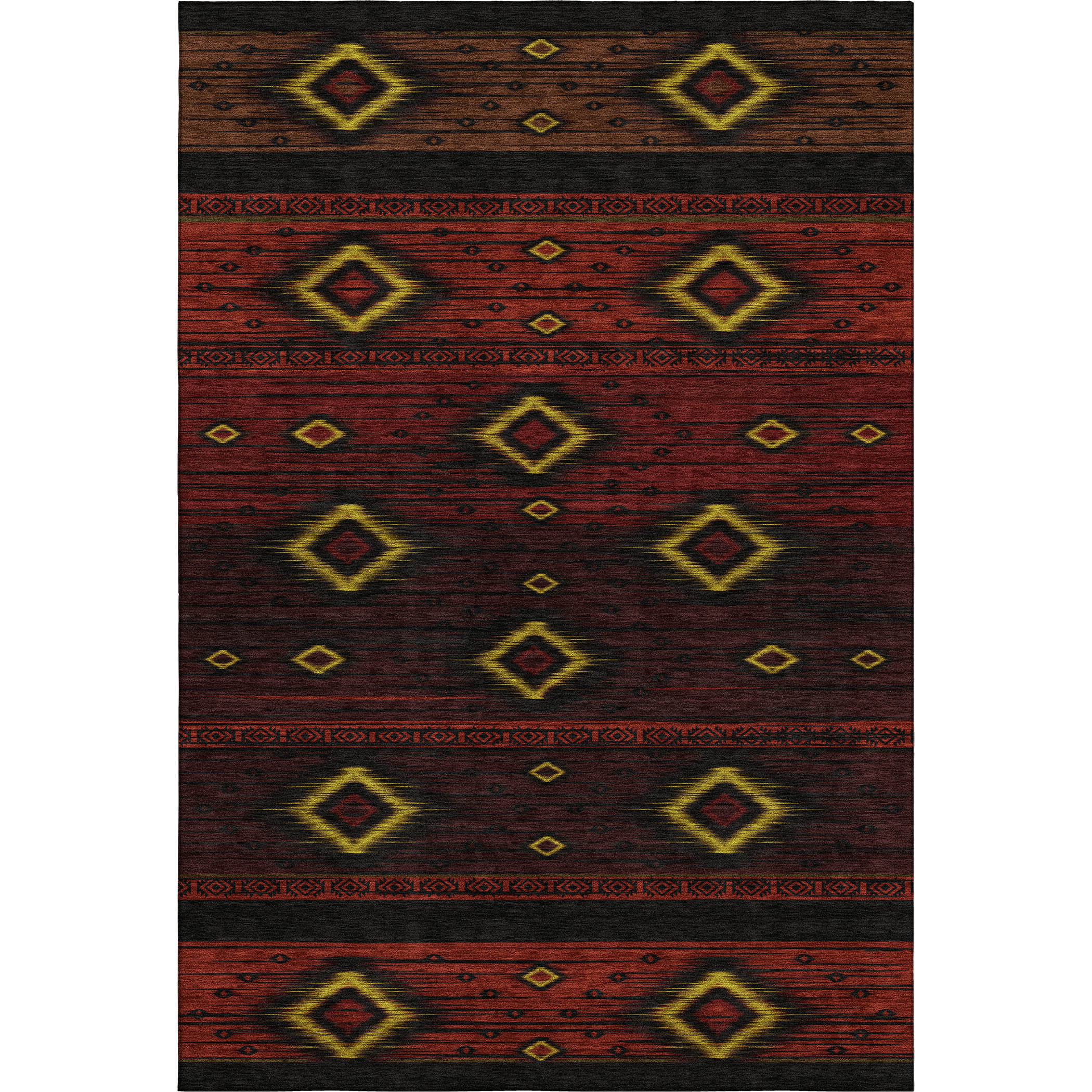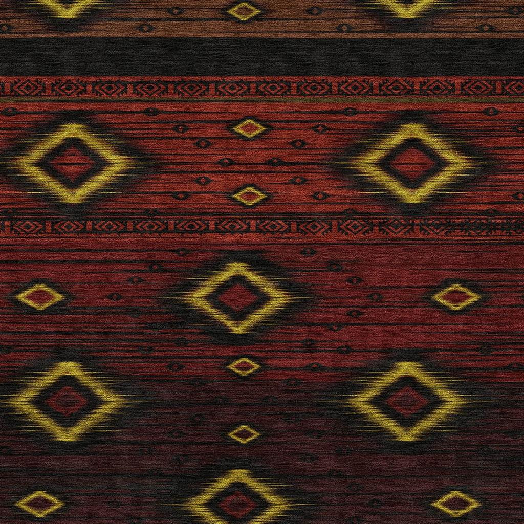 Set an inviting tone in your space with this 8-foot x 10-foot red black and gold tribal washable area rug with uv protection. Ideal for spaces with kids and pets, this rug is stain resistant to help repel dirt and spilled liquids. Built to last, this rug crafted from polyester fibers is known for its durability and long lasting appeal. Rugs are a great way to showcase your style, hide imperfections, warm your home and reduce noise. This larger sized, transitional styled rug is ready to create a focal point or statement piece in your room. 96.00-inch h x 120.00-inch w x 0.39-inch d.