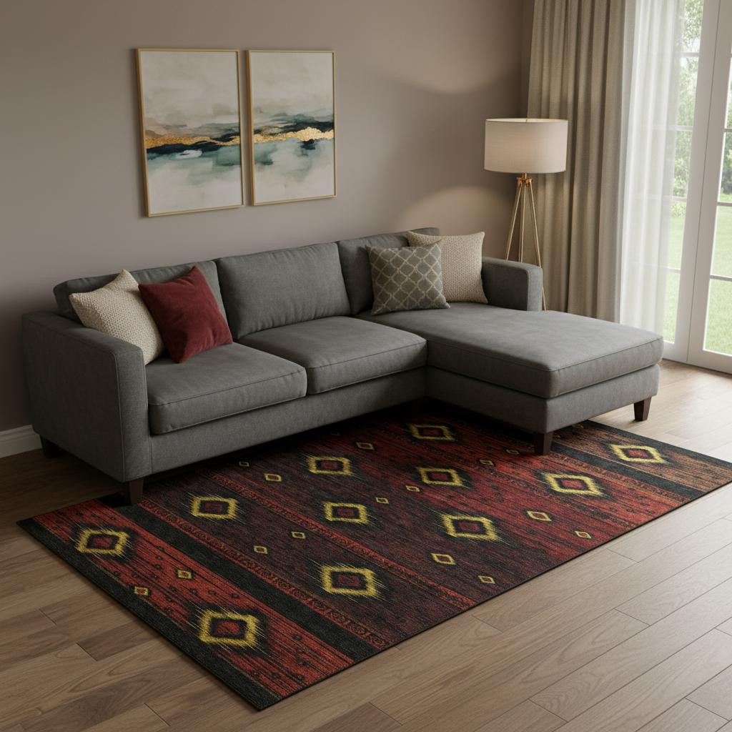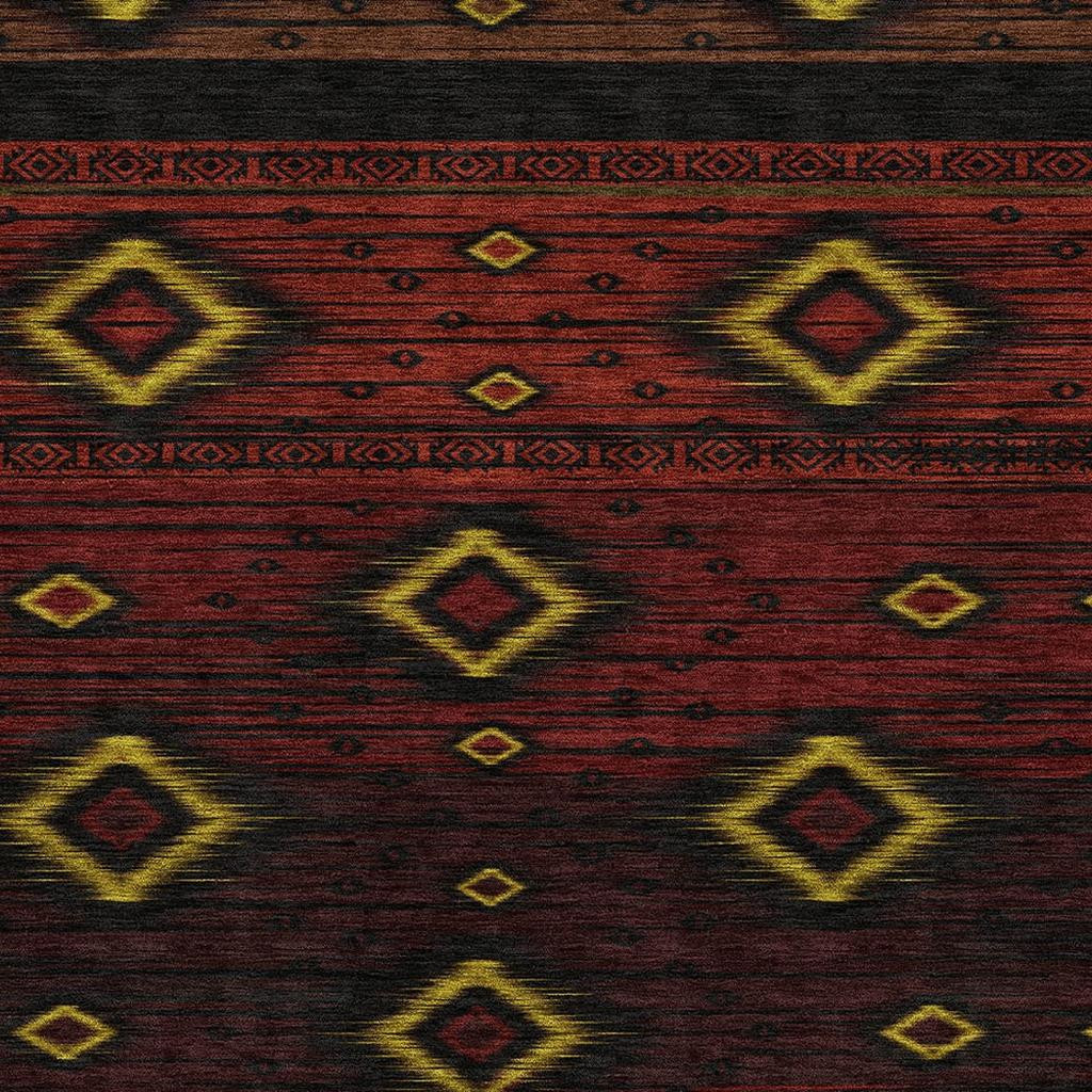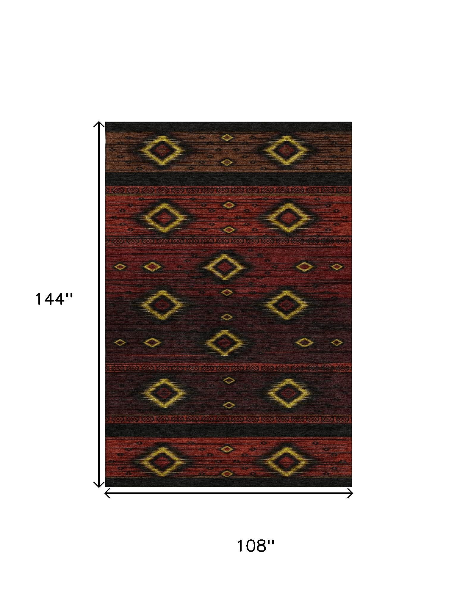Add great coloration and comfortable texture to your space with this 9-foot x 12-foot red black and gold tribal washable area rug with uv protection. Ideal for spaces with kids and pets, this rug is stain resistant to help repel dirt and spilled liquids. Built to last, this rug crafted from polyester fibers is known for its durability and long lasting appeal. Rugs are a great way to showcase your style, hide imperfections, warm your home and reduce noise. This larger sized, transitional styled rug is ready to create a focal point or statement piece in your room. 108.00-inch h x 144.00-inch w x 0.39-inch d.