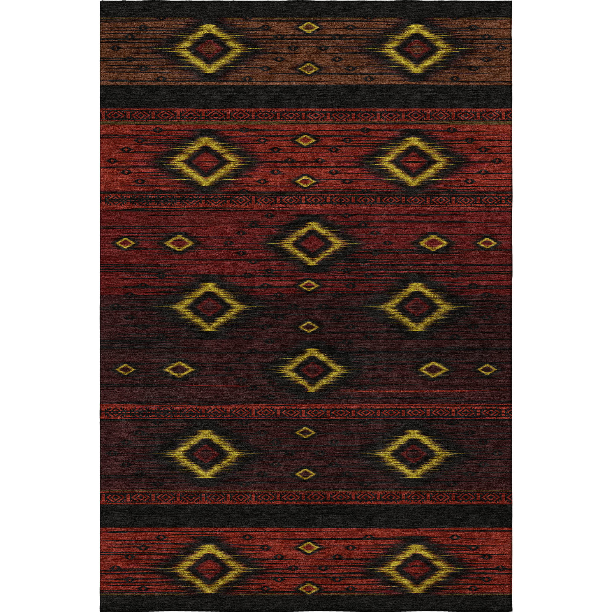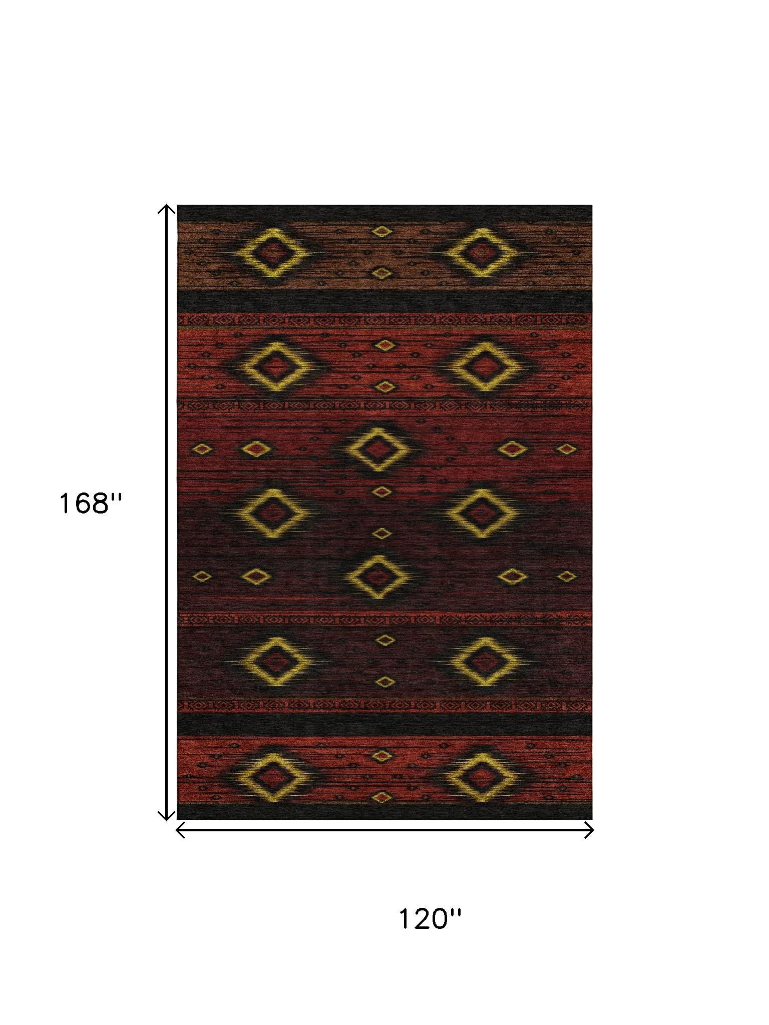 Add great coloration and comfortable texture to your space with this 10-foot x 14-foot red black and gold tribal washable area rug with uv protection. Ideal for spaces with kids and pets, this rug is stain resistant to help repel dirt and spilled liquids. Built to last, this rug crafted from polyester fibers is known for its durability and long lasting appeal. Rugs are a great way to showcase your style, hide imperfections, warm your home and reduce noise. This larger sized, transitional styled rug is ready to create a focal point or statement piece in your room. 120.00-inch h x 168.00-inch w x 0.39-inch d.