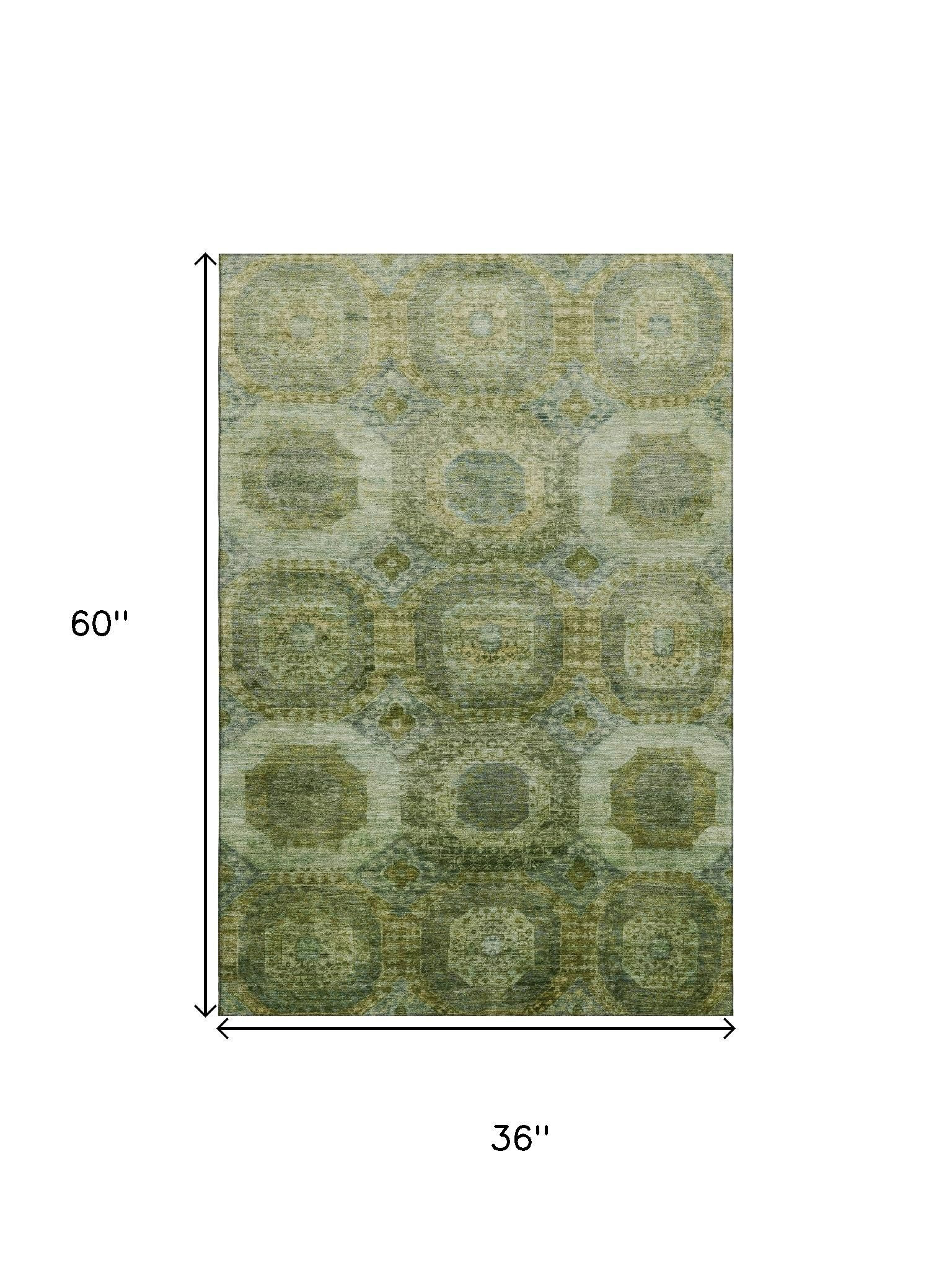 Set an inviting tone in your space with this 3-foot x 5-foot artichoke green and beige abstract geometric washable area rug with uv protection. Ideal for spaces with kids and pets, this rug is stain resistant to help repel dirt and spilled liquids. Built to last, this rug crafted from polyester fibers is known for its durability and long lasting appeal. Rugs are a great way to showcase your style, hide imperfections, warm your home and reduce noise. This smaller sized, transitional styled rug is just what you need for your walkway, bedside, in front of door, cabinet, refrigerator, or chair. 36.00-inch h x 60.00-inch w x 0.39-inch d.