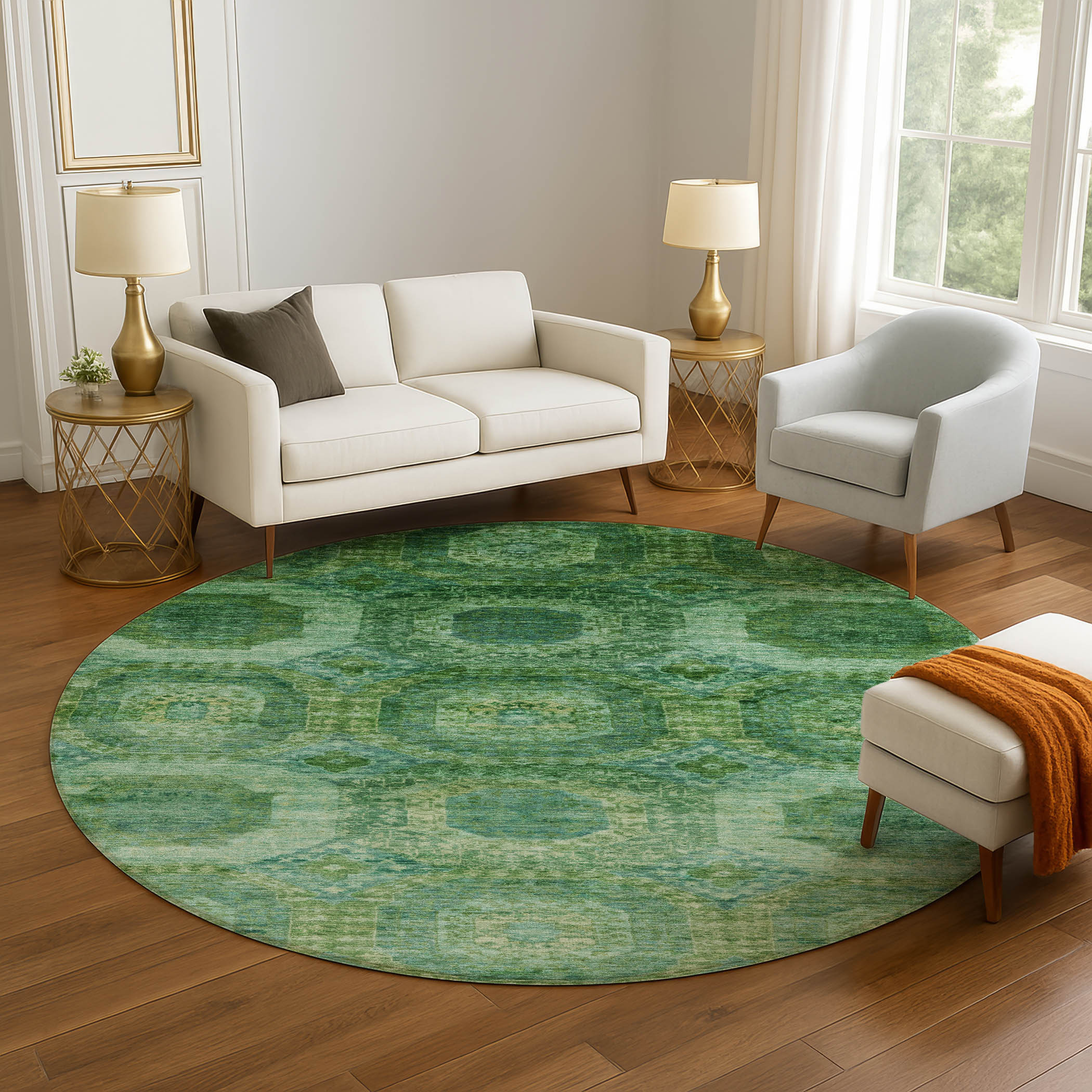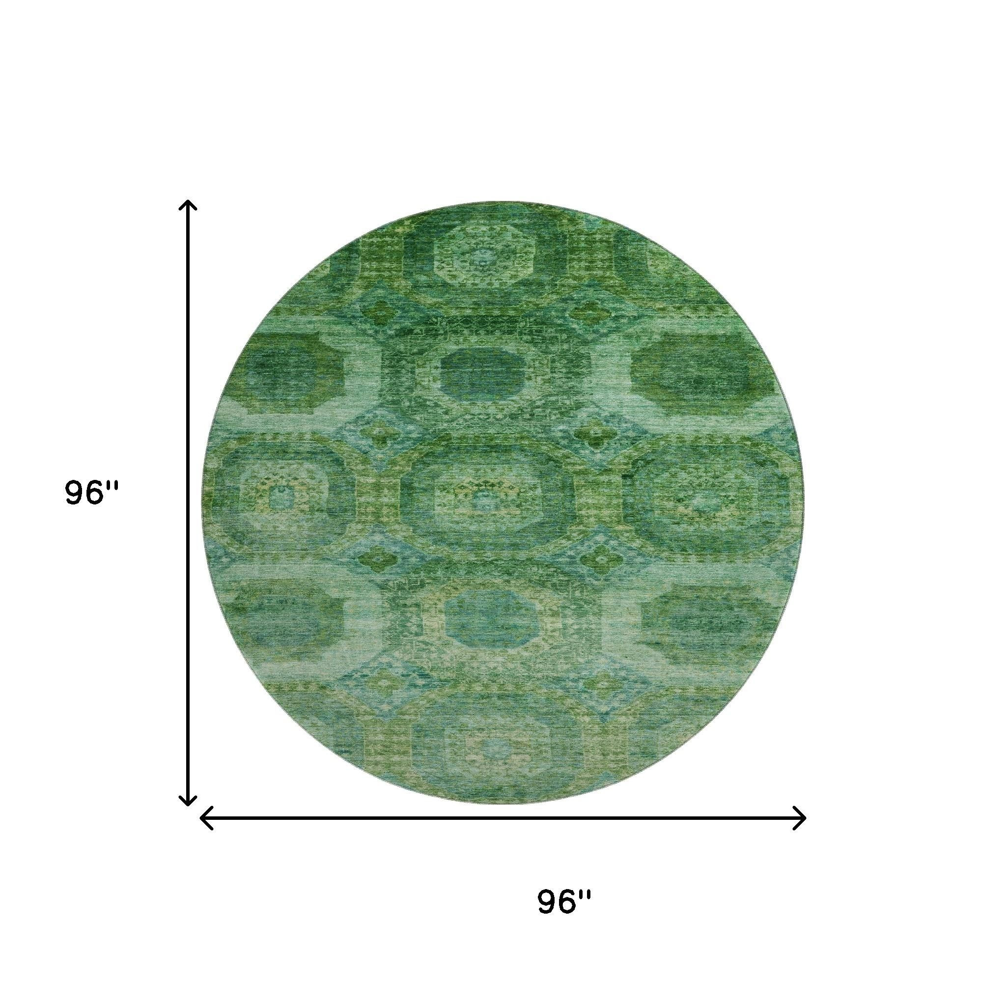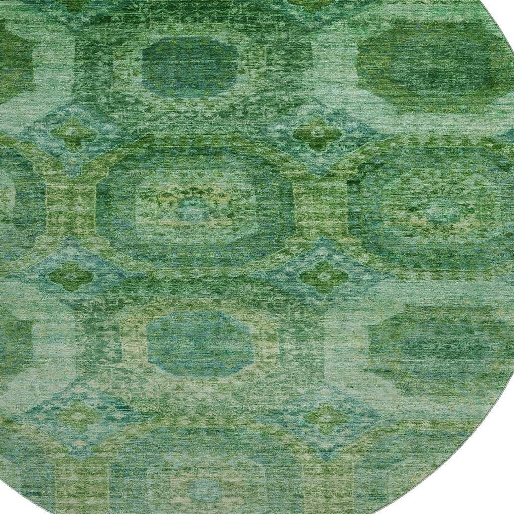 Set an inviting tone in your space with this 8-foot emerald and green abstract geometric washable round rug with uv protection. Ideal for spaces with kids and pets, this rug is stain resistant to help repel dirt and spilled liquids. Built to last, this rug crafted from polyester fibers is known for its durability and long lasting appeal. Rugs are a great way to showcase your style, hide imperfections, warm your home and reduce noise. This larger sized, transitional styled rug is ready to create a focal point or statement piece in your room. 96.00-inch h x 96.00-inch w x 0.39-inch d.