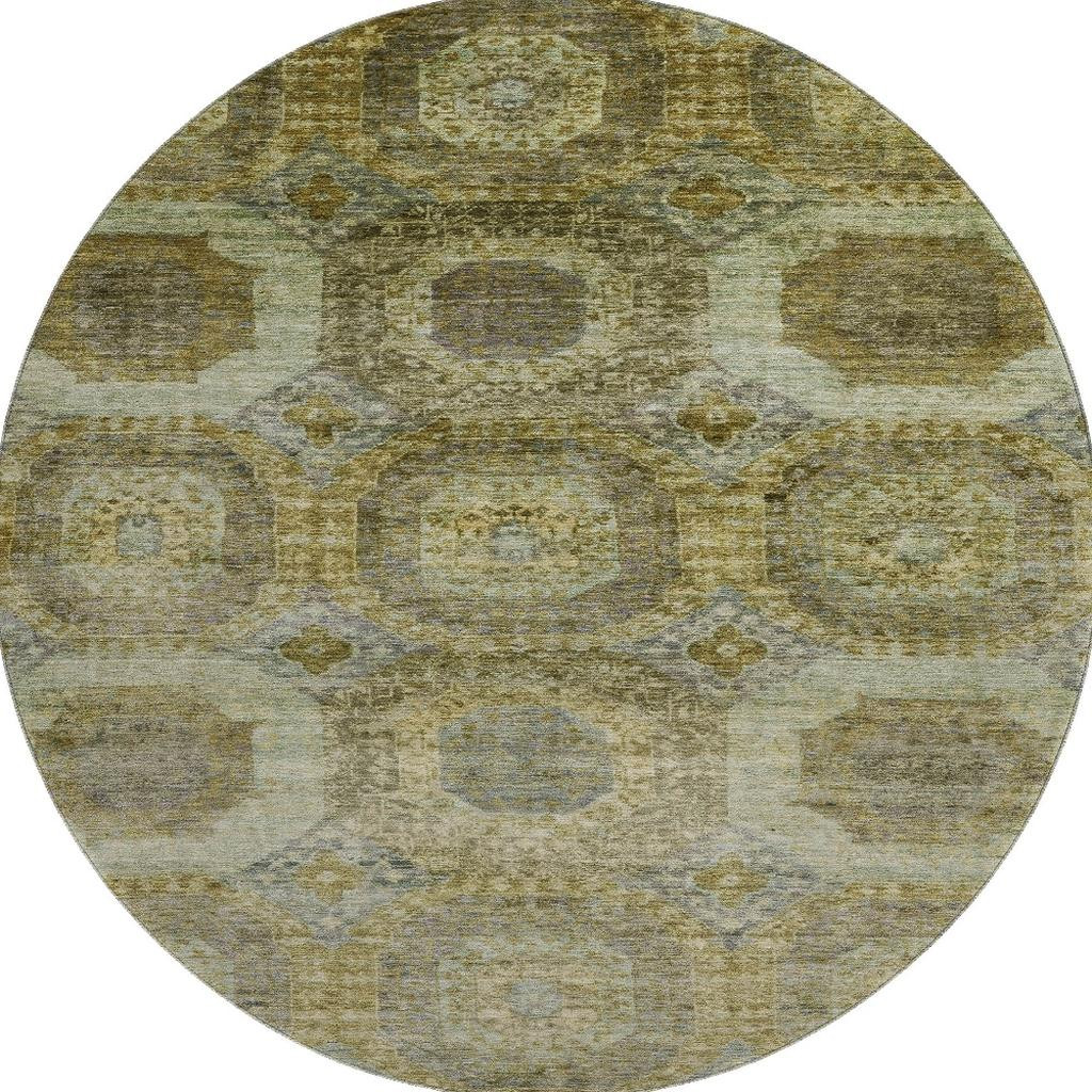 Add some artistry to your room with this 8-foot gold beige and brown abstract geometric washable round rug with uv protection. Ideal for spaces with kids and pets, this rug is stain resistant to help repel dirt and spilled liquids. Built to last, this rug crafted from polyester fibers is known for its durability and long lasting appeal. Rugs are a great way to showcase your style, hide imperfections, warm your home and reduce noise. This larger sized, transitional styled rug is ready to create a focal point or statement piece in your room. 96.00-inch h x 96.00-inch w x 0.39-inch d.