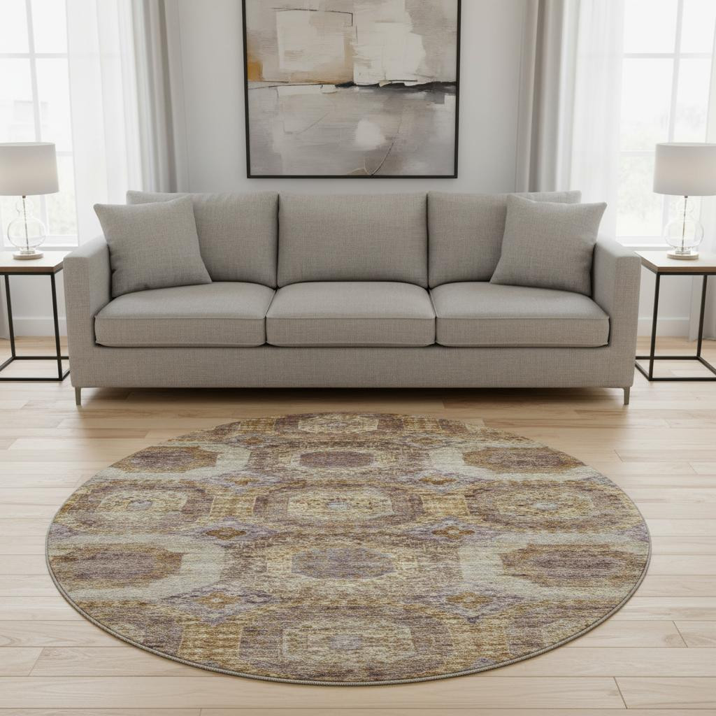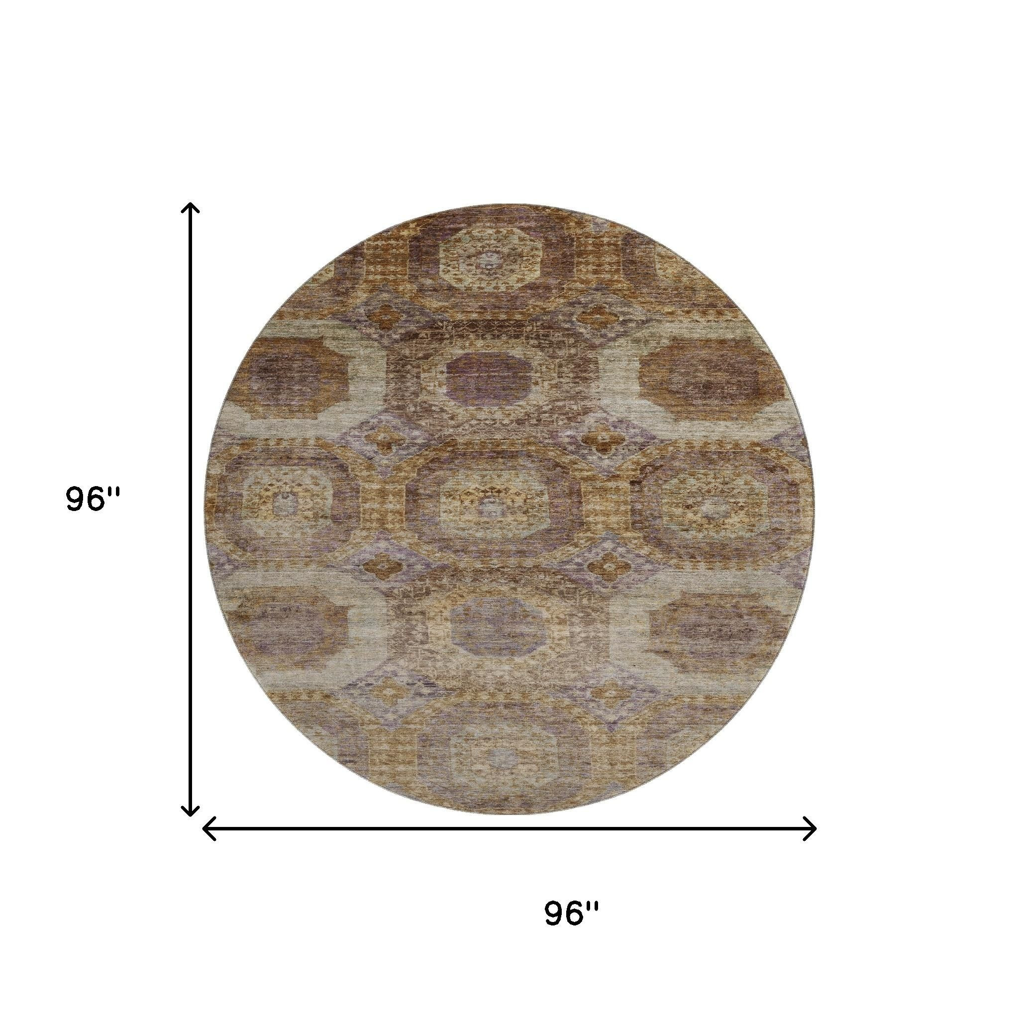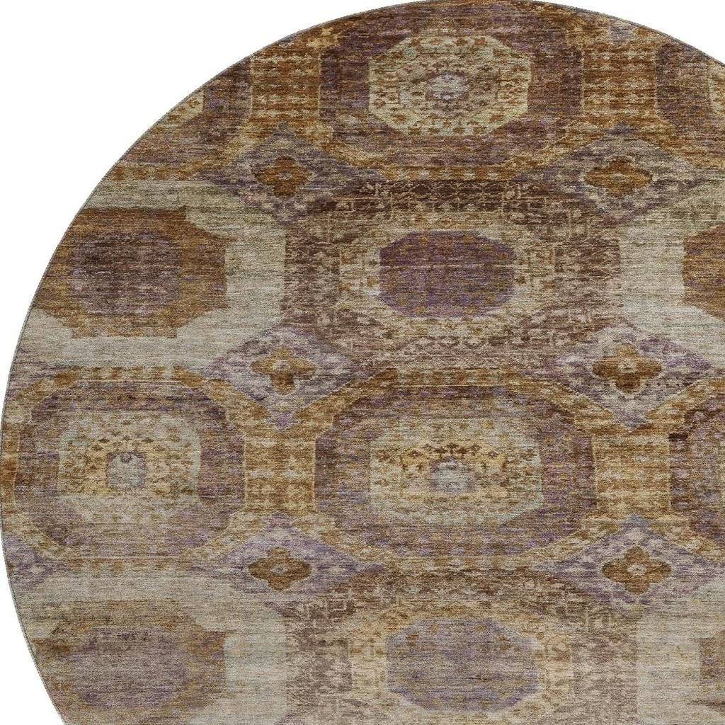 Add some artistry to your room with this 8-foot rust brown and beige abstract geometric washable round rug with uv protection. Ideal for spaces with kids and pets, this rug is stain resistant to help repel dirt and spilled liquids. Built to last, this rug crafted from polyester fibers is known for its durability and long lasting appeal. Rugs are a great way to showcase your style, hide imperfections, warm your home and reduce noise. This larger sized, transitional styled rug is ready to create a focal point or statement piece in your room. 96.00-inch h x 96.00-inch w x 0.39-inch d.