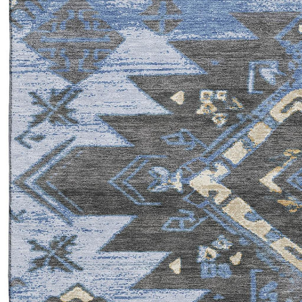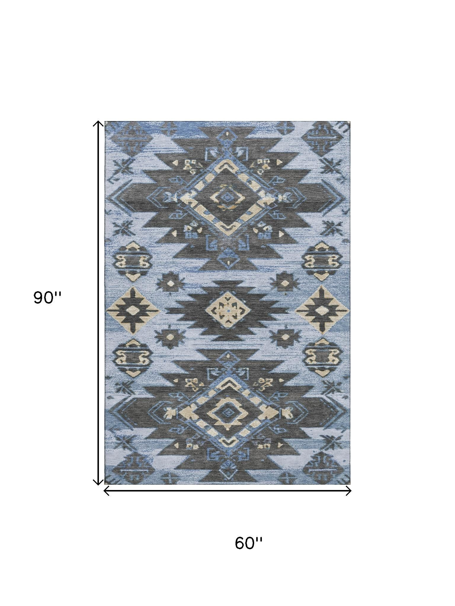 Add some artistry to your room with this 5-foot x 8-foot blue charcoal and gray tribal washable area rug with uv protection. Ideal for spaces with kids and pets, this rug is stain resistant to help repel dirt and spilled liquids. Built to last, this rug crafted from polyester fibers is known for its durability and long lasting appeal. Rugs are a great way to showcase your style, hide imperfections, warm your home and reduce noise. This larger sized, transitional styled rug is ready to create a focal point or statement piece in your room. 60.00-inch h x 90.00-inch w x 0.39-inch d.