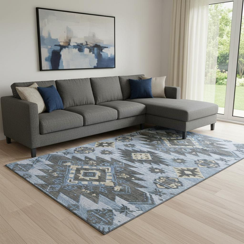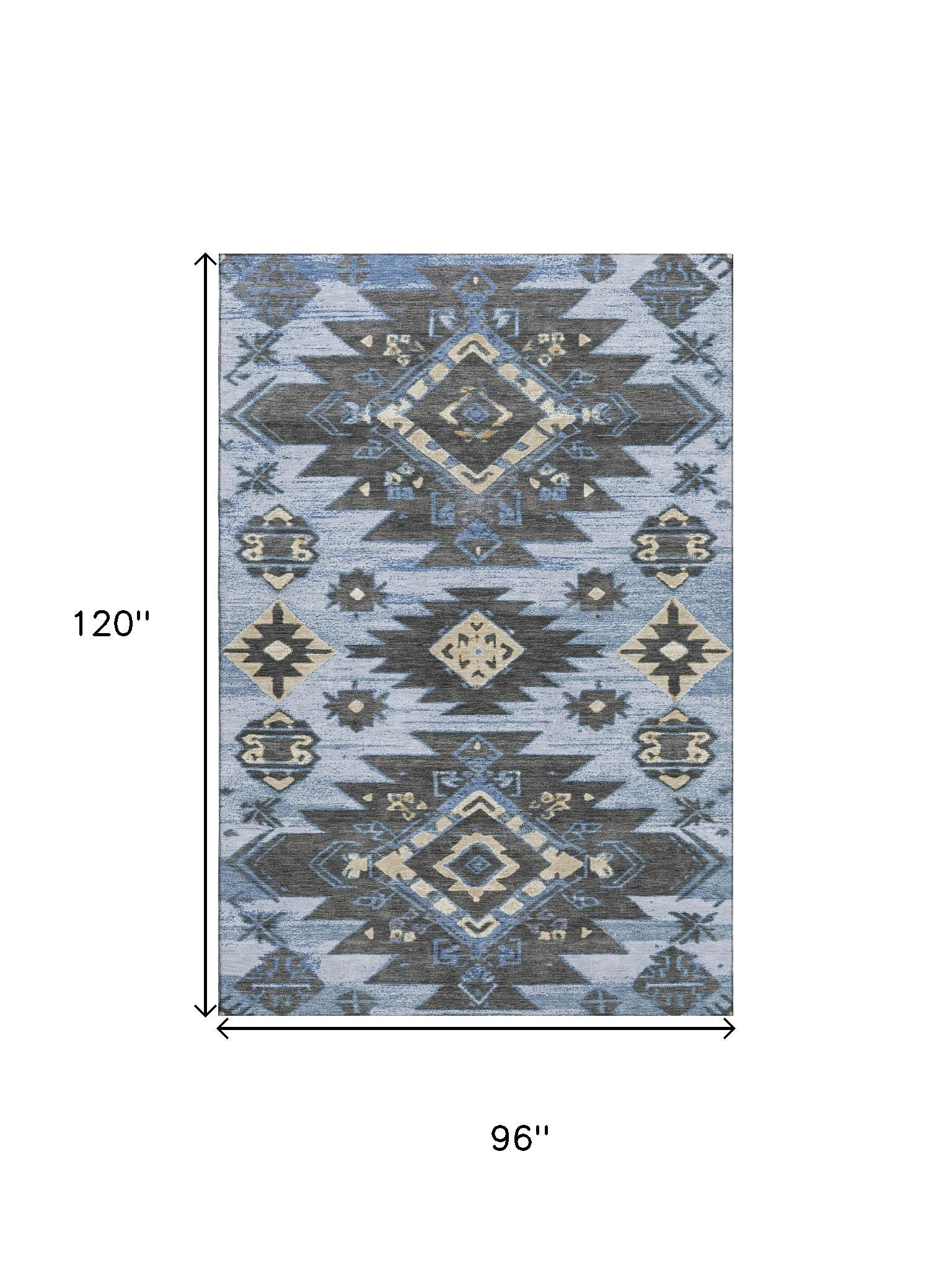 This 8-foot x 10-foot blue charcoal and gray tribal washable area rug with uv protection, is a great way to add warmth to a room. Ideal for spaces with kids and pets, this rug is stain resistant to help repel dirt and spilled liquids. Built to last, this rug crafted from polyester fibers is known for its durability and long lasting appeal. Rugs are a great way to showcase your style, hide imperfections, warm your home and reduce noise. This larger sized, transitional styled rug is ready to create a focal point or statement piece in your room. 96.00-inch h x 120.00-inch w x 0.39-inch d.