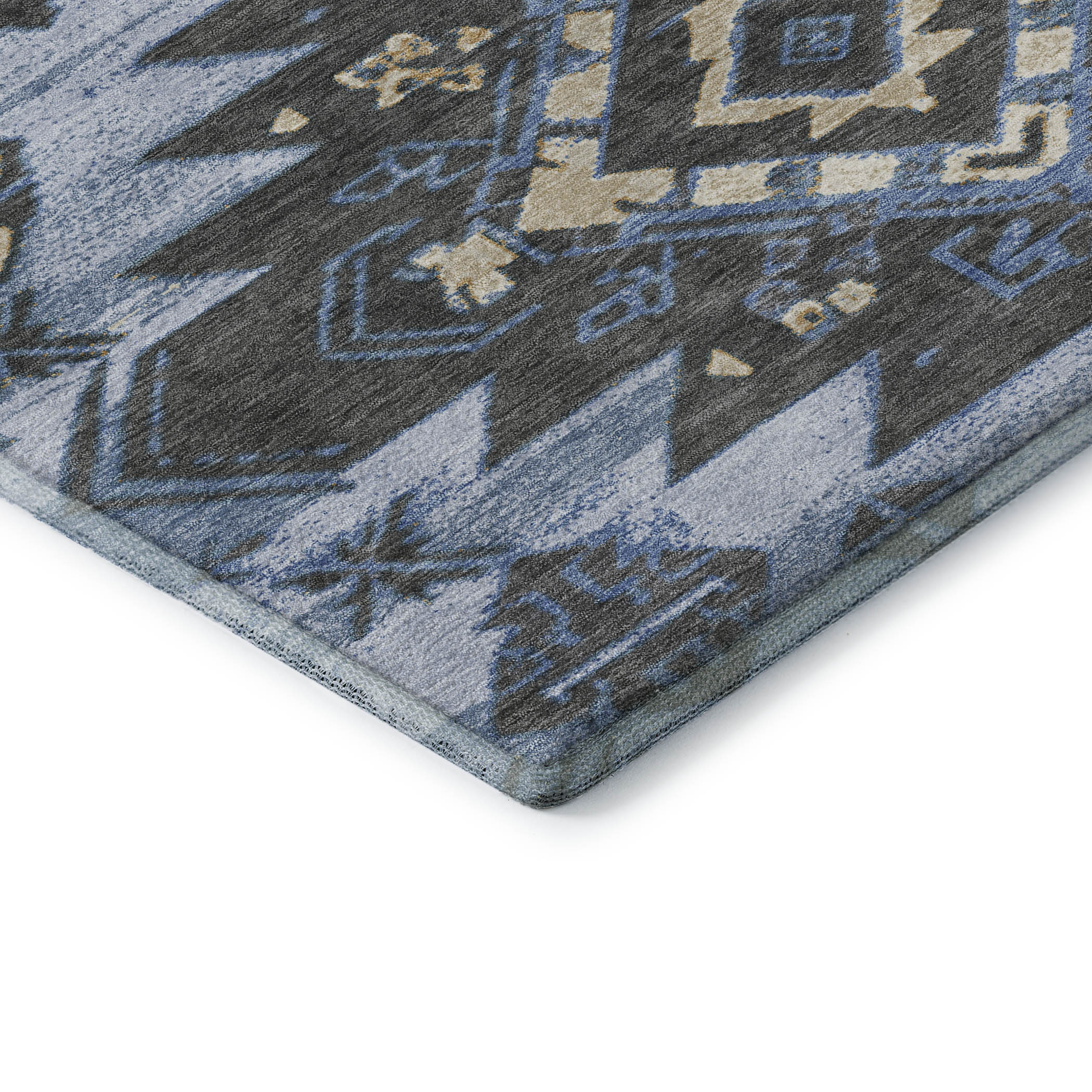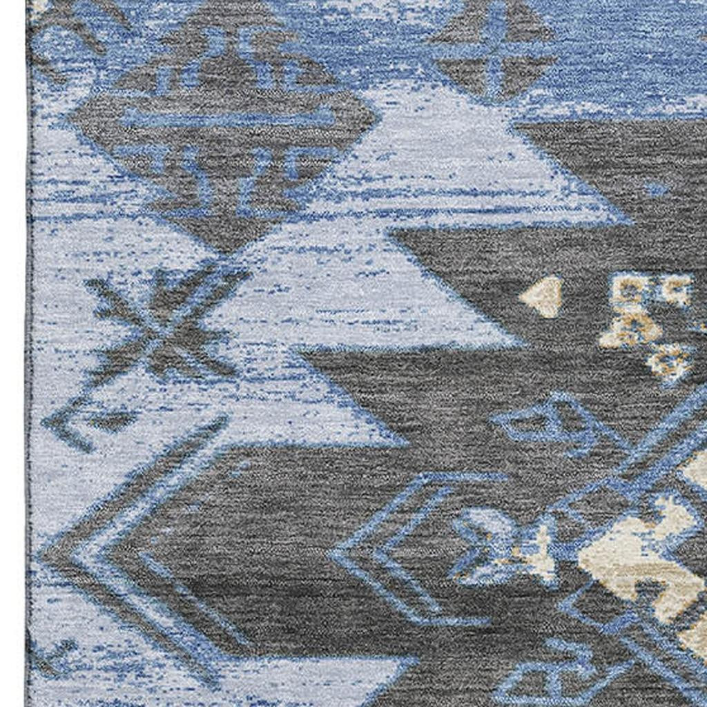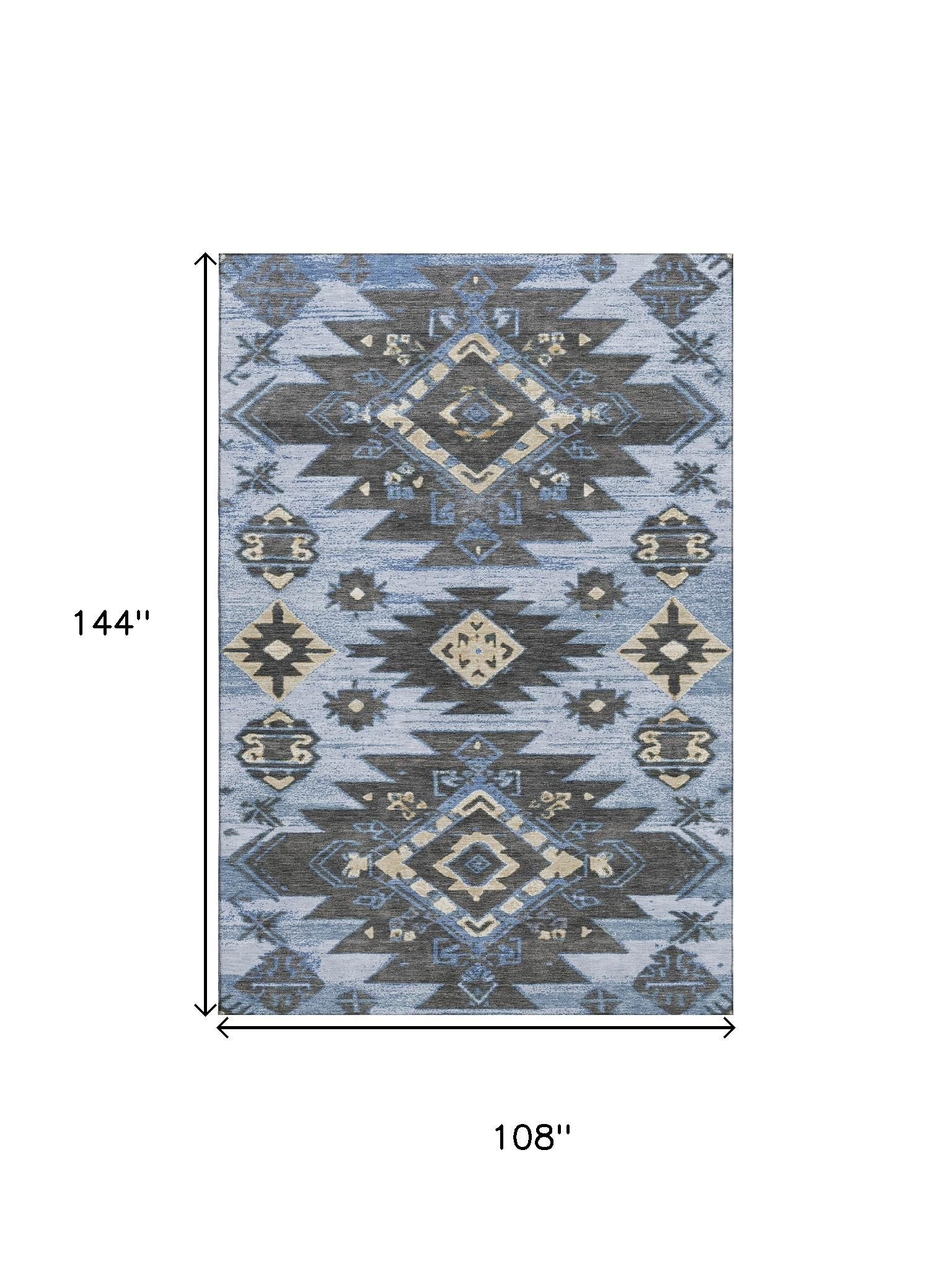 Add great coloration and comfortable texture to your space with this 9-foot x 12-foot blue charcoal and gray tribal washable area rug with uv protection. Ideal for spaces with kids and pets, this rug is stain resistant to help repel dirt and spilled liquids. Built to last, this rug crafted from polyester fibers is known for its durability and long lasting appeal. Rugs are a great way to showcase your style, hide imperfections, warm your home and reduce noise. This larger sized, transitional styled rug is ready to create a focal point or statement piece in your room. 108.00-inch h x 144.00-inch w x 0.39-inch d.