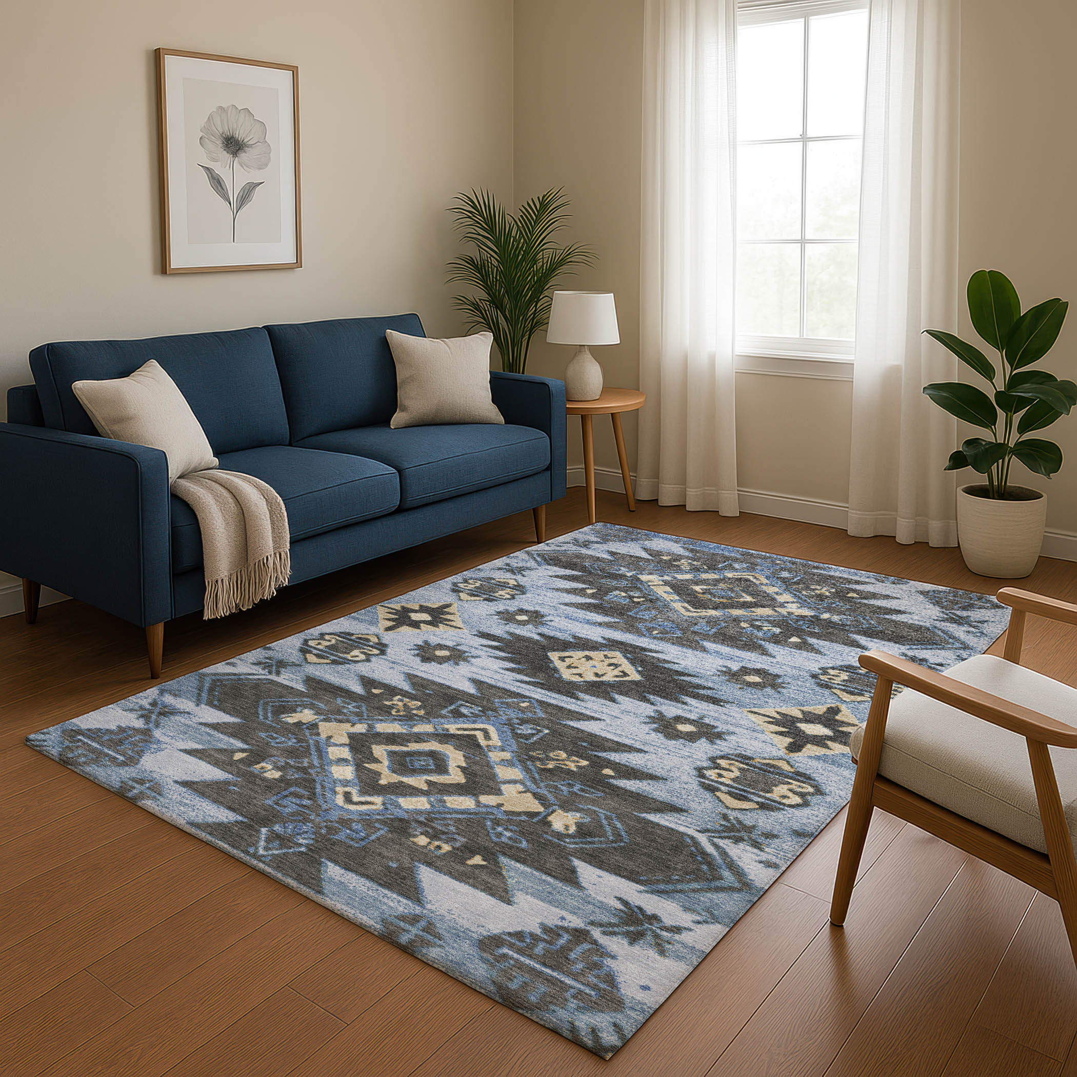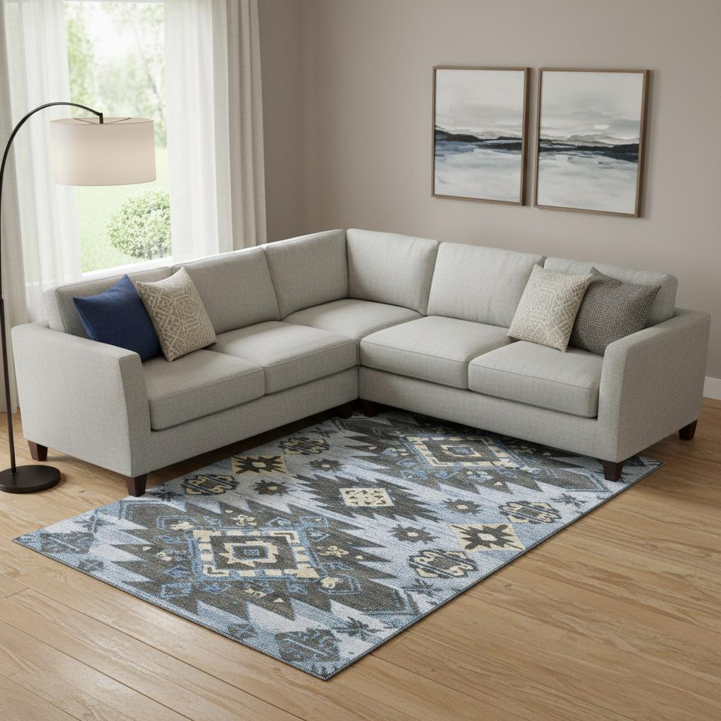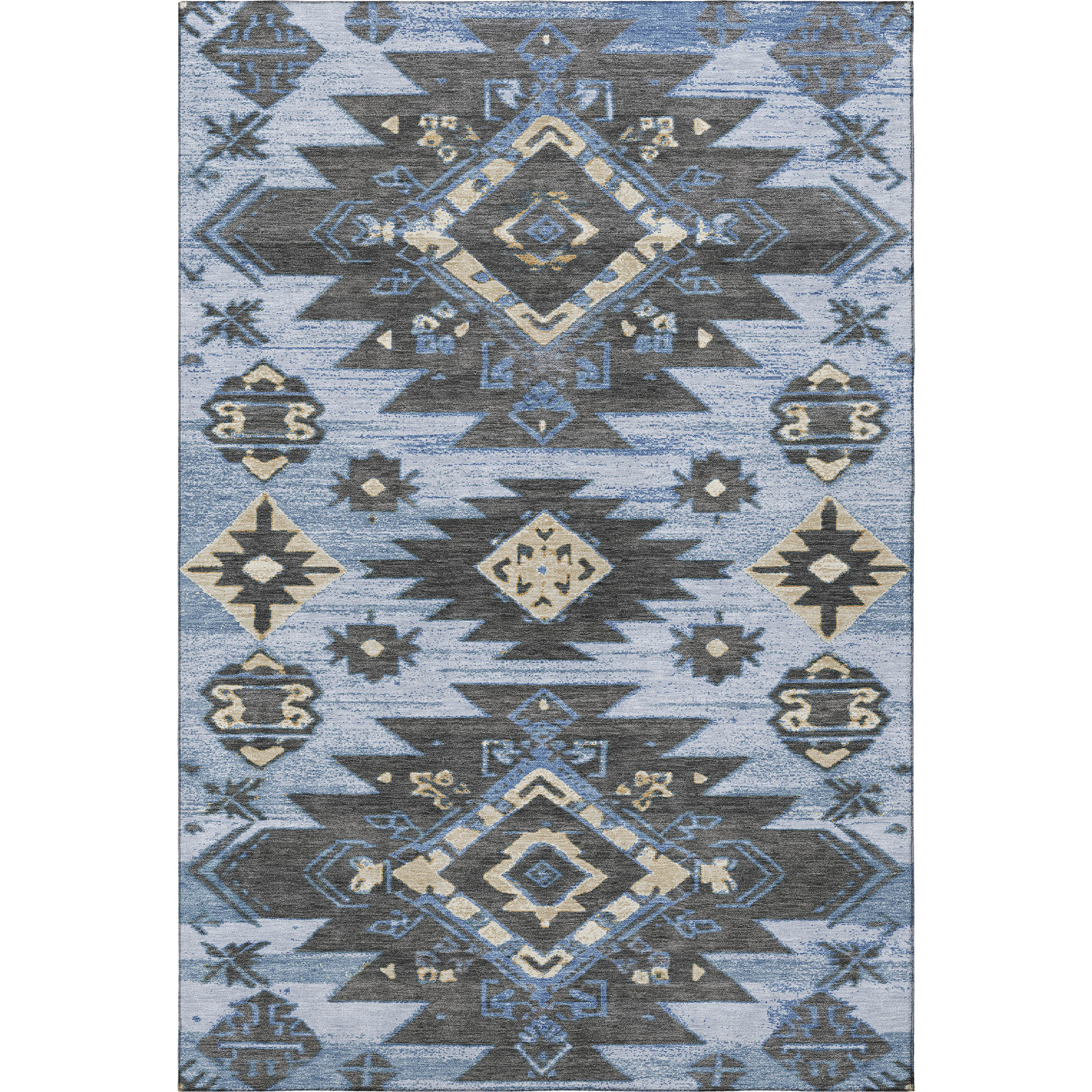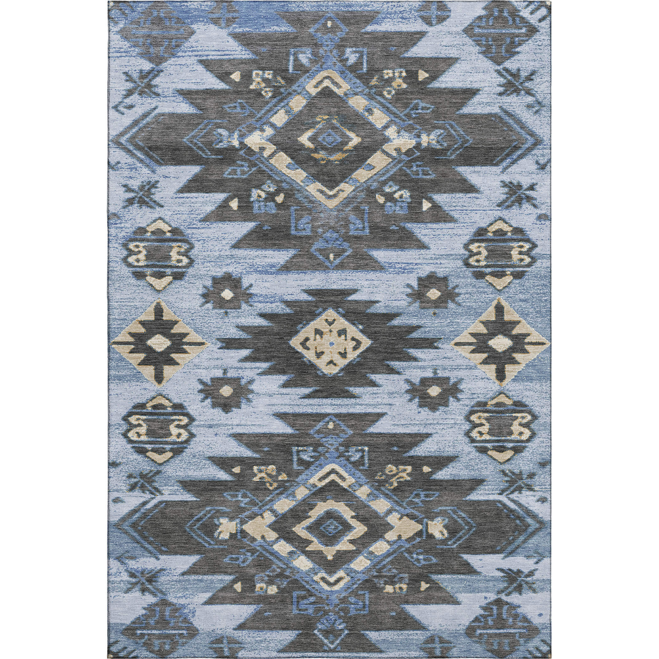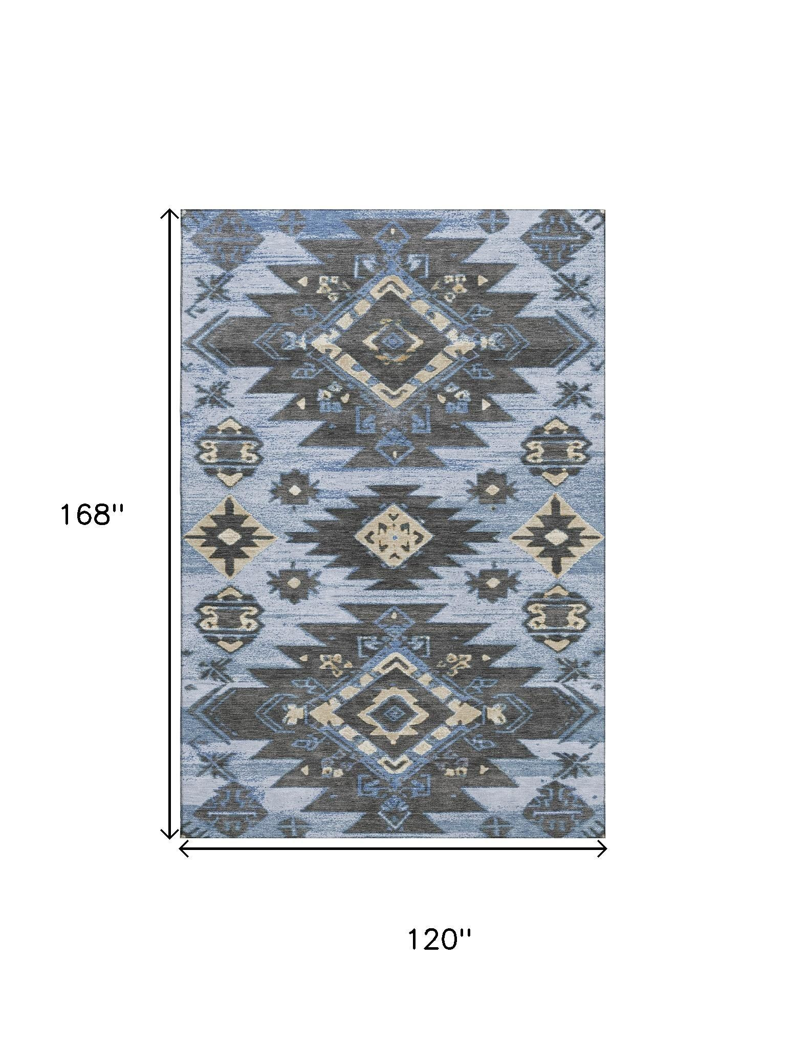 Add some artistry to your room with this 10-foot x 14-foot blue charcoal and gray tribal washable area rug with uv protection. Ideal for spaces with kids and pets, this rug is stain resistant to help repel dirt and spilled liquids. Built to last, this rug crafted from polyester fibers is known for its durability and long lasting appeal. Rugs are a great way to showcase your style, hide imperfections, warm your home and reduce noise. This larger sized, transitional styled rug is ready to create a focal point or statement piece in your room. 120.00-inch h x 168.00-inch w x 0.39-inch d.