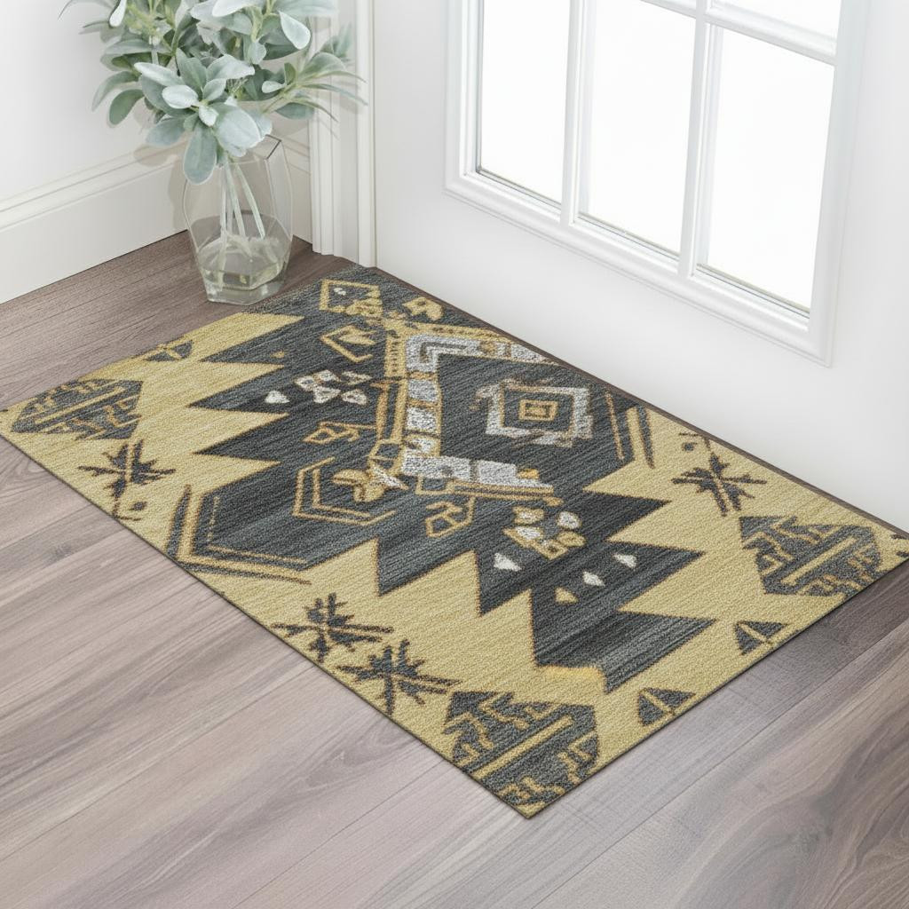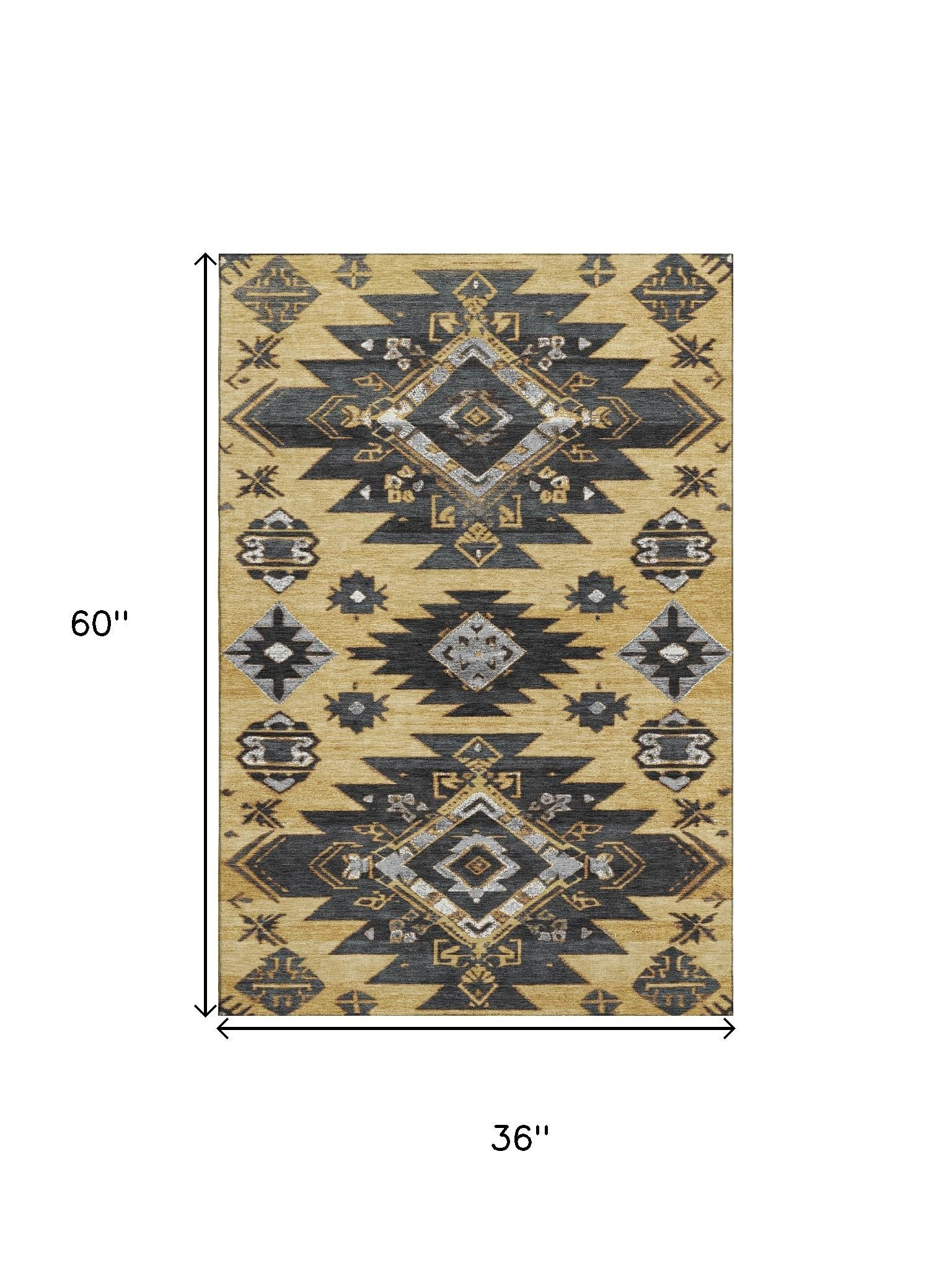 Add great coloration and comfortable texture to your space with this 3-foot x 5-foot gold charcoal and gray tribal washable area rug with uv protection. Ideal for spaces with kids and pets, this rug is stain resistant to help repel dirt and spilled liquids. Built to last, this rug crafted from polyester fibers is known for its durability and long lasting appeal. Rugs are a great way to showcase your style, hide imperfections, warm your home and reduce noise. This smaller sized, transitional styled rug is just what you need for your walkway, bedside, in front of door, cabinet, refrigerator, or chair. 36.00-inch h x 60.00-inch w x 0.39-inch d.
