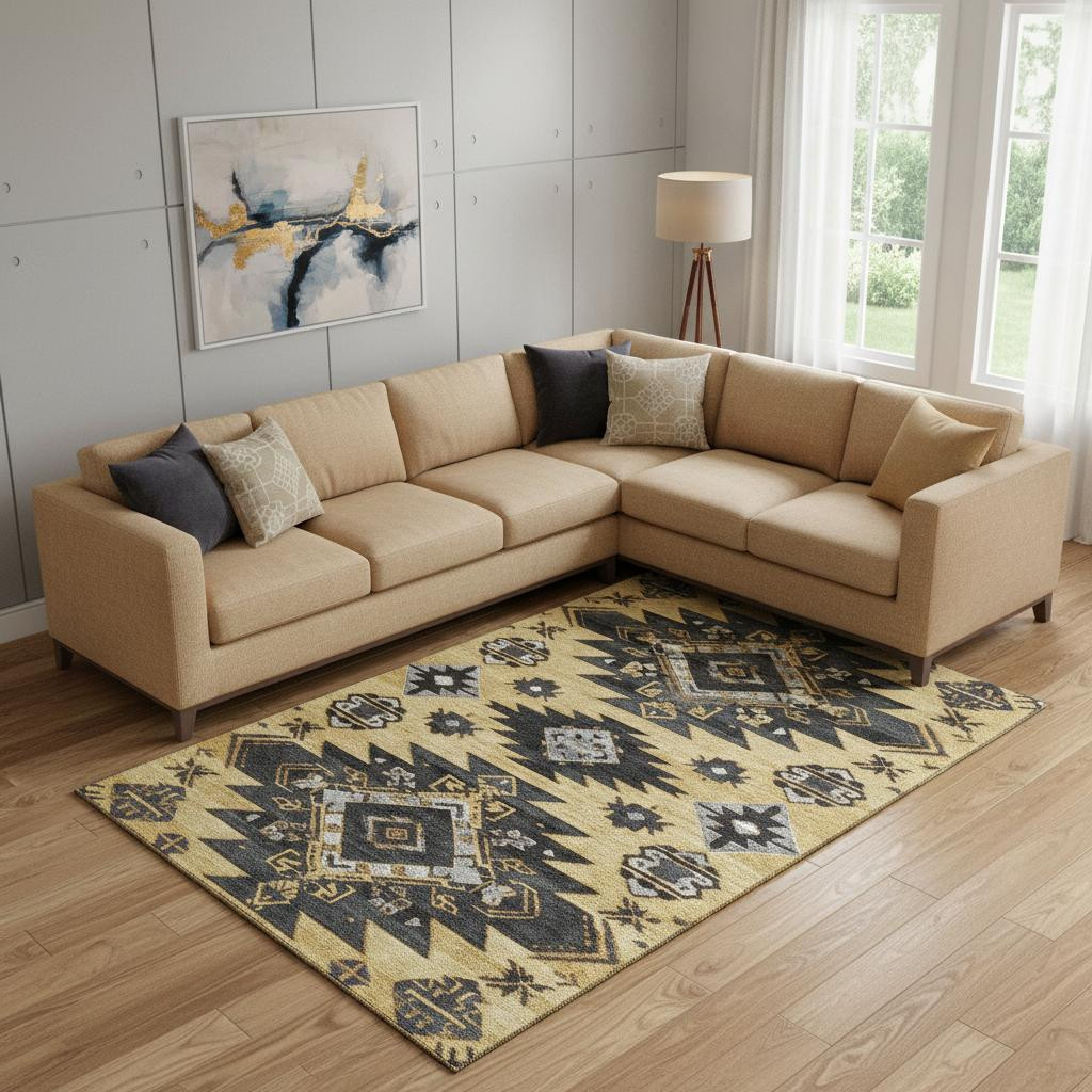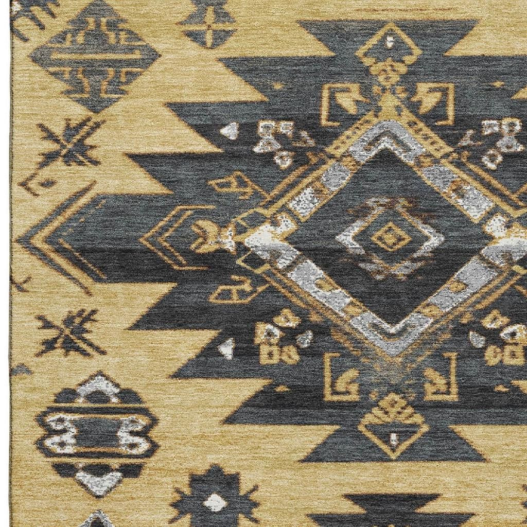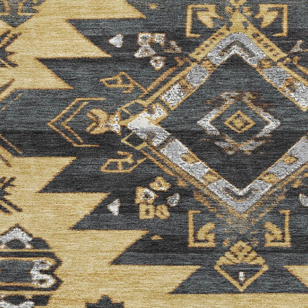 Add some artistry to your room with this 10-foot x 14-foot gold charcoal and gray tribal washable area rug with uv protection. Ideal for spaces with kids and pets, this rug is stain resistant to help repel dirt and spilled liquids. Built to last, this rug crafted from polyester fibers is known for its durability and long lasting appeal. Rugs are a great way to showcase your style, hide imperfections, warm your home and reduce noise. This larger sized, transitional styled rug is ready to create a focal point or statement piece in your room. 120.00-inch h x 168.00-inch w x 0.39-inch d.