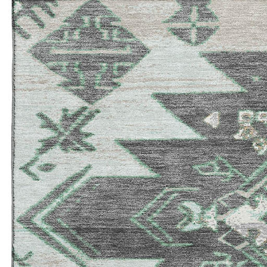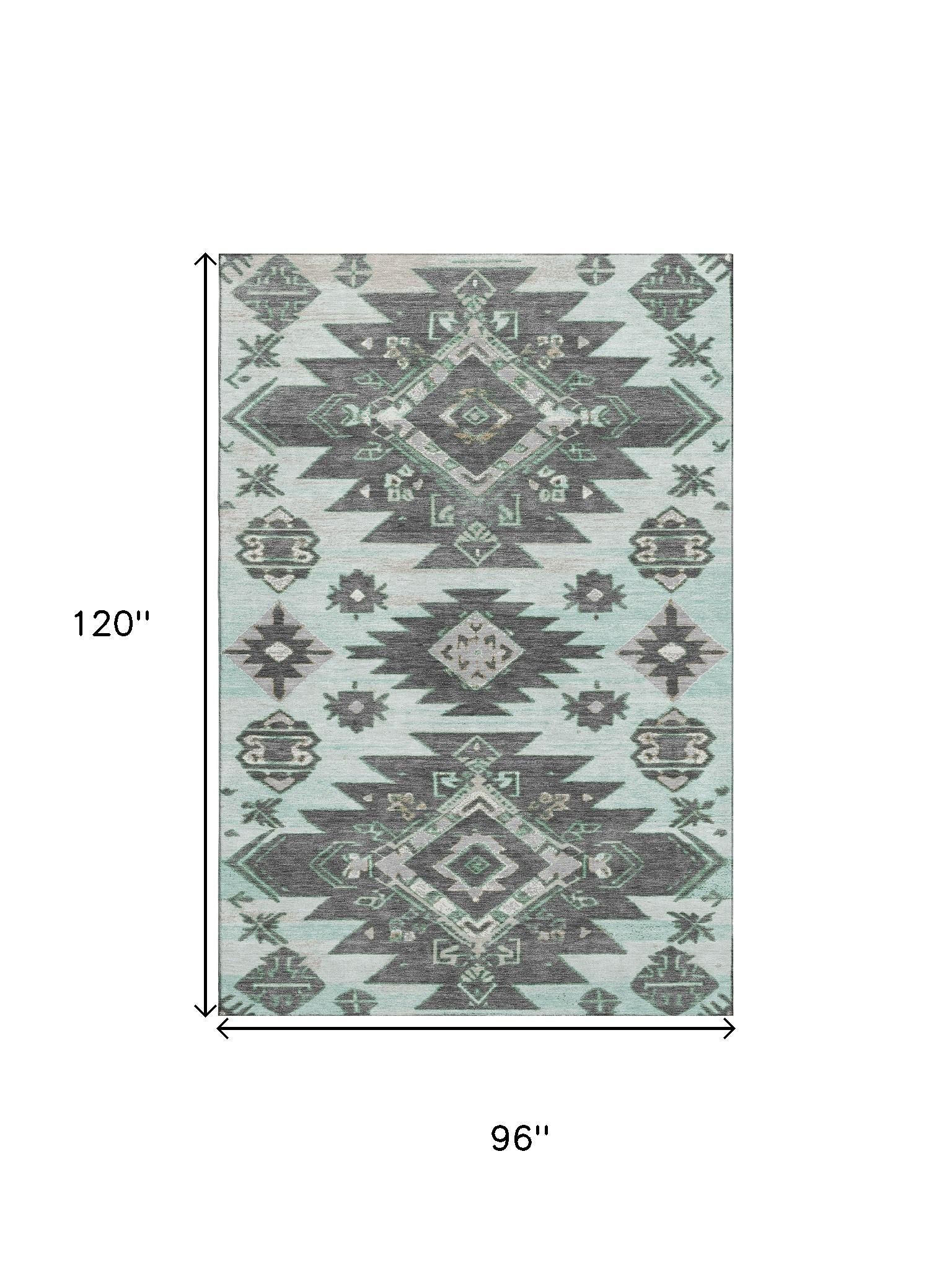 Add some artistry to your room with this 8-foot x 10-foot mint green charcoal and gray tribal washable area rug with uv protection. Ideal for spaces with kids and pets, this rug is stain resistant to help repel dirt and spilled liquids. Built to last, this rug crafted from polyester fibers is known for its durability and long lasting appeal. Rugs are a great way to showcase your style, hide imperfections, warm your home and reduce noise. This larger sized, transitional styled rug is ready to create a focal point or statement piece in your room. 96.00-inch h x 120.00-inch w x 0.39-inch d.