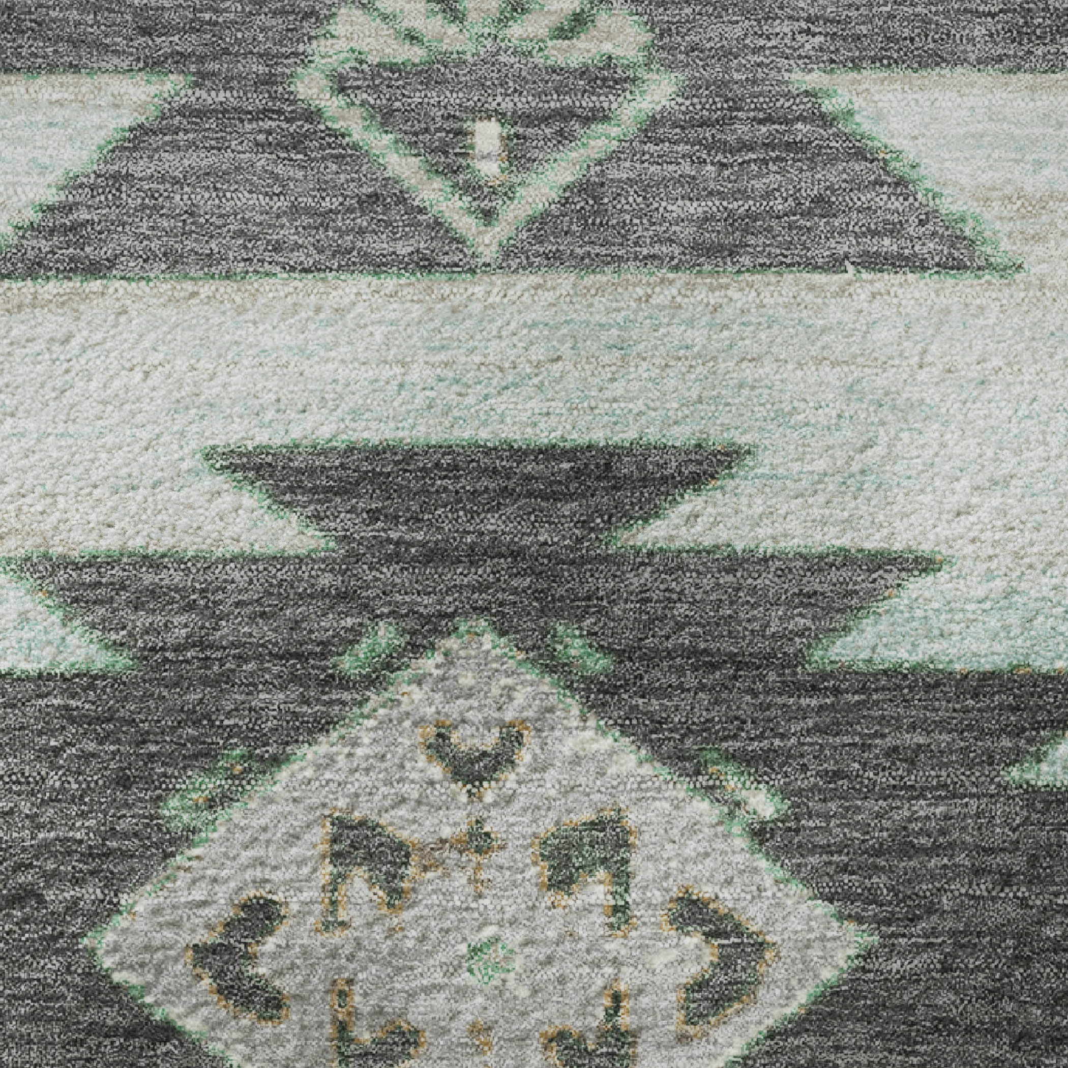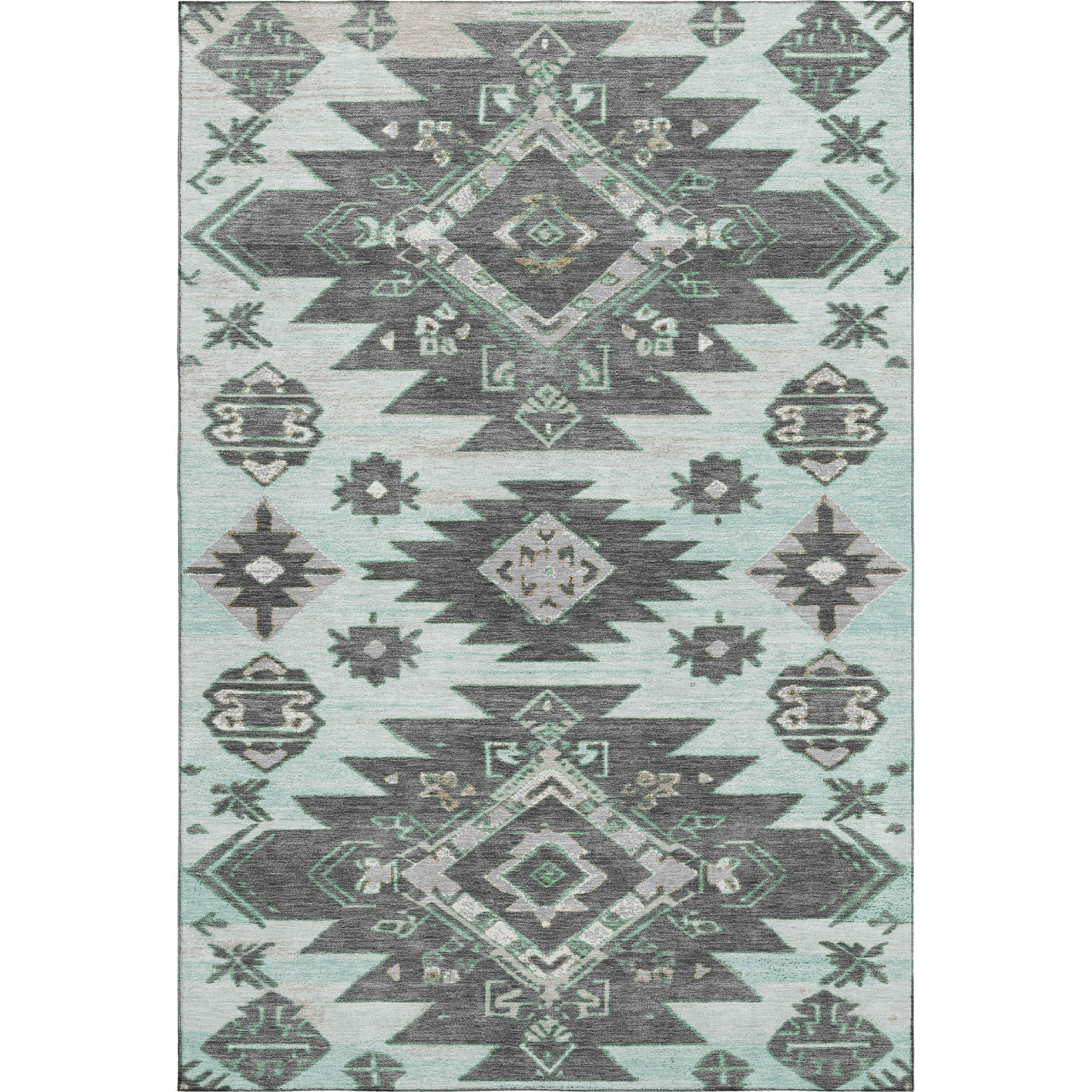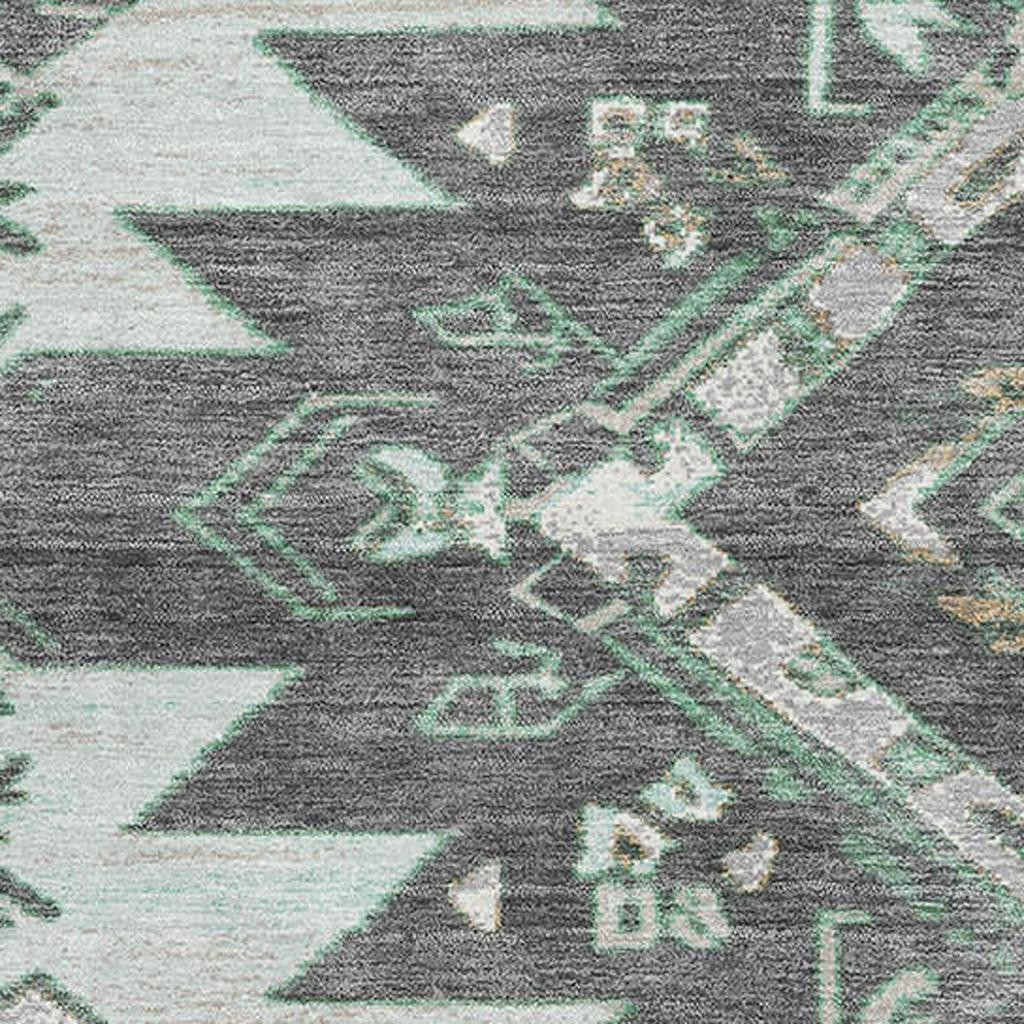 Set an inviting tone in your space with this 9-foot x 12-foot mint green charcoal and gray tribal washable area rug with uv protection. Ideal for spaces with kids and pets, this rug is stain resistant to help repel dirt and spilled liquids. Built to last, this rug crafted from polyester fibers is known for its durability and long lasting appeal. Rugs are a great way to showcase your style, hide imperfections, warm your home and reduce noise. This larger sized, transitional styled rug is ready to create a focal point or statement piece in your room. 108.00-inch h x 144.00-inch w x 0.39-inch d.