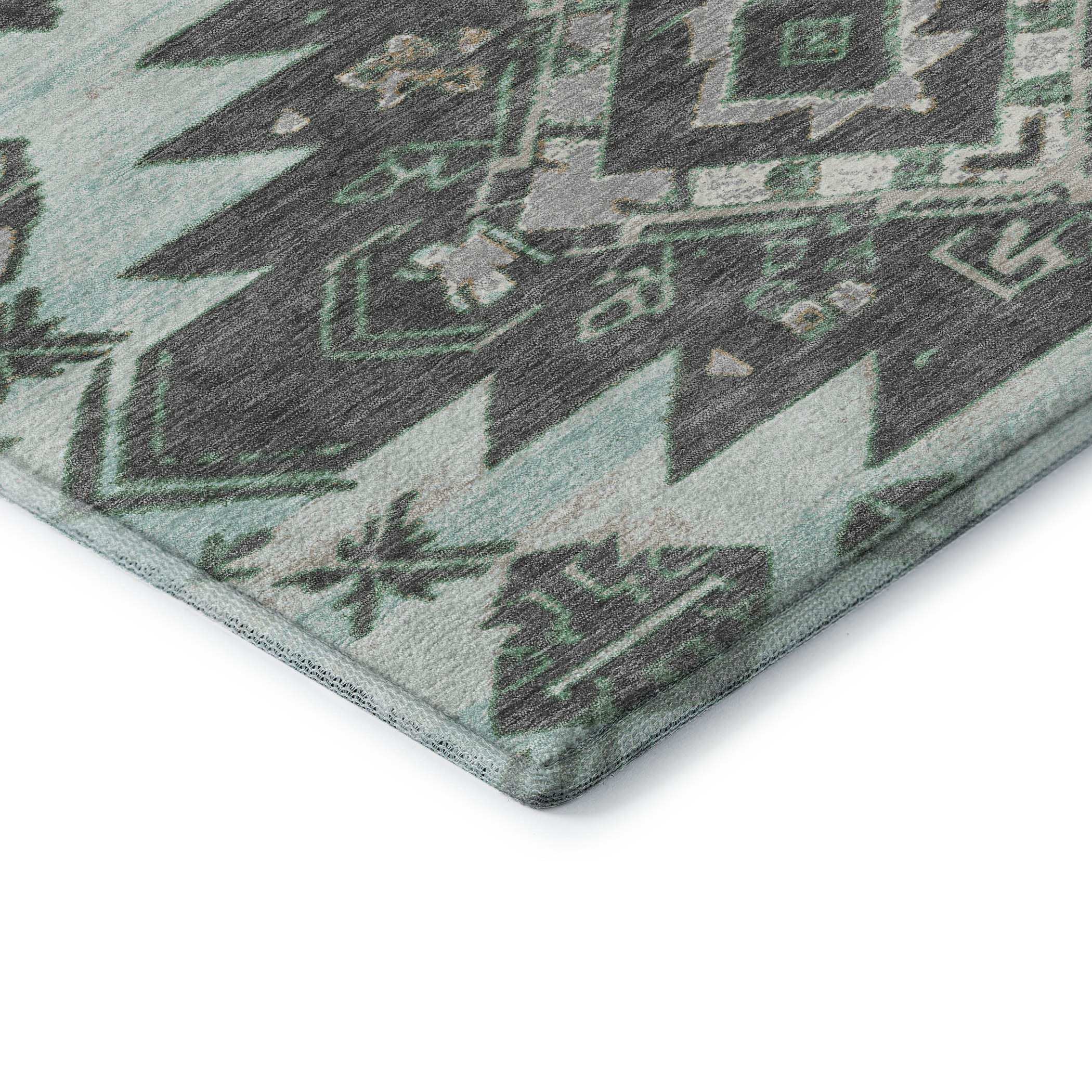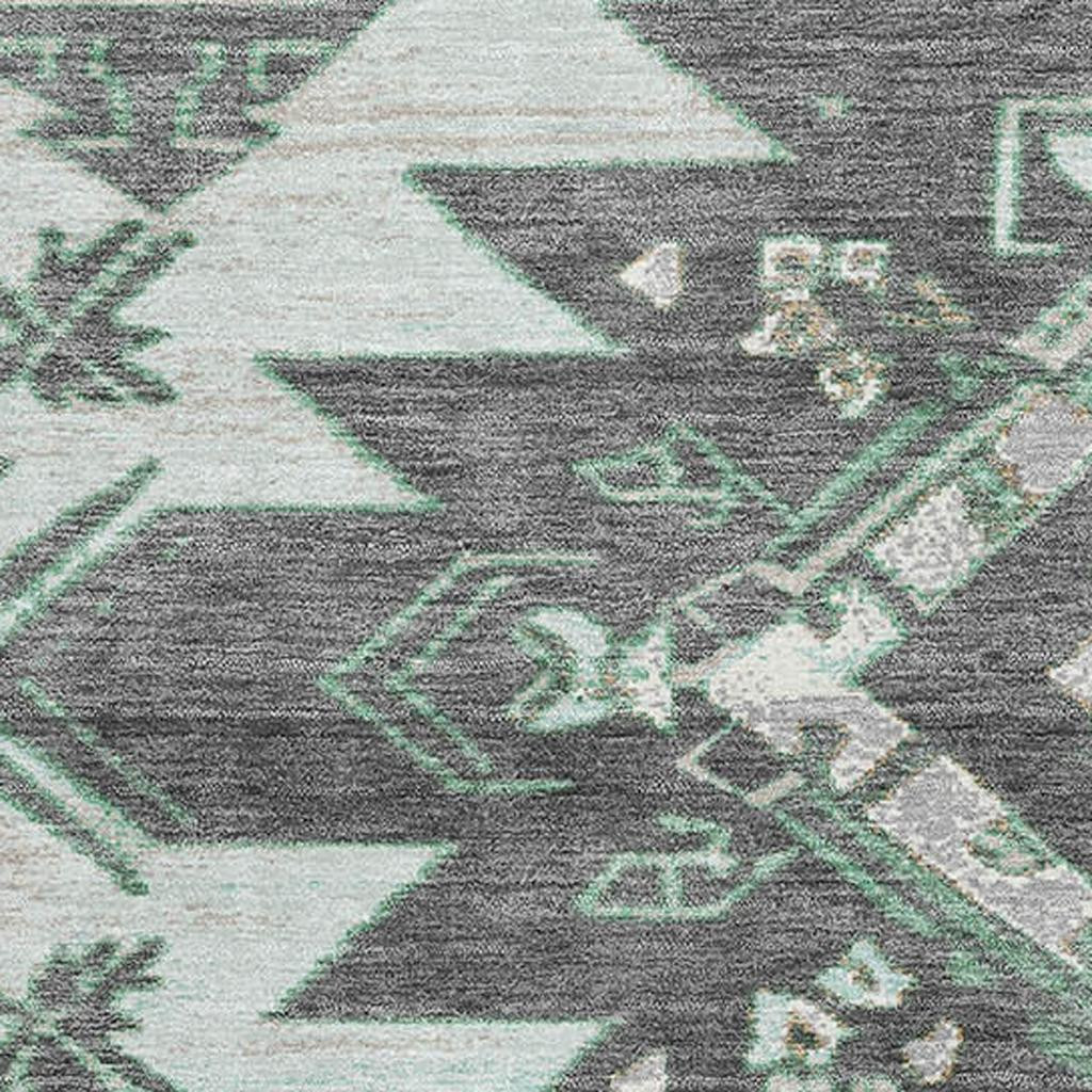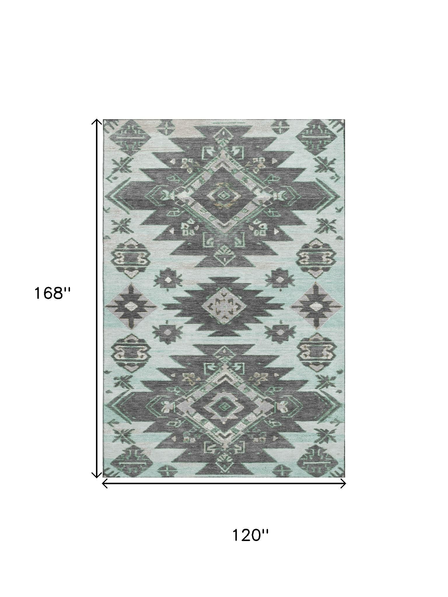 Add some artistry to your room with this 10-foot x 14-foot mint green charcoal and gray tribal washable area rug with uv protection. Ideal for spaces with kids and pets, this rug is stain resistant to help repel dirt and spilled liquids. Built to last, this rug crafted from polyester fibers is known for its durability and long lasting appeal. Rugs are a great way to showcase your style, hide imperfections, warm your home and reduce noise. This larger sized, transitional styled rug is ready to create a focal point or statement piece in your room. 120.00-inch h x 168.00-inch w x 0.39-inch d.