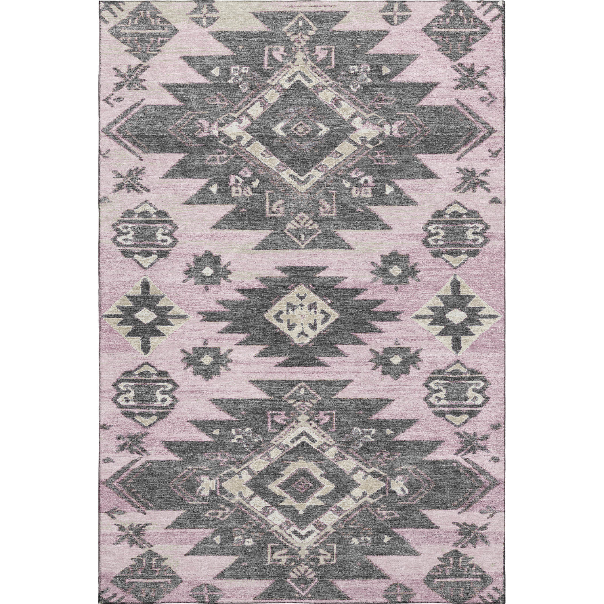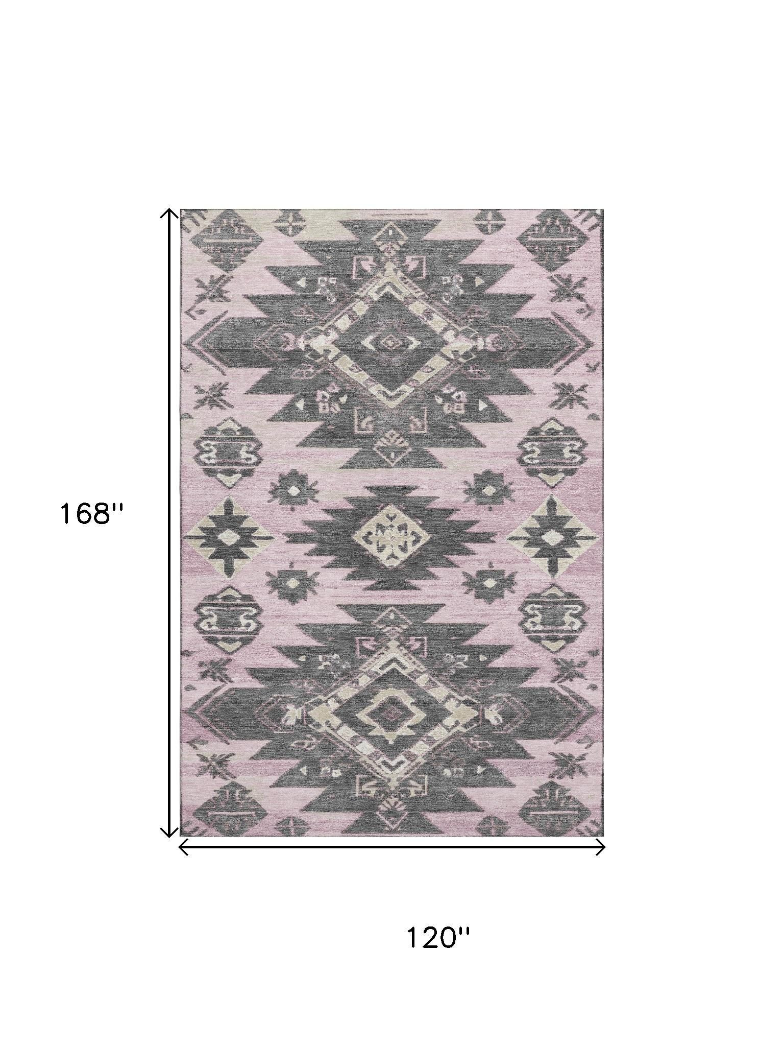 Set an inviting tone in your space with this 10-foot x 14-foot pink charcoal and gray tribal washable area rug with uv protection. Ideal for spaces with kids and pets, this rug is stain resistant to help repel dirt and spilled liquids. Built to last, this rug crafted from polyester fibers is known for its durability and long lasting appeal. Rugs are a great way to showcase your style, hide imperfections, warm your home and reduce noise. This larger sized, transitional styled rug is ready to create a focal point or statement piece in your room. 120.00-inch h x 168.00-inch w x 0.39-inch d.