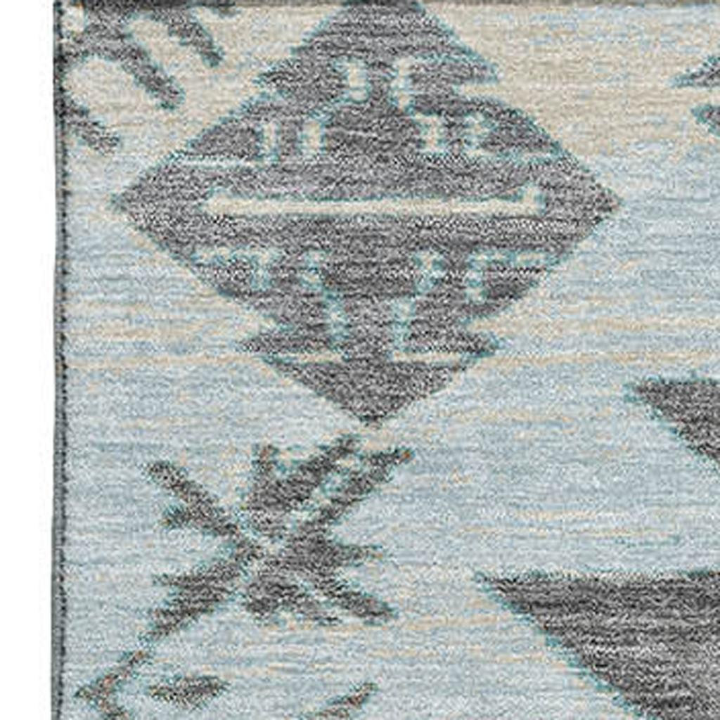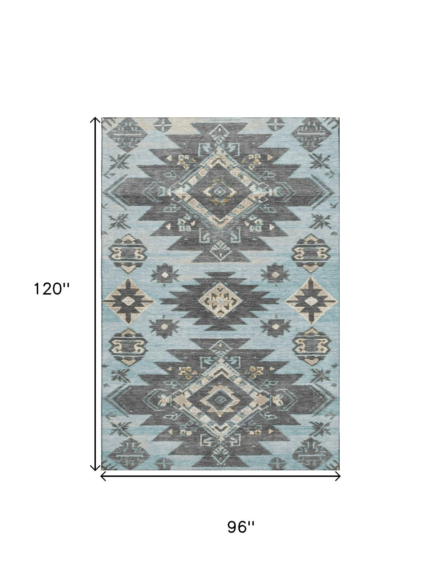 This 8-foot x 10-foot teal charcoal and gray tribal washable area rug with uv protection, is a great way to add warmth to a room. Ideal for spaces with kids and pets, this rug is stain resistant to help repel dirt and spilled liquids. Built to last, this rug crafted from polyester fibers is known for its durability and long lasting appeal. Rugs are a great way to showcase your style, hide imperfections, warm your home and reduce noise. This larger sized, transitional styled rug is ready to create a focal point or statement piece in your room. 96.00-inch h x 120.00-inch w x 0.39-inch d.