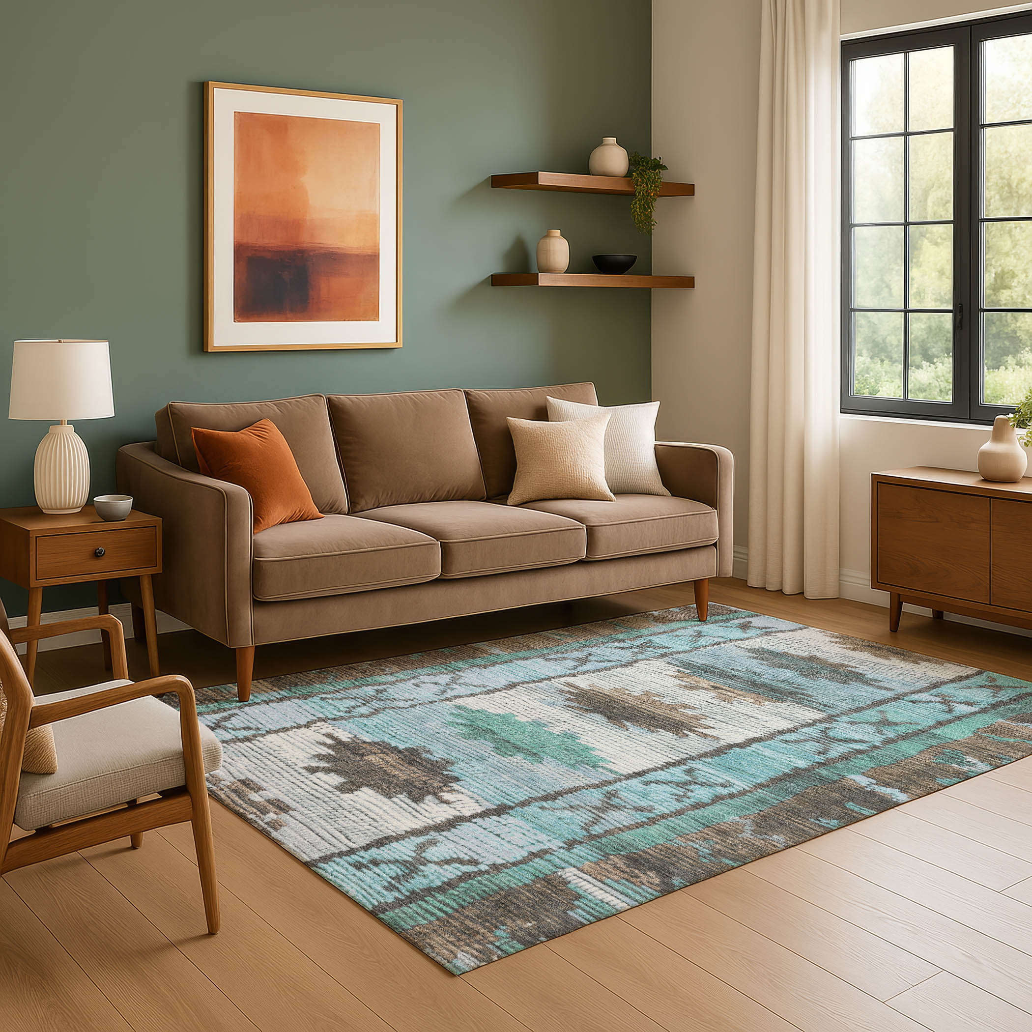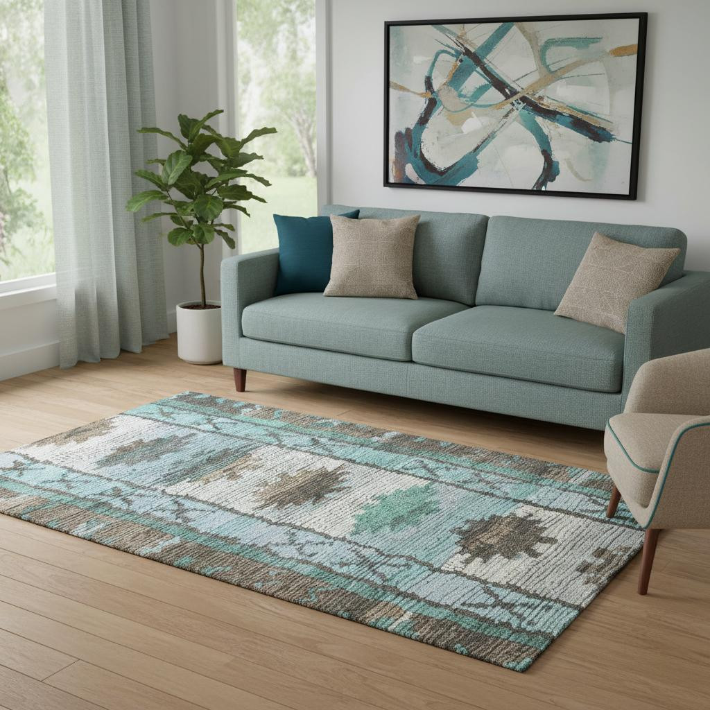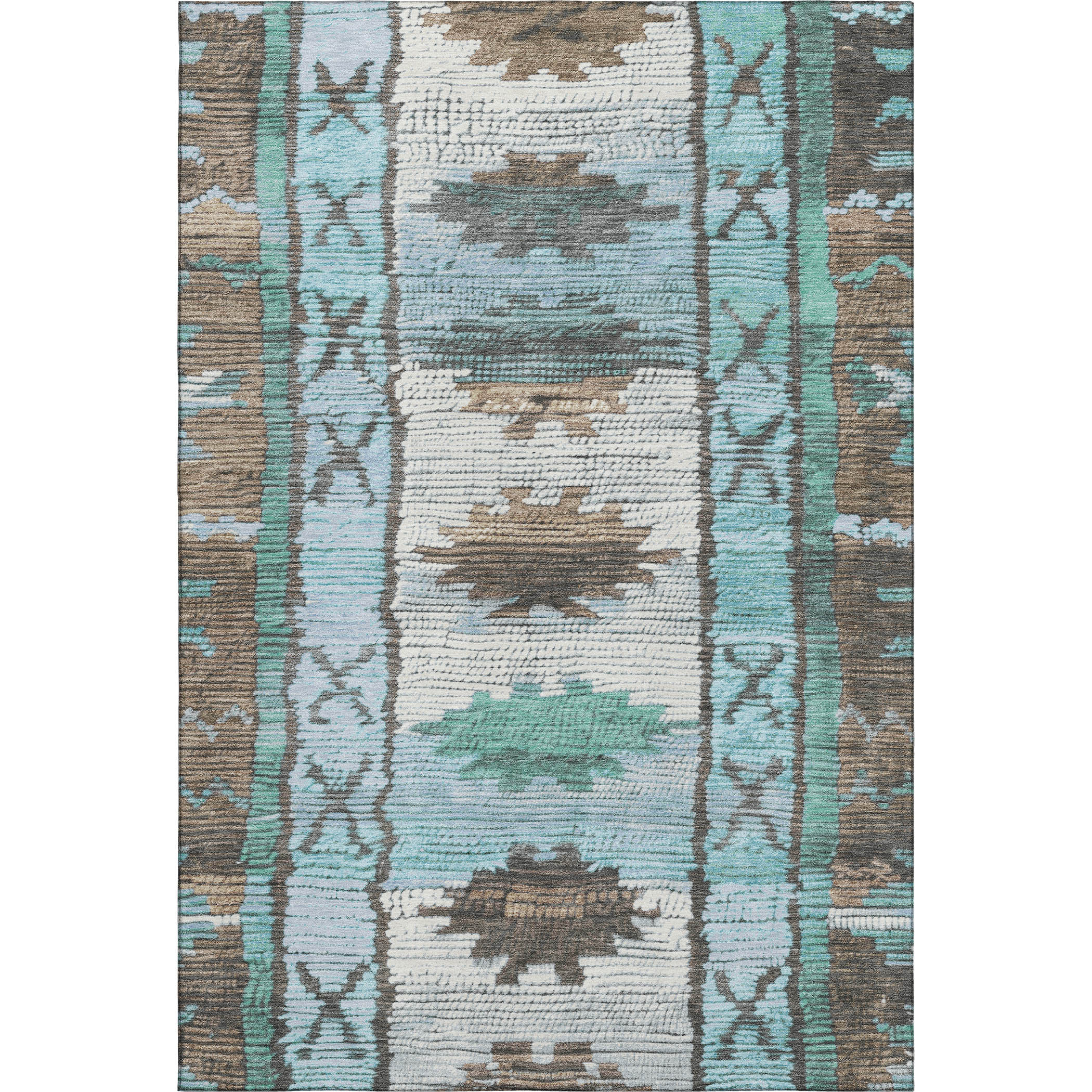 This 5-foot x 8-foot brown teal and ivory tribal washable area rug with uv protection, is a great way to add warmth to a room. Ideal for spaces with kids and pets, this rug is stain resistant to help repel dirt and spilled liquids. Built to last, this rug crafted from polyester fibers is known for its durability and long lasting appeal. Rugs are a great way to showcase your style, hide imperfections, warm your home and reduce noise. This larger sized, transitional styled rug is ready to create a focal point or statement piece in your room. 60.00-inch h x 90.00-inch w x 0.39-inch d.