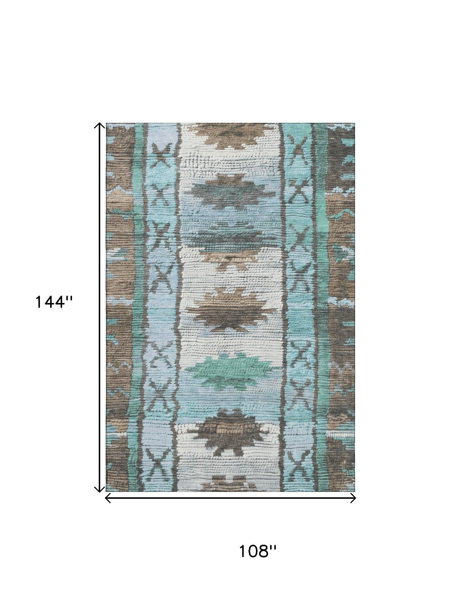 This 9-foot x 12-foot brown teal and ivory tribal washable area rug with uv protection, is a great way to add warmth to a room. Ideal for spaces with kids and pets, this rug is stain resistant to help repel dirt and spilled liquids. Built to last, this rug crafted from polyester fibers is known for its durability and long lasting appeal. Rugs are a great way to showcase your style, hide imperfections, warm your home and reduce noise. This larger sized, transitional styled rug is ready to create a focal point or statement piece in your room. 108.00-inch h x 144.00-inch w x 0.39-inch d.