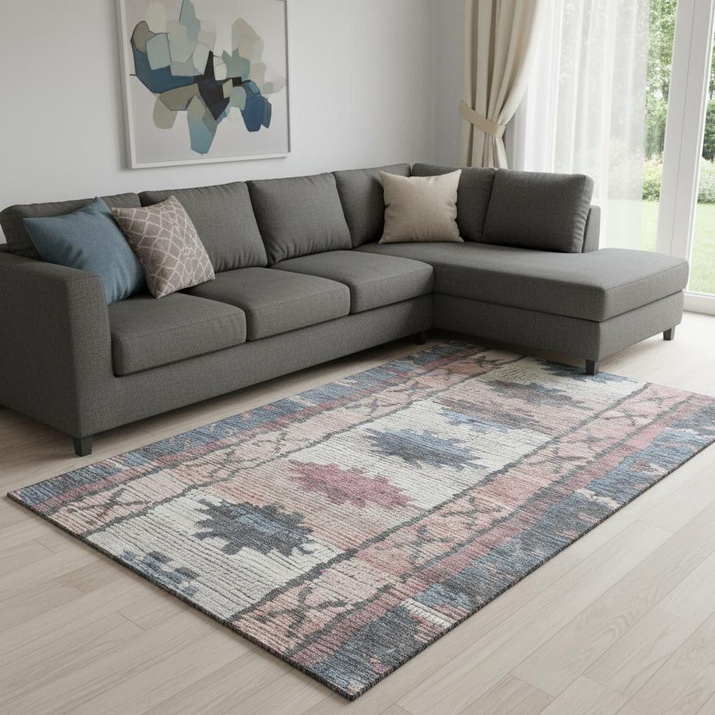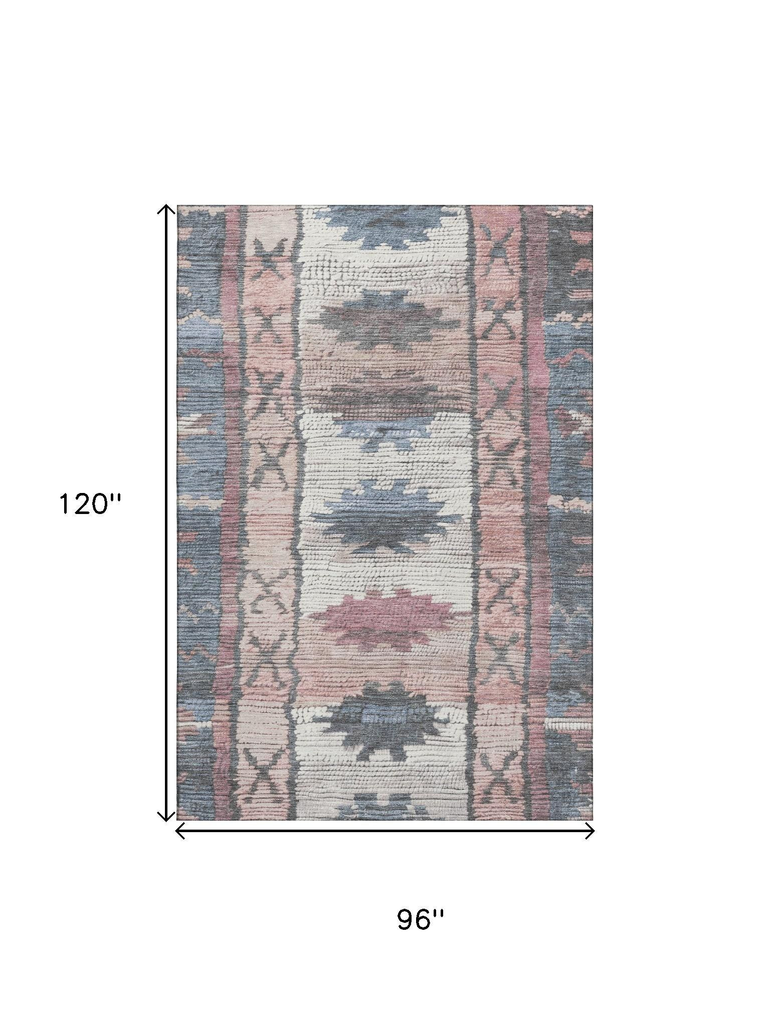 Add great coloration and comfortable texture to your space with this 8-foot x 10-foot denim blue blush and ivory tribal washable area rug with uv protection. Ideal for spaces with kids and pets, this rug is stain resistant to help repel dirt and spilled liquids. Built to last, this rug crafted from polyester fibers is known for its durability and long lasting appeal. Rugs are a great way to showcase your style, hide imperfections, warm your home and reduce noise. This larger sized, transitional styled rug is ready to create a focal point or statement piece in your room. 96.00-inch h x 120.00-inch w x 0.39-inch d.