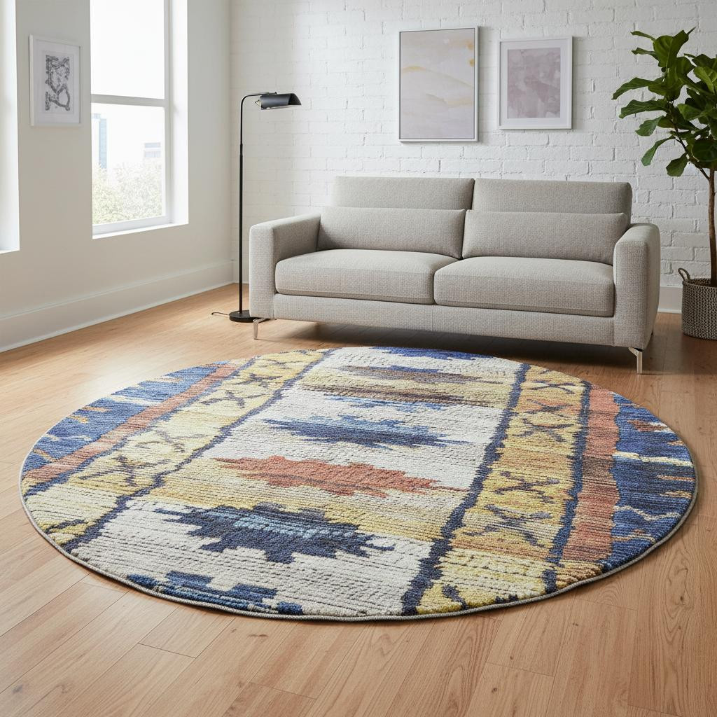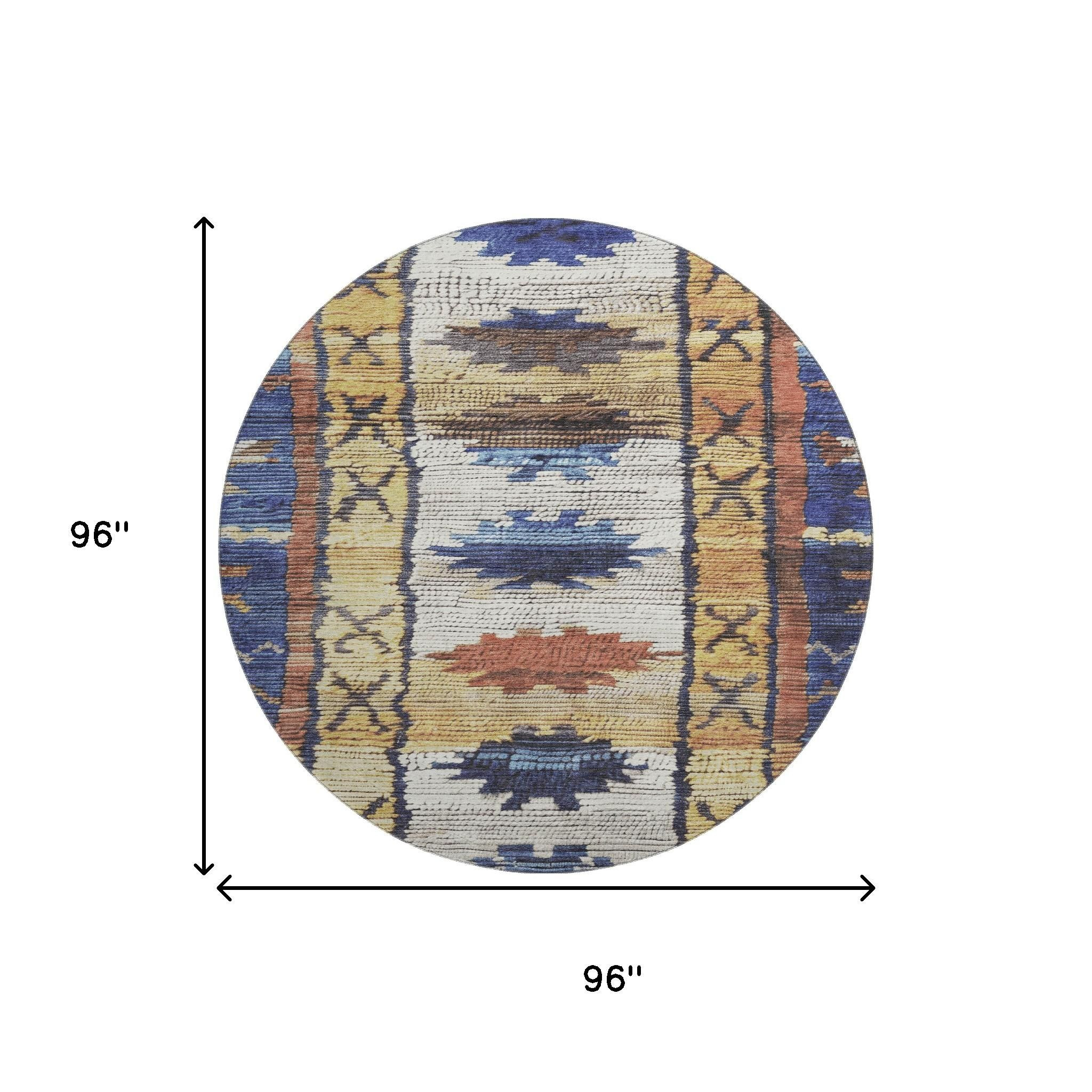 Add some artistry to your room with this 8-foot gold copper and ivory tribal washable round rug with uv protection. Ideal for spaces with kids and pets, this rug is stain resistant to help repel dirt and spilled liquids. Built to last, this rug crafted from polyester fibers is known for its durability and long lasting appeal. Rugs are a great way to showcase your style, hide imperfections, warm your home and reduce noise. This larger sized, transitional styled rug is ready to create a focal point or statement piece in your room. 96.00-inch h x 96.00-inch w x 0.39-inch d.