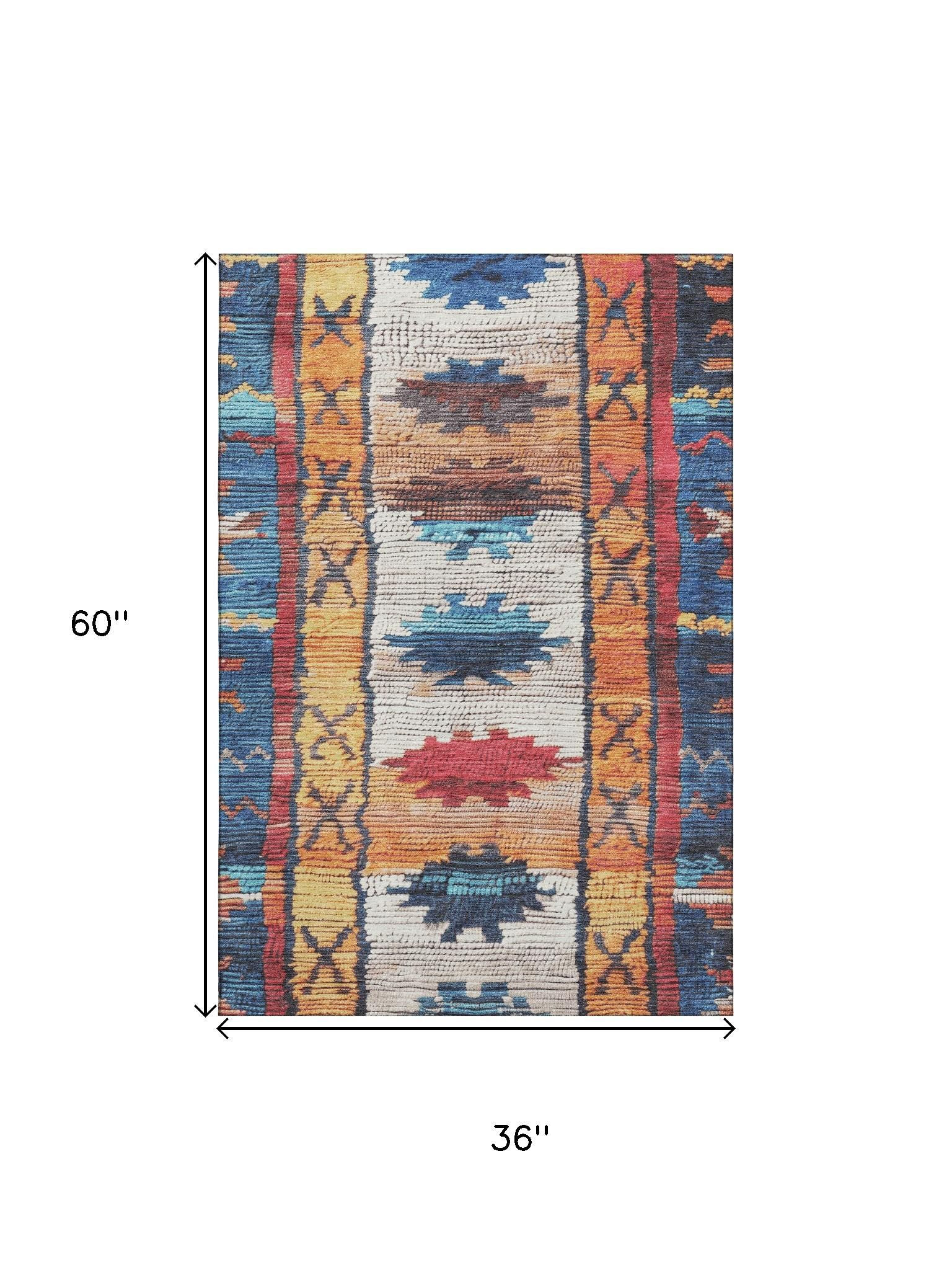 Set an inviting tone in your space with this 3-foot x 5-foot navy blue orange and red tribal washable area rug with uv protection. Ideal for spaces with kids and pets, this rug is stain resistant to help repel dirt and spilled liquids. Built to last, this rug crafted from polyester fibers is known for its durability and long lasting appeal. Rugs are a great way to showcase your style, hide imperfections, warm your home and reduce noise. This smaller sized, transitional styled rug is just what you need for your walkway, bedside, in front of door, cabinet, refrigerator, or chair. 36.00-inch h x 60.00-inch w x 0.39-inch d.