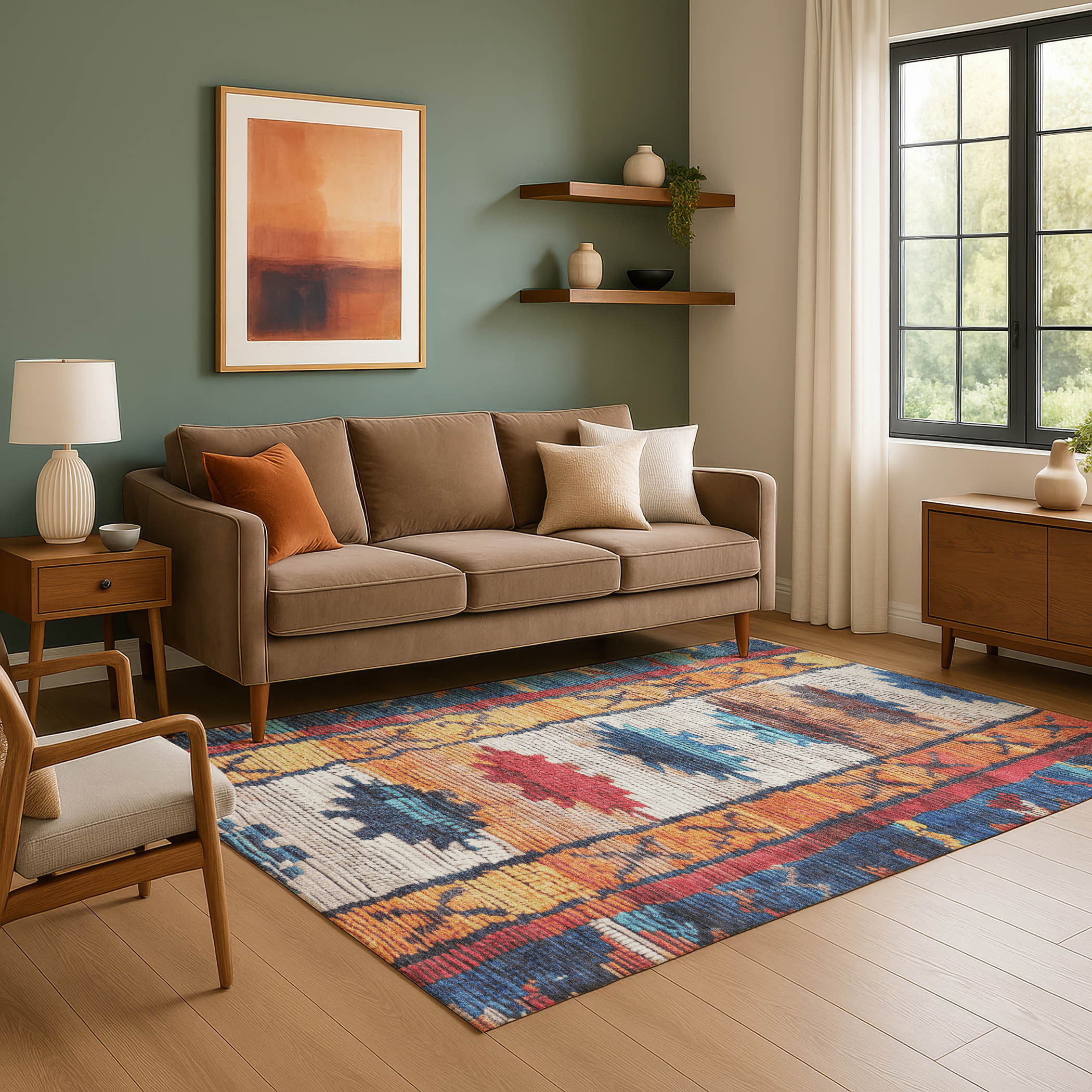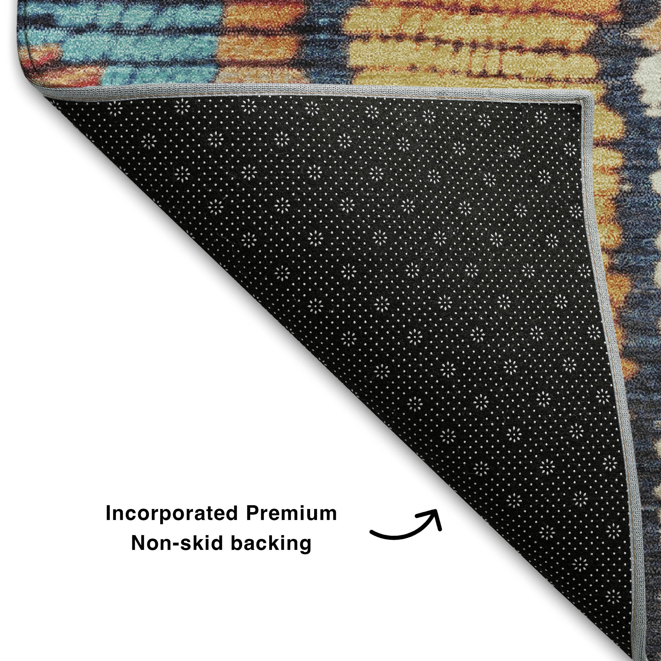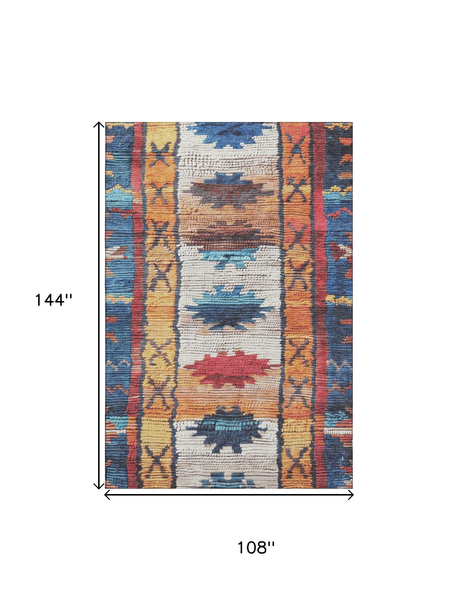 Add great coloration and comfortable texture to your space with this 9-foot x 12-foot navy blue orange and red tribal washable area rug with uv protection. Ideal for spaces with kids and pets, this rug is stain resistant to help repel dirt and spilled liquids. Built to last, this rug crafted from polyester fibers is known for its durability and long lasting appeal. Rugs are a great way to showcase your style, hide imperfections, warm your home and reduce noise. This larger sized, transitional styled rug is ready to create a focal point or statement piece in your room. 108.00-inch h x 144.00-inch w x 0.39-inch d.