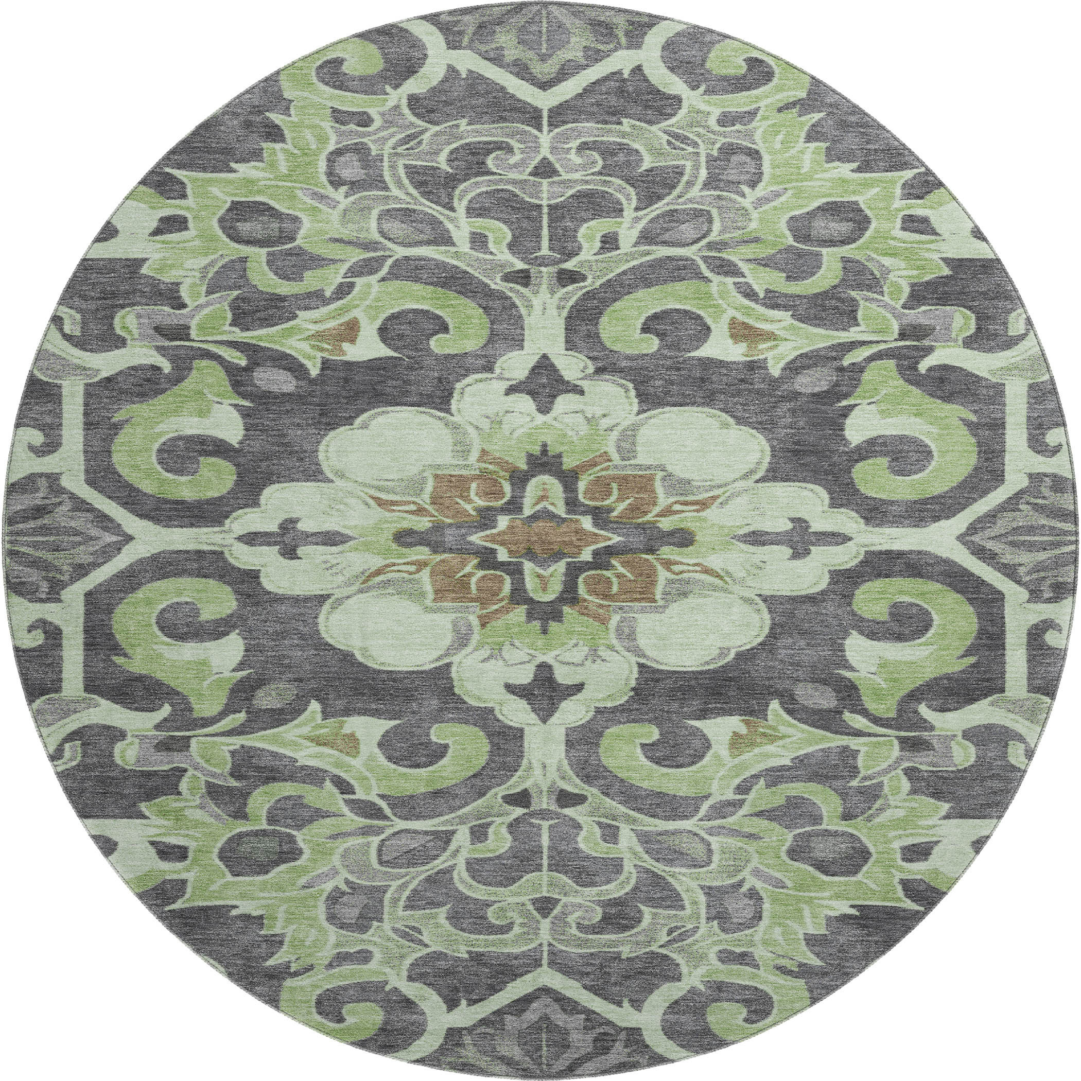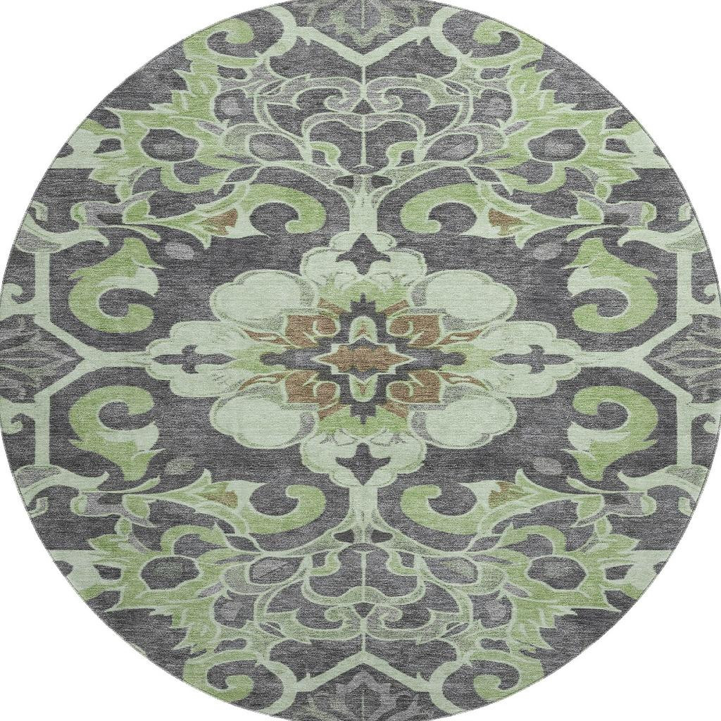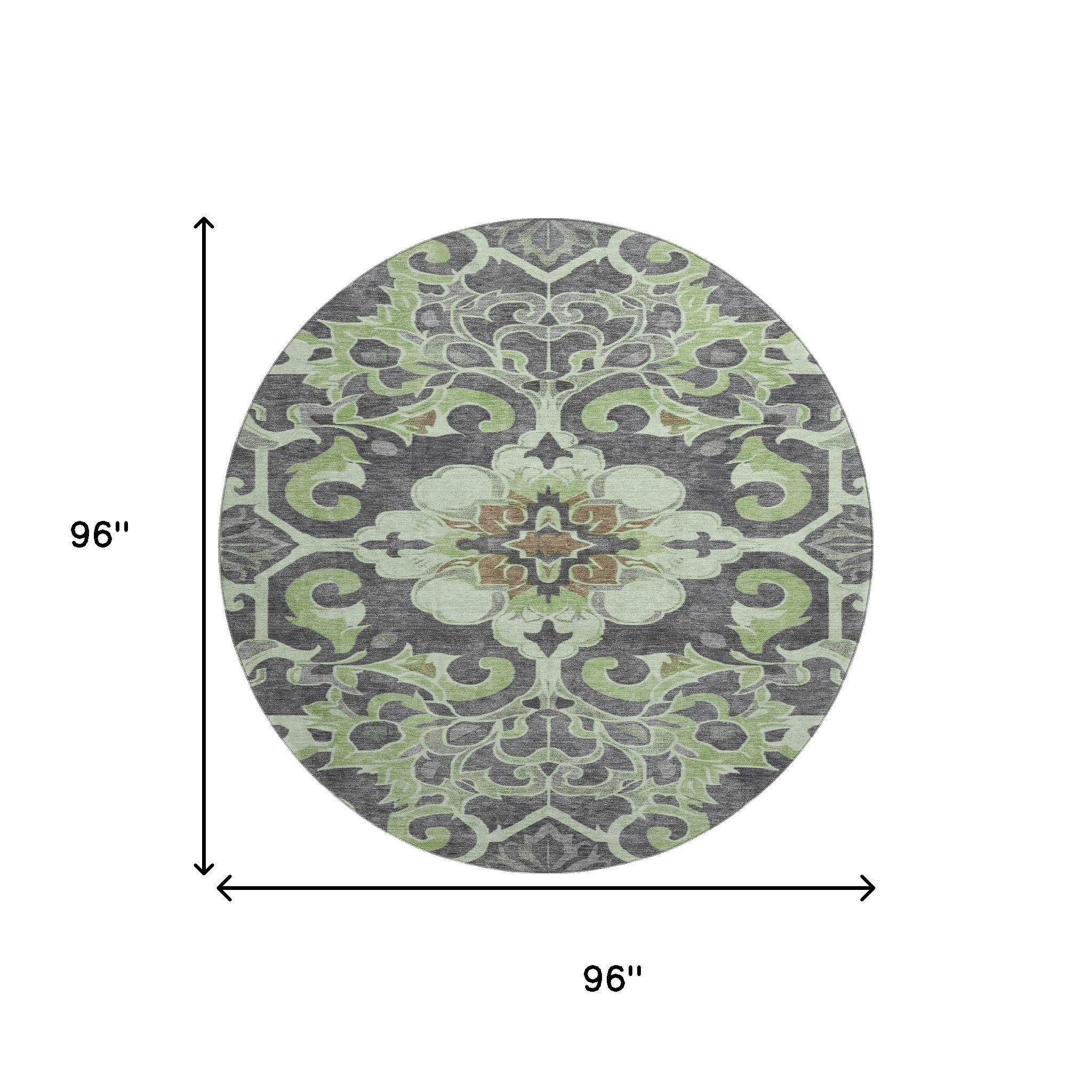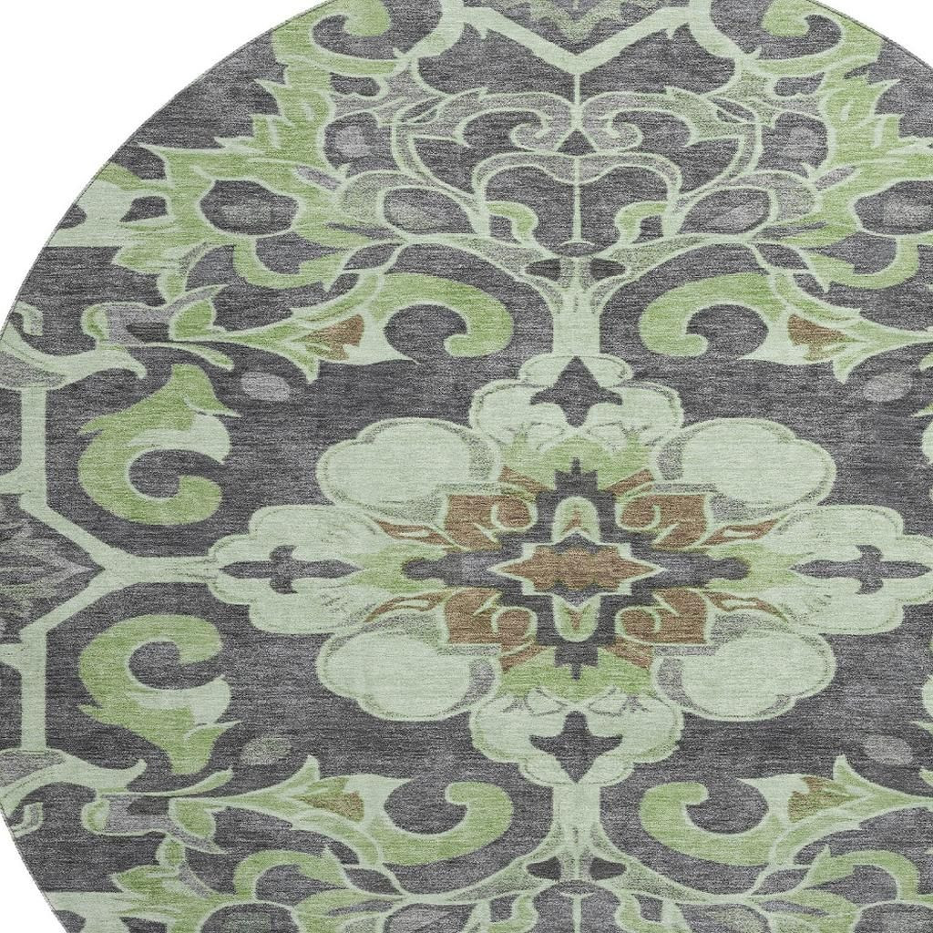 Set an inviting tone in your space with this 8-foot artichoke green charcoal and gray floral medallion washable round rug with uv protection. Ideal for spaces with kids and pets, this rug is stain resistant to help repel dirt and spilled liquids. Built to last, this rug crafted from polyester fibers is known for its durability and long lasting appeal. Rugs are a great way to showcase your style, hide imperfections, warm your home and reduce noise. This larger sized, traditional styled rug is ready to create a focal point or statement piece in your room. 96.00-inch h x 96.00-inch w x 0.39-inch d.