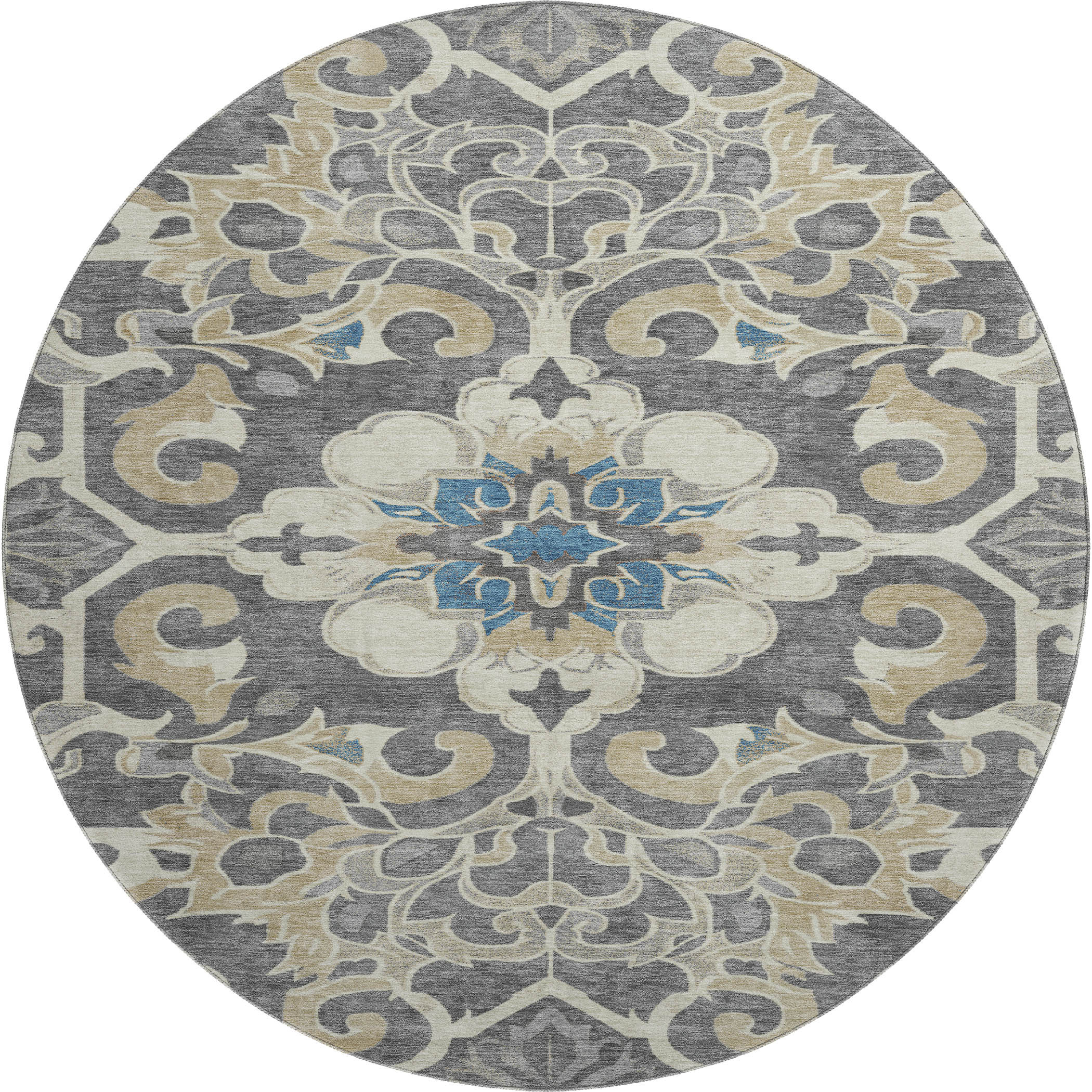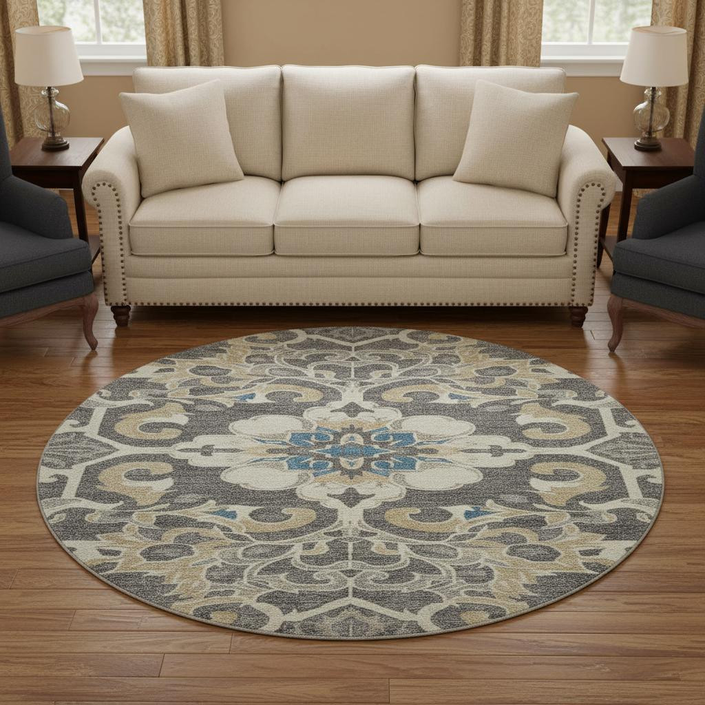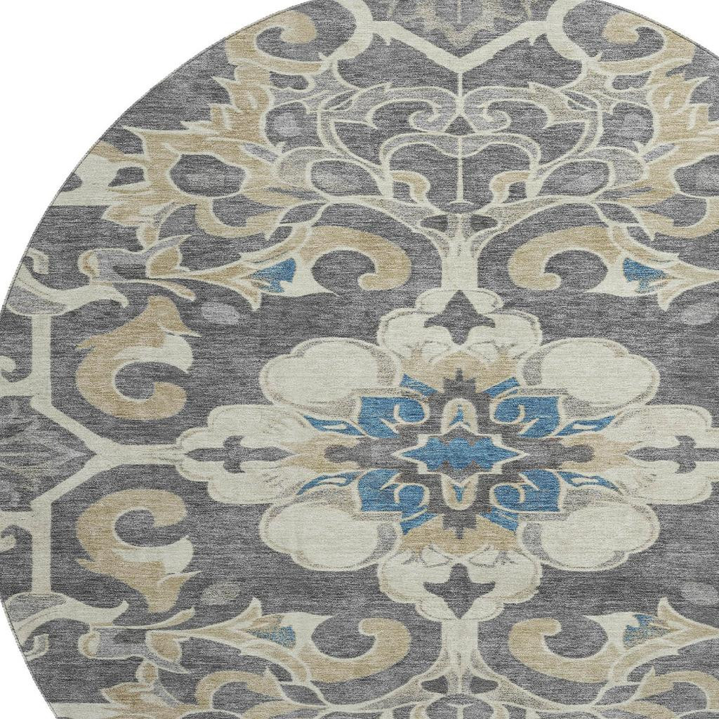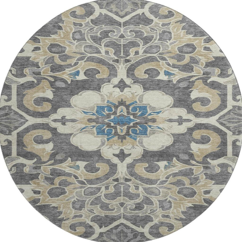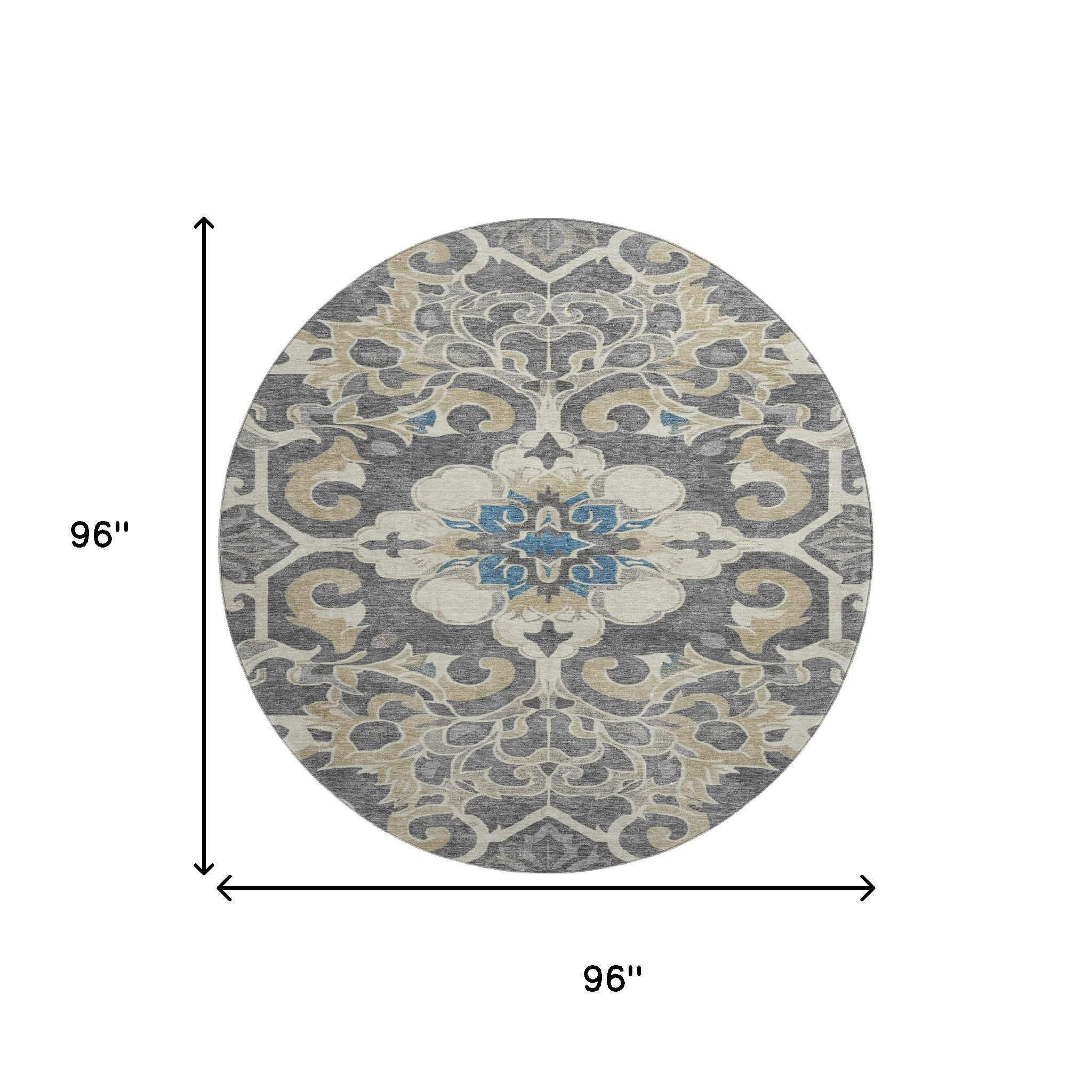 Set an inviting tone in your space with this 8-foot beige charcoal and blue floral medallion washable round rug with uv protection. Ideal for spaces with kids and pets, this rug is stain resistant to help repel dirt and spilled liquids. Built to last, this rug crafted from polyester fibers is known for its durability and long lasting appeal. Rugs are a great way to showcase your style, hide imperfections, warm your home and reduce noise. This larger sized, traditional styled rug is ready to create a focal point or statement piece in your room. 96.00-inch h x 96.00-inch w x 0.39-inch d.
