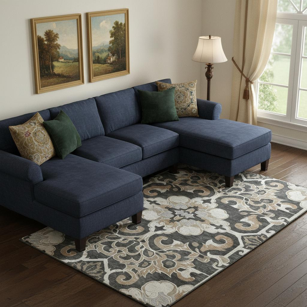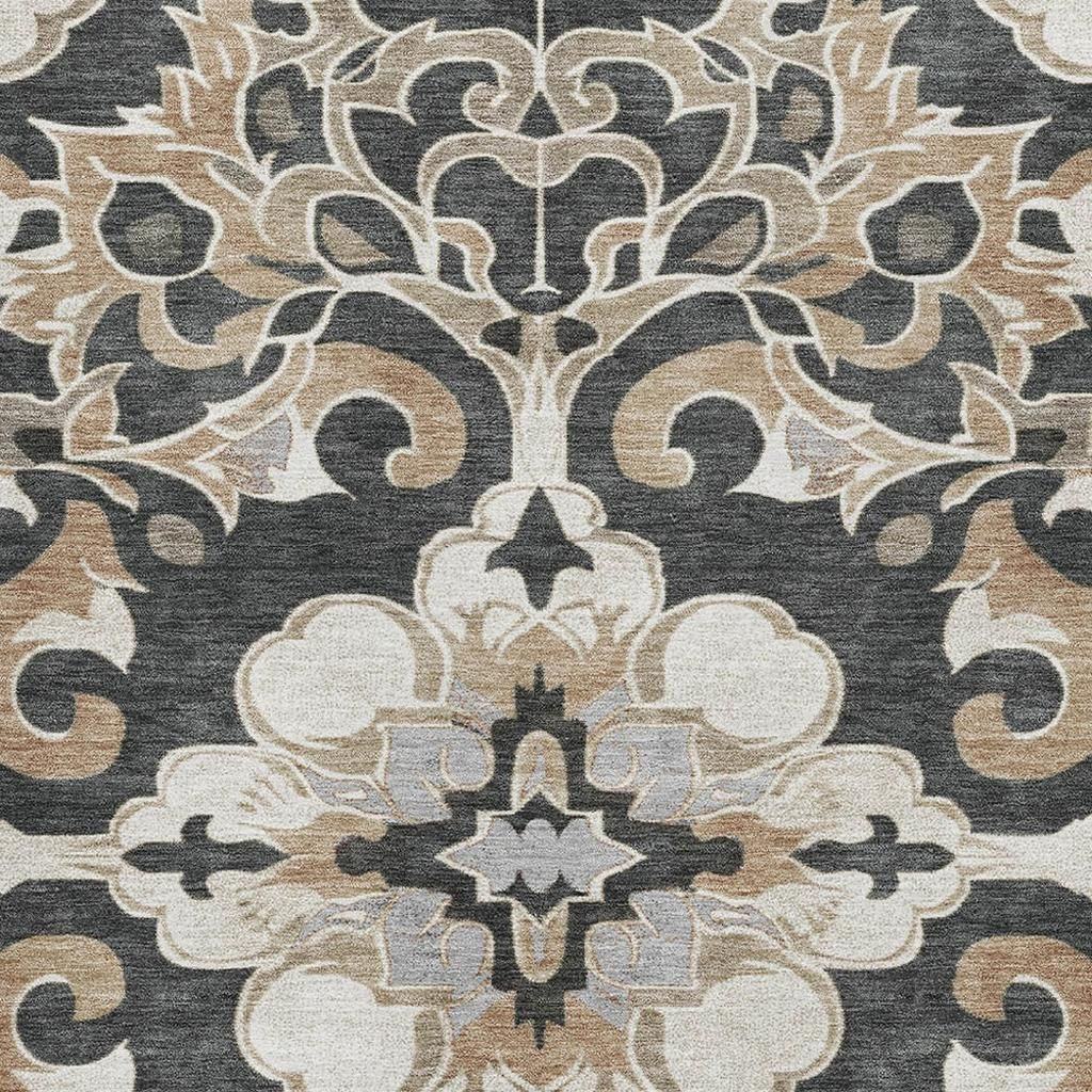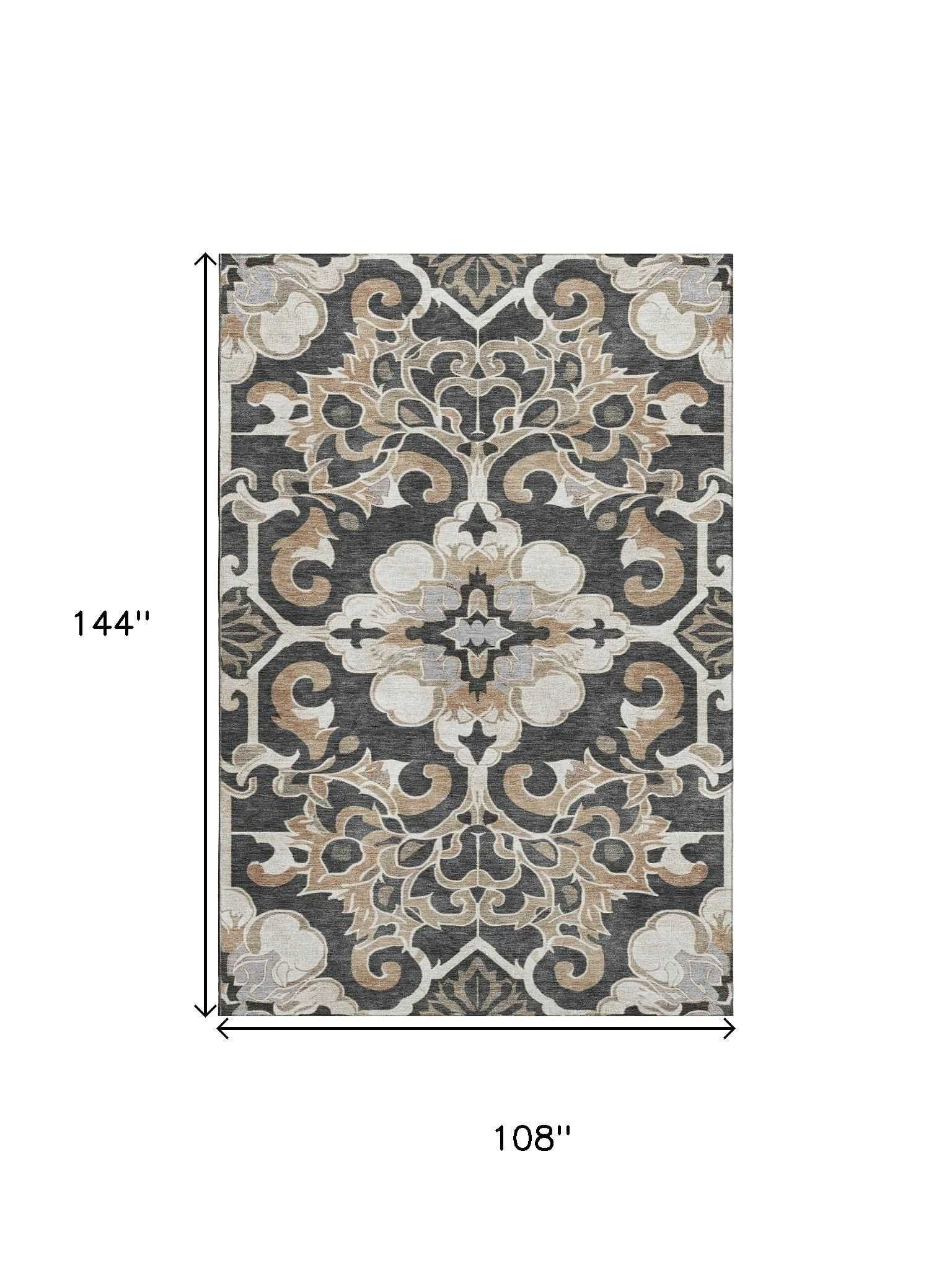 This 9-foot x 12-foot charcoal taupe and ivory floral medallion washable area rug with uv protection, is a great way to add warmth to a room. Ideal for spaces with kids and pets, this rug is stain resistant to help repel dirt and spilled liquids. Built to last, this rug crafted from polyester fibers is known for its durability and long lasting appeal. Rugs are a great way to showcase your style, hide imperfections, warm your home and reduce noise. This larger sized, traditional styled rug is ready to create a focal point or statement piece in your room. 108.00-inch h x 144.00-inch w x 0.39-inch d.
