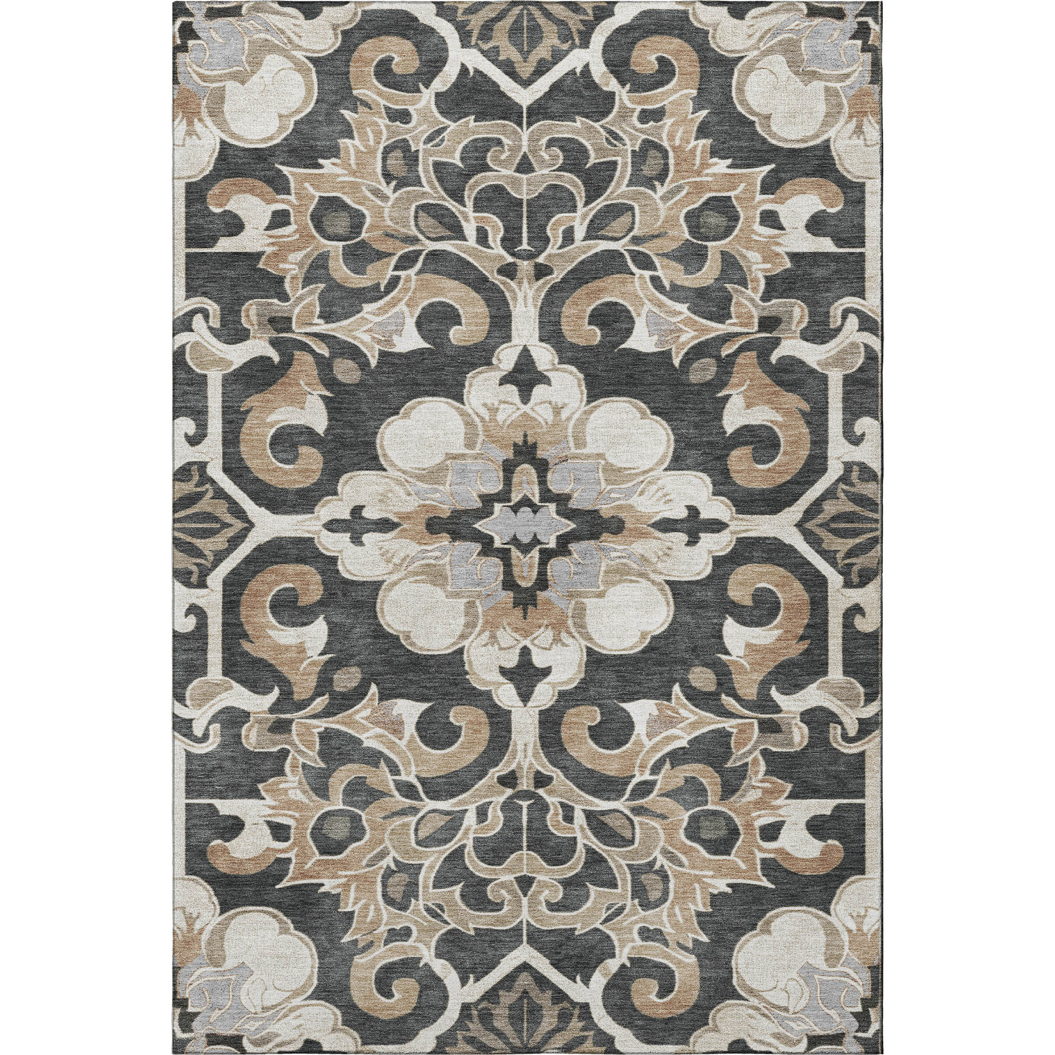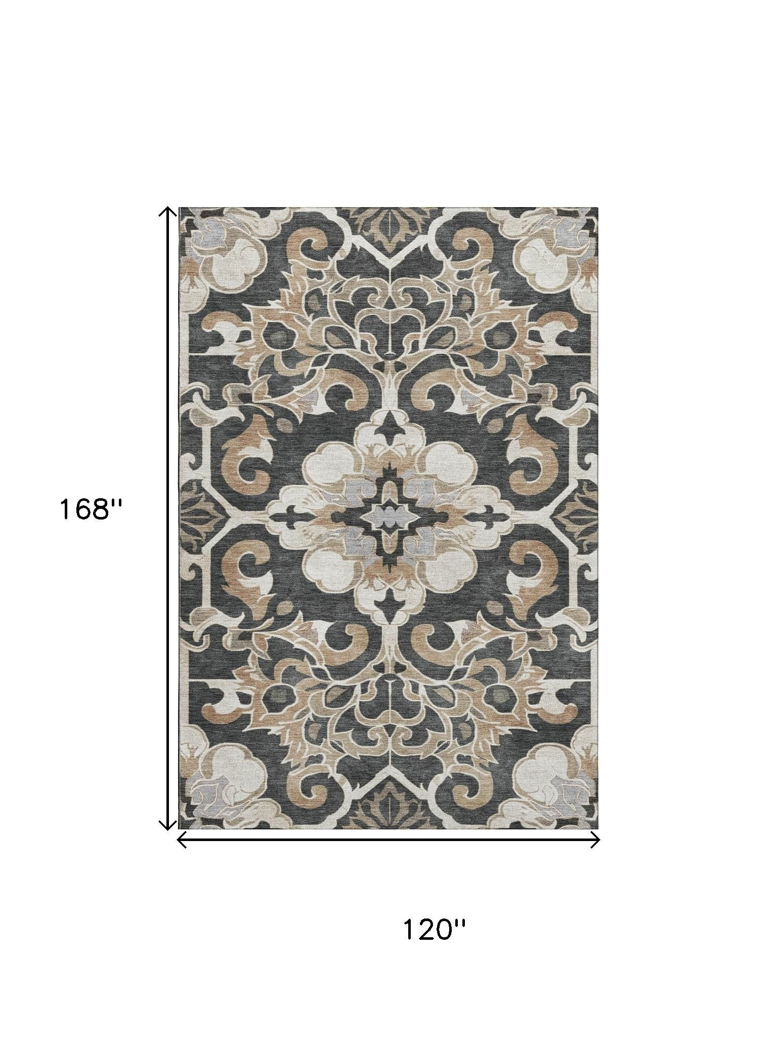 This 10-foot x 14-foot charcoal taupe and ivory floral medallion washable area rug with uv protection, is a great way to add warmth to a room. Ideal for spaces with kids and pets, this rug is stain resistant to help repel dirt and spilled liquids. Built to last, this rug crafted from polyester fibers is known for its durability and long lasting appeal. Rugs are a great way to showcase your style, hide imperfections, warm your home and reduce noise. This larger sized, traditional styled rug is ready to create a focal point or statement piece in your room. 120.00-inch h x 168.00-inch w x 0.39-inch d.
