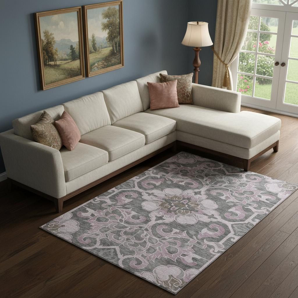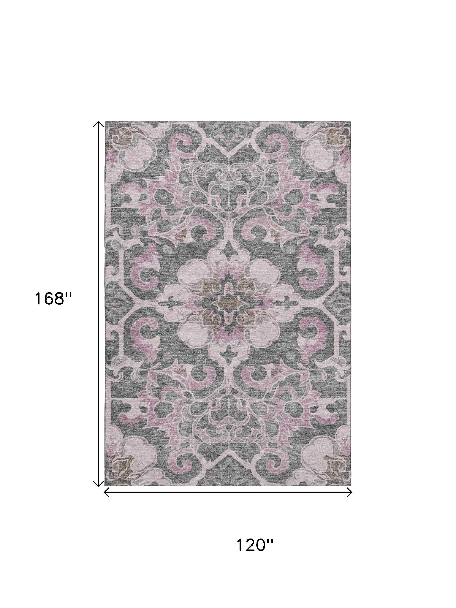 Add some artistry to your room with this 10-foot x 14-foot pink ivory and gray floral medallion washable area rug with uv protection. Ideal for spaces with kids and pets, this rug is stain resistant to help repel dirt and spilled liquids. Built to last, this rug crafted from polyester fibers is known for its durability and long lasting appeal. Rugs are a great way to showcase your style, hide imperfections, warm your home and reduce noise. This larger sized, traditional styled rug is ready to create a focal point or statement piece in your room. 120.00-inch h x 168.00-inch w x 0.39-inch d.