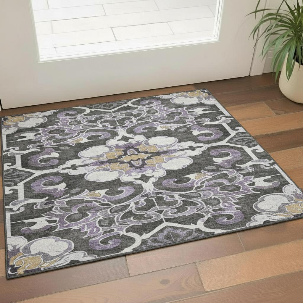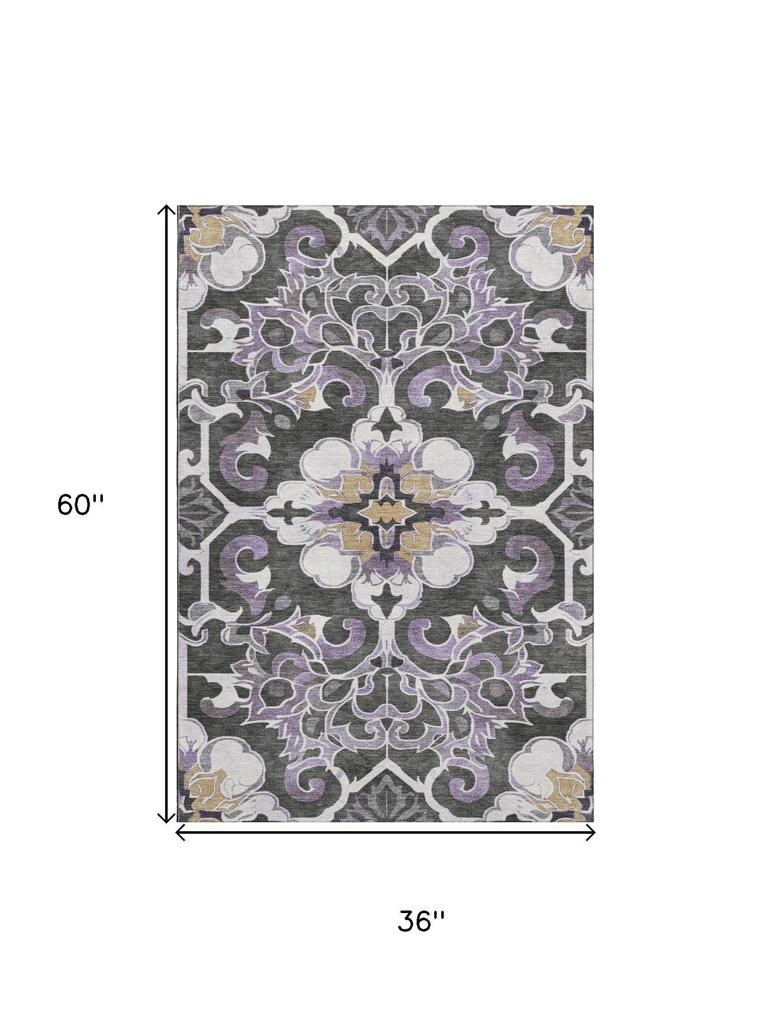 Add some artistry to your room with this 3-foot x 5-foot purple ivory and charcoal floral medallion washable area rug with uv protection. Ideal for spaces with kids and pets, this rug is stain resistant to help repel dirt and spilled liquids. Built to last, this rug crafted from polyester fibers is known for its durability and long lasting appeal. Rugs are a great way to showcase your style, hide imperfections, warm your home and reduce noise. This smaller sized, traditional styled rug is just what you need for your walkway, bedside, in front of door, cabinet, refrigerator, or chair. 36.00-inch h x 60.00-inch w x 0.39-inch d.