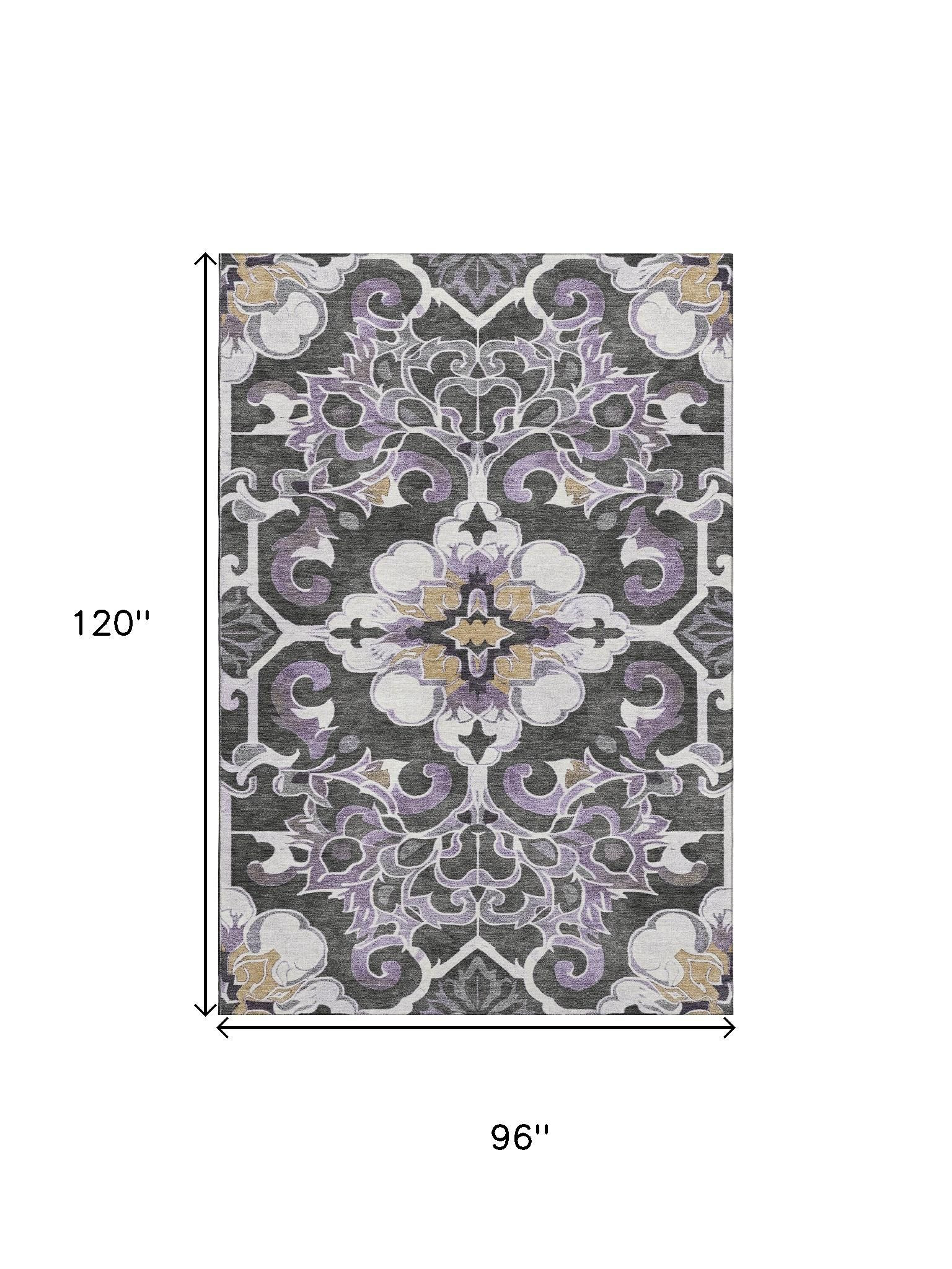 Add great coloration and comfortable texture to your space with this 8-foot x 10-foot purple ivory and charcoal floral medallion washable area rug with uv protection. Ideal for spaces with kids and pets, this rug is stain resistant to help repel dirt and spilled liquids. Built to last, this rug crafted from polyester fibers is known for its durability and long lasting appeal. Rugs are a great way to showcase your style, hide imperfections, warm your home and reduce noise. This larger sized, traditional styled rug is ready to create a focal point or statement piece in your room. 96.00-inch h x 120.00-inch w x 0.39-inch d.