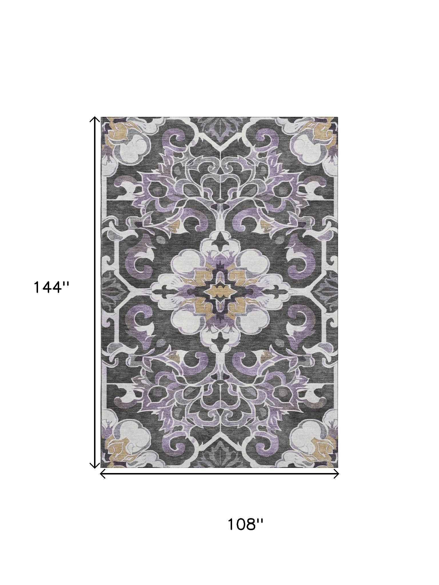 Add some artistry to your room with this 9-foot x 12-foot purple ivory and charcoal floral medallion washable area rug with uv protection. Ideal for spaces with kids and pets, this rug is stain resistant to help repel dirt and spilled liquids. Built to last, this rug crafted from polyester fibers is known for its durability and long lasting appeal. Rugs are a great way to showcase your style, hide imperfections, warm your home and reduce noise. This larger sized, traditional styled rug is ready to create a focal point or statement piece in your room. 108.00-inch h x 144.00-inch w x 0.39-inch d.