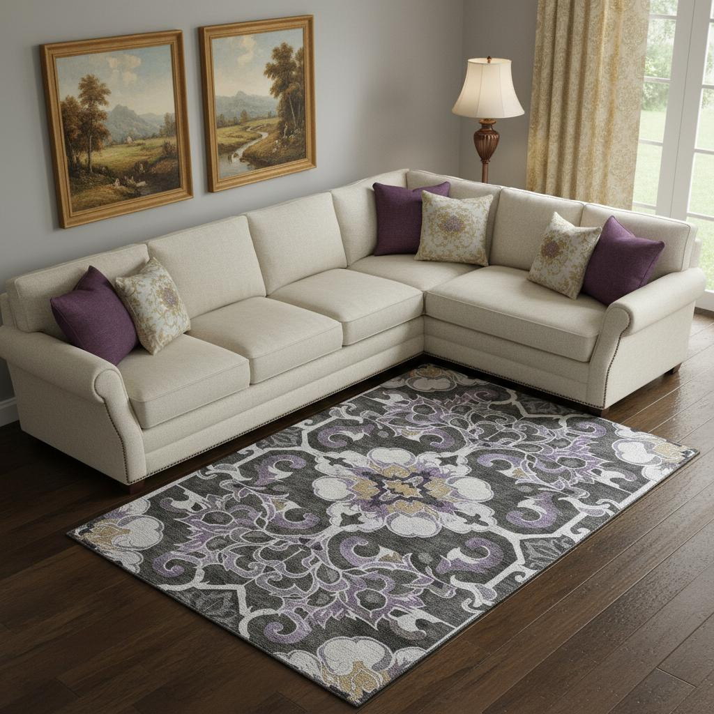 Add great coloration and comfortable texture to your space with this 10-foot x 14-foot purple ivory and charcoal floral medallion washable area rug with uv protection. Ideal for spaces with kids and pets, this rug is stain resistant to help repel dirt and spilled liquids. Built to last, this rug crafted from polyester fibers is known for its durability and long lasting appeal. Rugs are a great way to showcase your style, hide imperfections, warm your home and reduce noise. This larger sized, traditional styled rug is ready to create a focal point or statement piece in your room. 120.00-inch h x 168.00-inch w x 0.39-inch d.