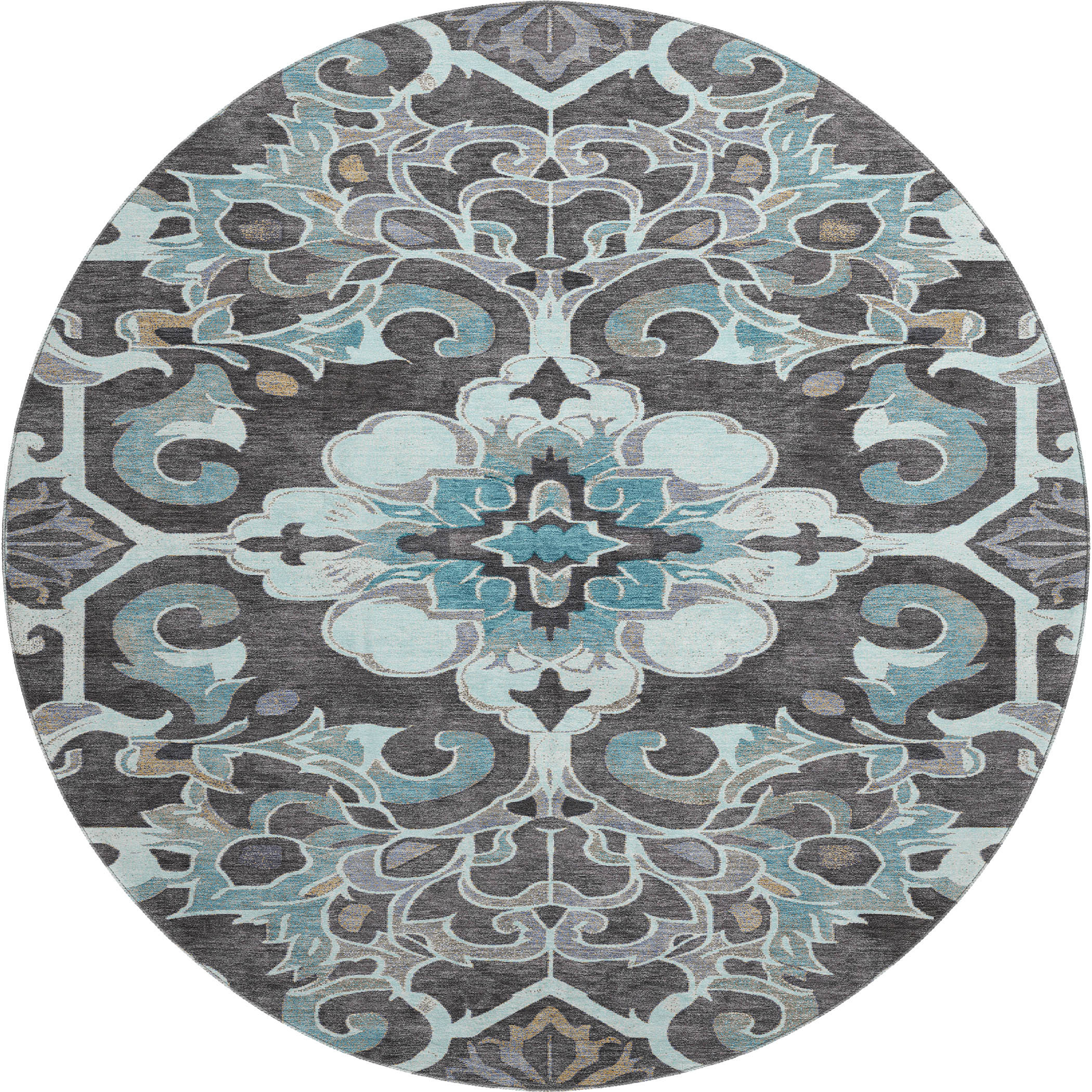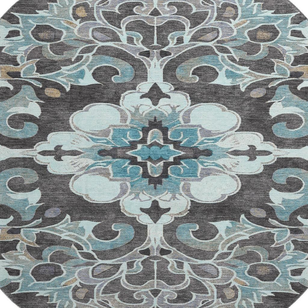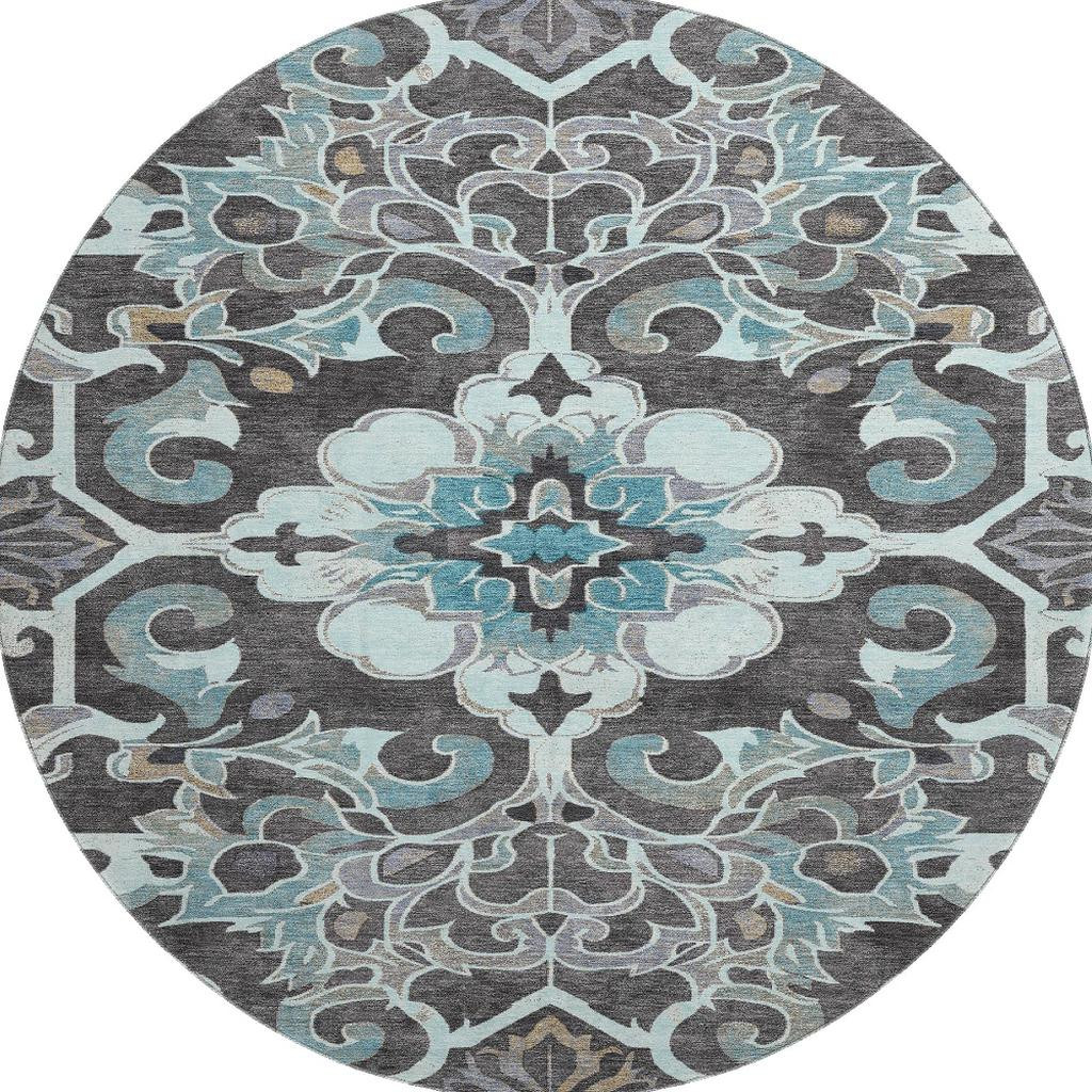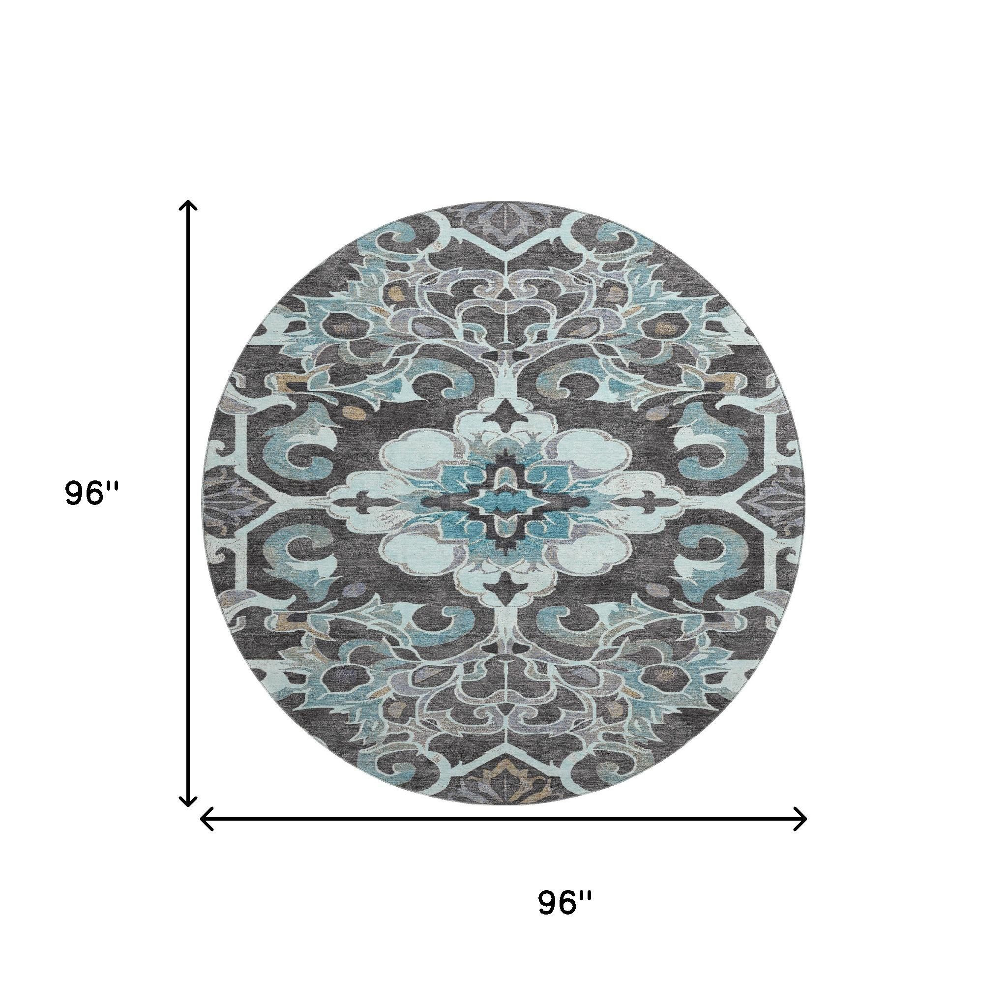 This 8-foot teal charcoal and gray floral medallion washable round rug with uv protection, is a great way to add warmth to a room. Ideal for spaces with kids and pets, this rug is stain resistant to help repel dirt and spilled liquids. Built to last, this rug crafted from polyester fibers is known for its durability and long lasting appeal. Rugs are a great way to showcase your style, hide imperfections, warm your home and reduce noise. This larger sized, traditional styled rug is ready to create a focal point or statement piece in your room. 96.00-inch h x 96.00-inch w x 0.39-inch d.