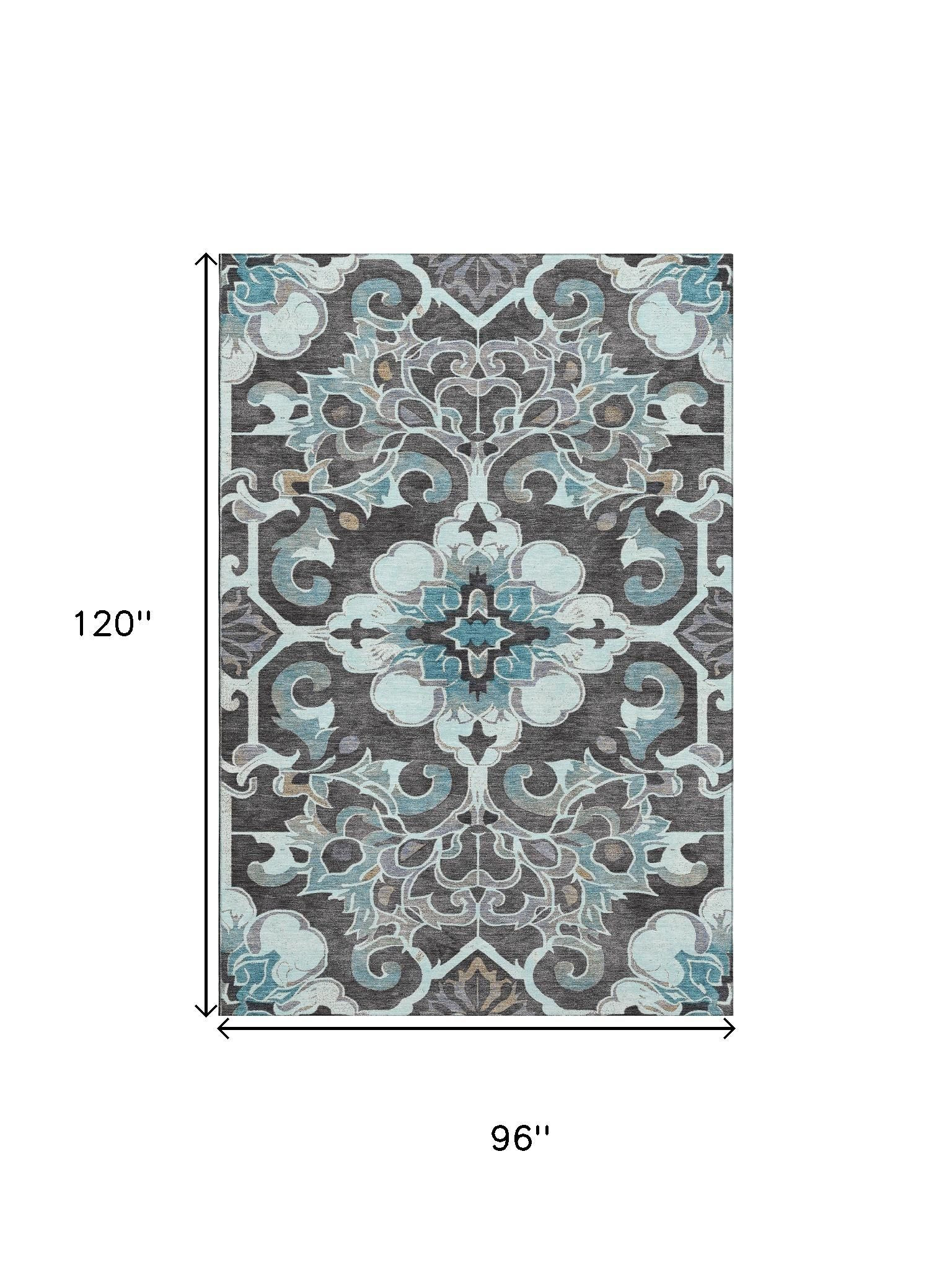 Add some artistry to your room with this 8-foot x 10-foot teal charcoal and gray floral medallion washable area rug with uv protection. Ideal for spaces with kids and pets, this rug is stain resistant to help repel dirt and spilled liquids. Built to last, this rug crafted from polyester fibers is known for its durability and long lasting appeal. Rugs are a great way to showcase your style, hide imperfections, warm your home and reduce noise. This larger sized, traditional styled rug is ready to create a focal point or statement piece in your room. 96.00-inch h x 120.00-inch w x 0.39-inch d.