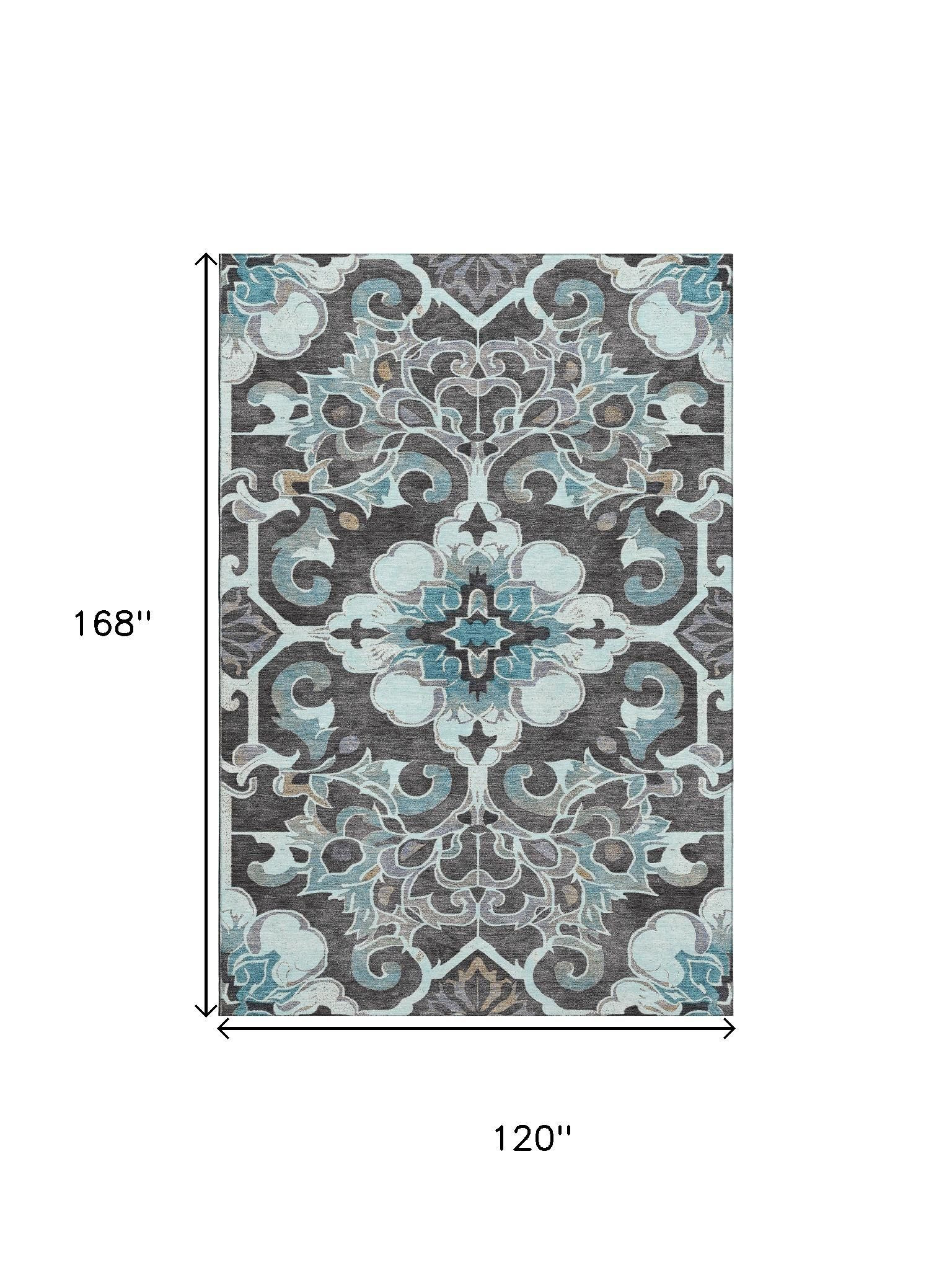 Add great coloration and comfortable texture to your space with this 10-foot x 14-foot teal charcoal and gray floral medallion washable area rug with uv protection. Ideal for spaces with kids and pets, this rug is stain resistant to help repel dirt and spilled liquids. Built to last, this rug crafted from polyester fibers is known for its durability and long lasting appeal. Rugs are a great way to showcase your style, hide imperfections, warm your home and reduce noise. This larger sized, traditional styled rug is ready to create a focal point or statement piece in your room. 120.00-inch h x 168.00-inch w x 0.39-inch d.