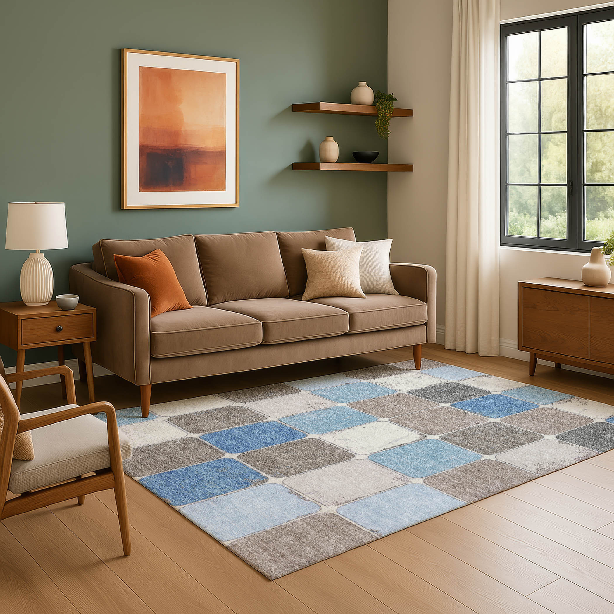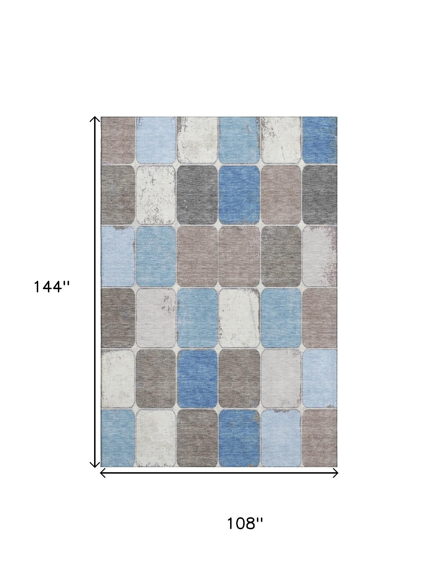 Add some artistry to your room with this 9-foot x 12-foot blue ivory and taupe geometric washable area rug with uv protection. Ideal for spaces with kids and pets, this rug is stain resistant to help repel dirt and spilled liquids. Built to last, this rug crafted from polyester fibers is known for its durability and long lasting appeal. Rugs are a great way to showcase your style, hide imperfections, warm your home and reduce noise. This larger sized, transitional styled rug is ready to create a focal point or statement piece in your room. 108.00-inch h x 144.00-inch w x 0.39-inch d.