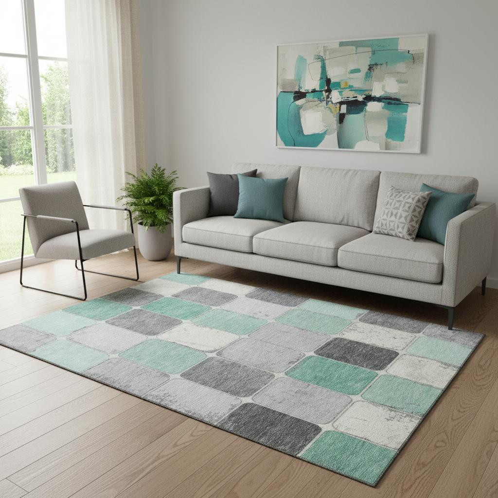 Add some artistry to your room with this 5-foot x 8-foot mint green ivory and gray geometric washable area rug with uv protection. Ideal for spaces with kids and pets, this rug is stain resistant to help repel dirt and spilled liquids. Built to last, this rug crafted from polyester fibers is known for its durability and long lasting appeal. Rugs are a great way to showcase your style, hide imperfections, warm your home and reduce noise. This larger sized, transitional styled rug is ready to create a focal point or statement piece in your room. 60.00-inch h x 90.00-inch w x 0.39-inch d.