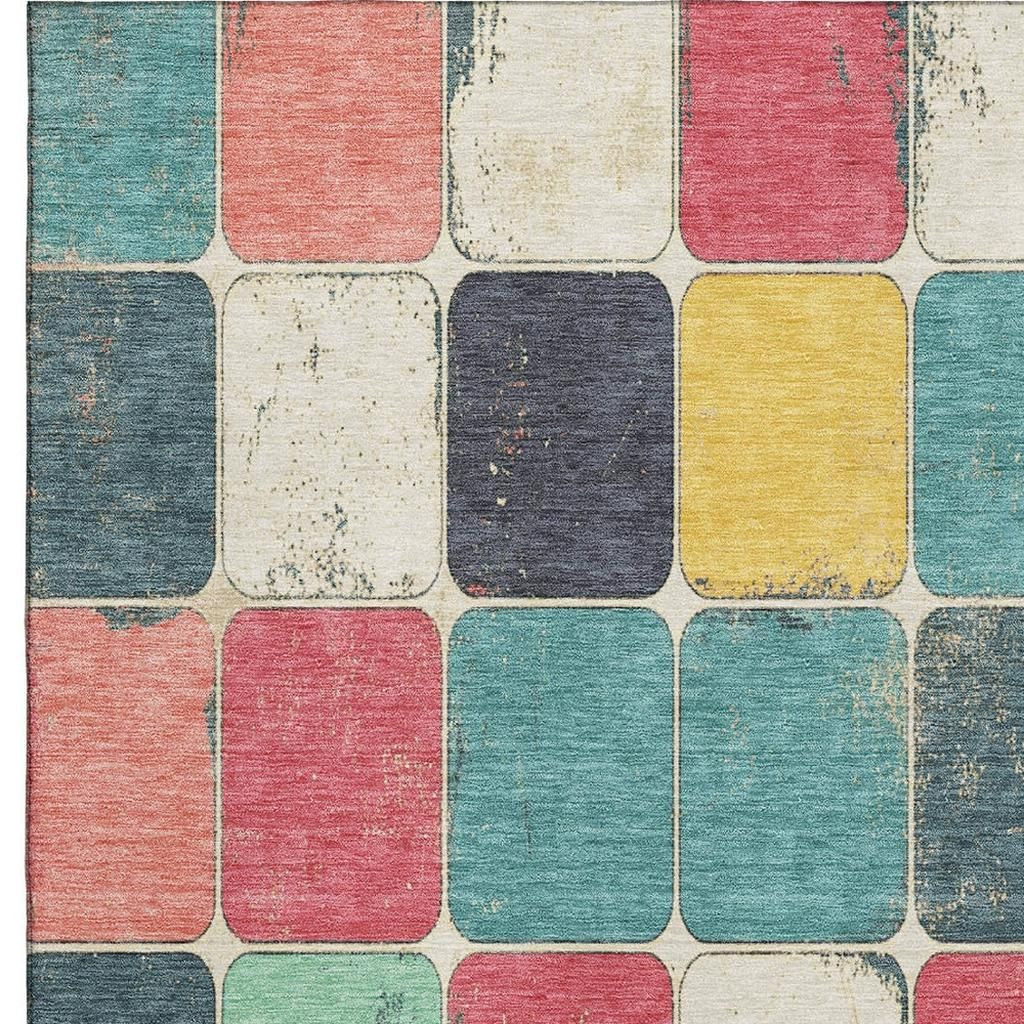This 3-foot x 5-foot teal blush and yellow geometric washable area rug with uv protection, is a great way to add warmth to a room. Ideal for spaces with kids and pets, this rug is stain resistant to help repel dirt and spilled liquids. Built to last, this rug crafted from polyester fibers is known for its durability and long lasting appeal. Rugs are a great way to showcase your style, hide imperfections, warm your home and reduce noise. This smaller sized, transitional styled rug is just what you need for your walkway, bedside, in front of door, cabinet, refrigerator, or chair. 36.00-inch h x 60.00-inch w x 0.39-inch d.