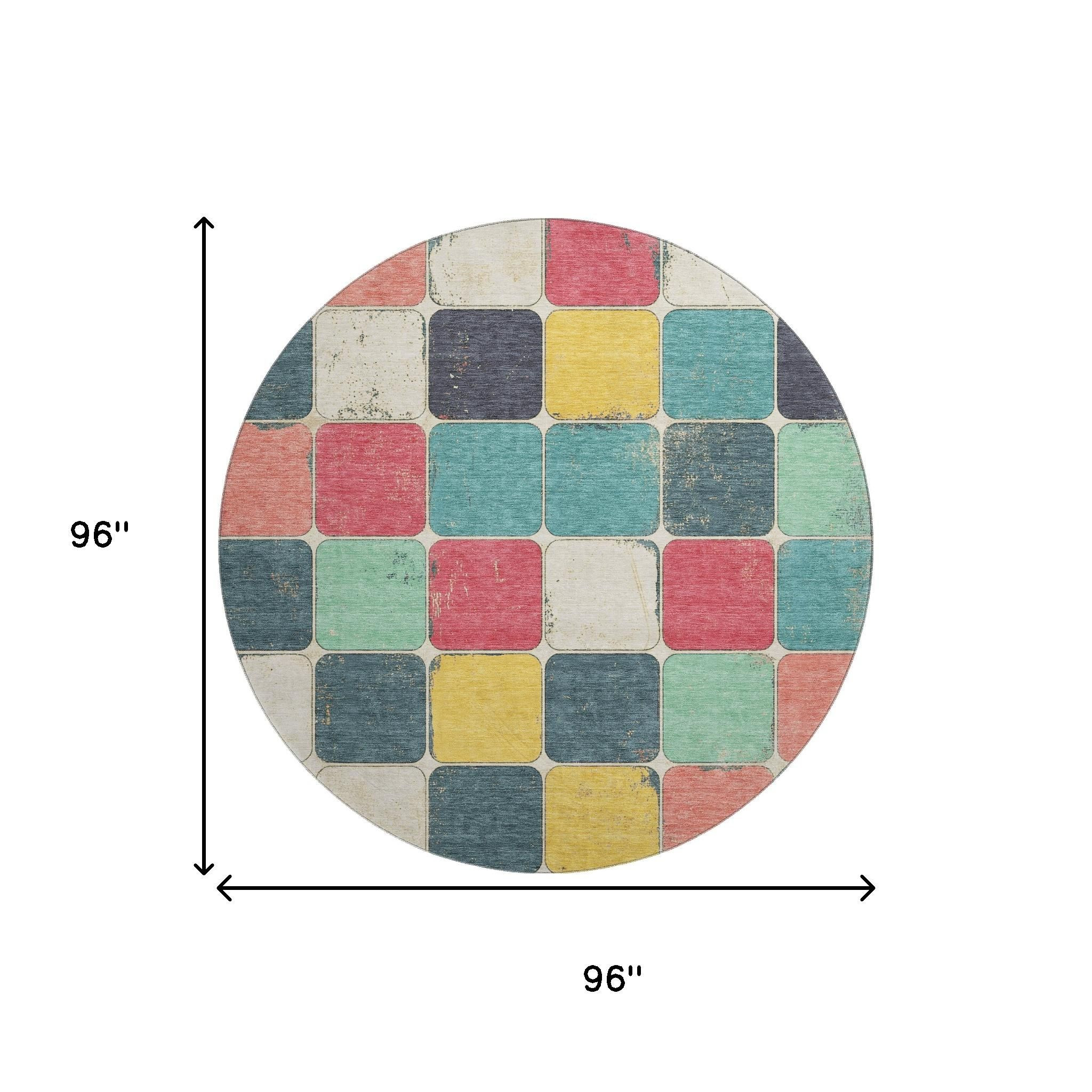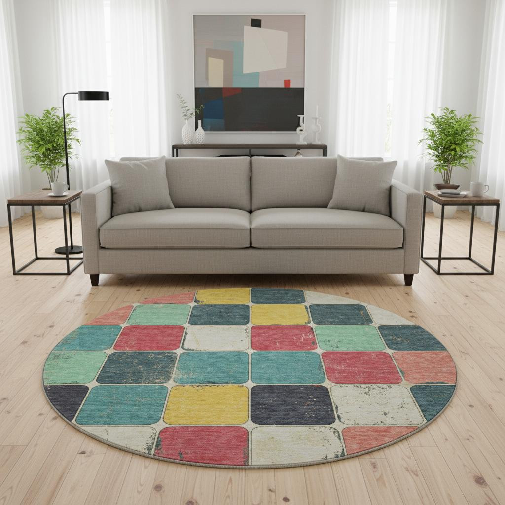 Add great coloration and comfortable texture to your space with this 8-foot teal blush and yellow geometric washable round rug with uv protection. Ideal for spaces with kids and pets, this rug is stain resistant to help repel dirt and spilled liquids. Built to last, this rug crafted from polyester fibers is known for its durability and long lasting appeal. Rugs are a great way to showcase your style, hide imperfections, warm your home and reduce noise. This larger sized, transitional styled rug is ready to create a focal point or statement piece in your room. 96.00-inch h x 96.00-inch w x 0.39-inch d.