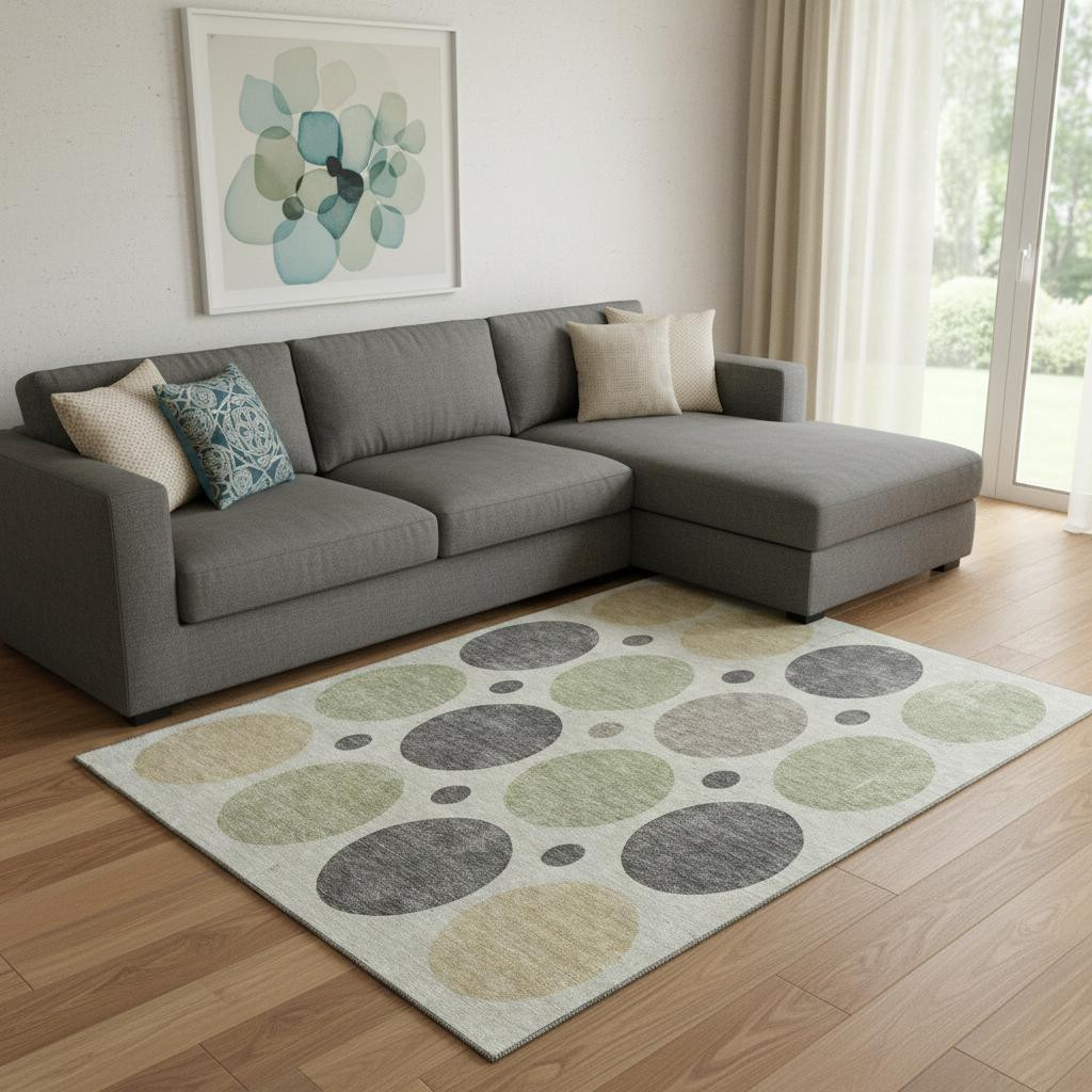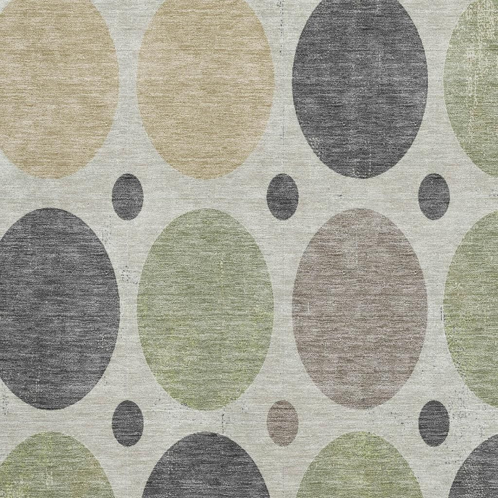 Add some artistry to your room with this 8-foot x 10-foot beige charcoal and green geometric washable area rug with uv protection. Ideal for spaces with kids and pets, this rug is stain resistant to help repel dirt and spilled liquids. Built to last, this rug crafted from polyester fibers is known for its durability and long lasting appeal. Rugs are a great way to showcase your style, hide imperfections, warm your home and reduce noise. This larger sized, transitional styled rug is ready to create a focal point or statement piece in your room. 96.00-inch h x 120.00-inch w x 0.39-inch d.